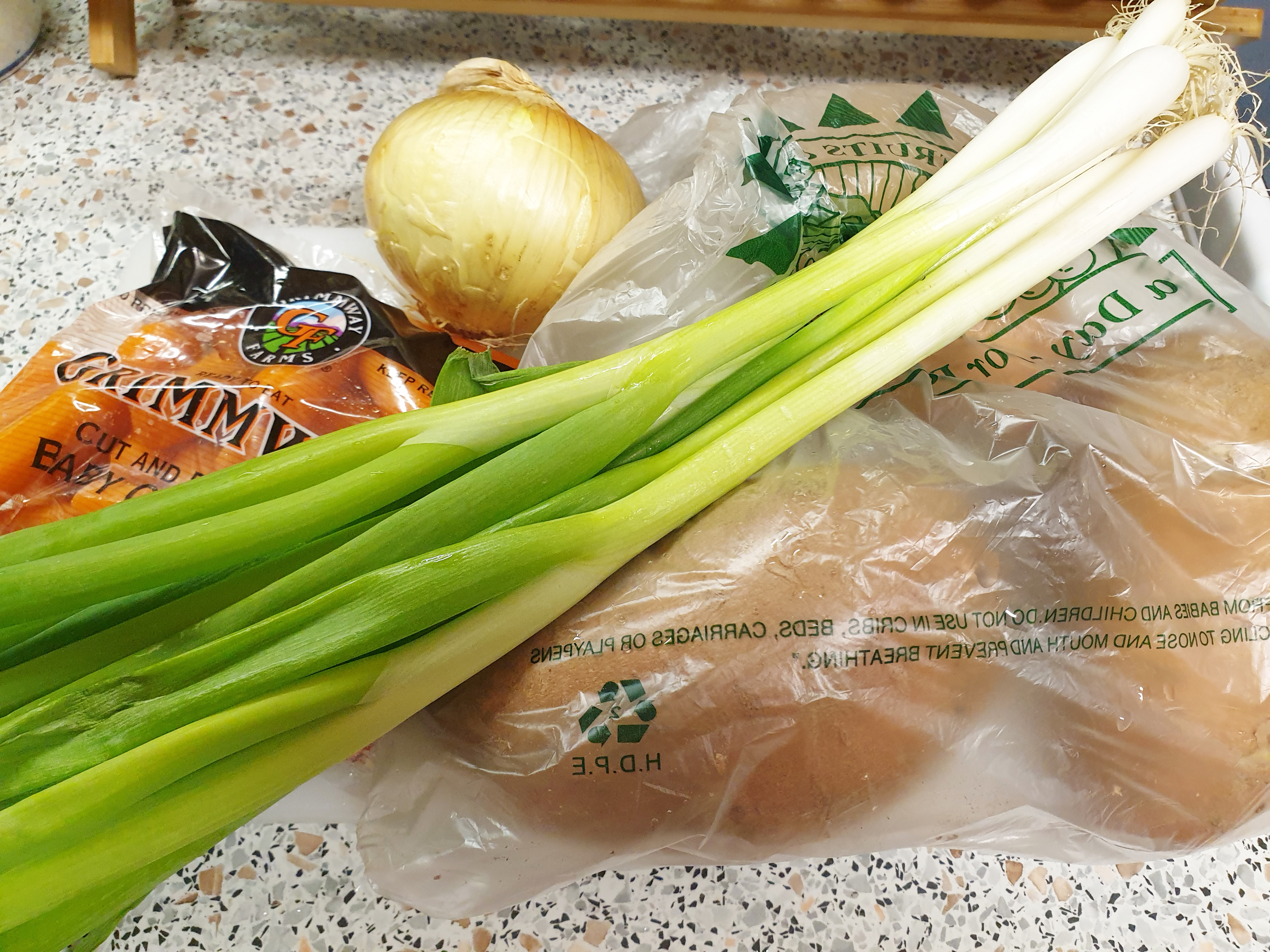 4~5인분 기준으로 당근 2개 정도의 양, 양파 1 , 파 2 , 고구마 2를 준비했어요! 감자 대신 고구마를 넣은 이유는 맛을 더 달게 하기 위해서고 개인적으로 감자보다는 고구마를 넣었을 때가 더 맛있더라고요~!