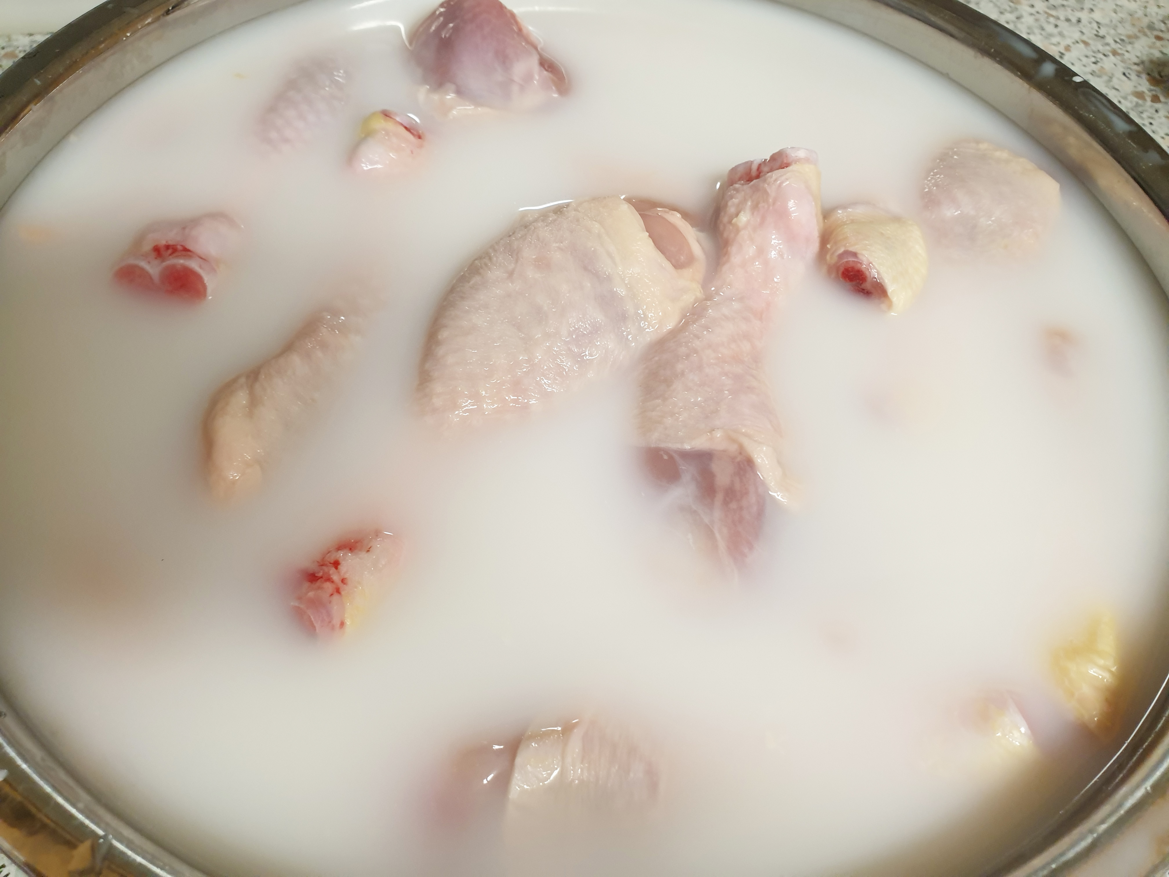 1. 가장 먼저 닭을 부드럽게 하고 잡내를 잡기 위해서 믹싱볼에 닭을 넣고 물을 닭이 완전히 잠기기 전까지 부어주고 우유 200ml를 부어 줍니다. 2시간 이상 기다려주세요~(전 닭 2kg를 준비했습니다. 4~5인분의 양)