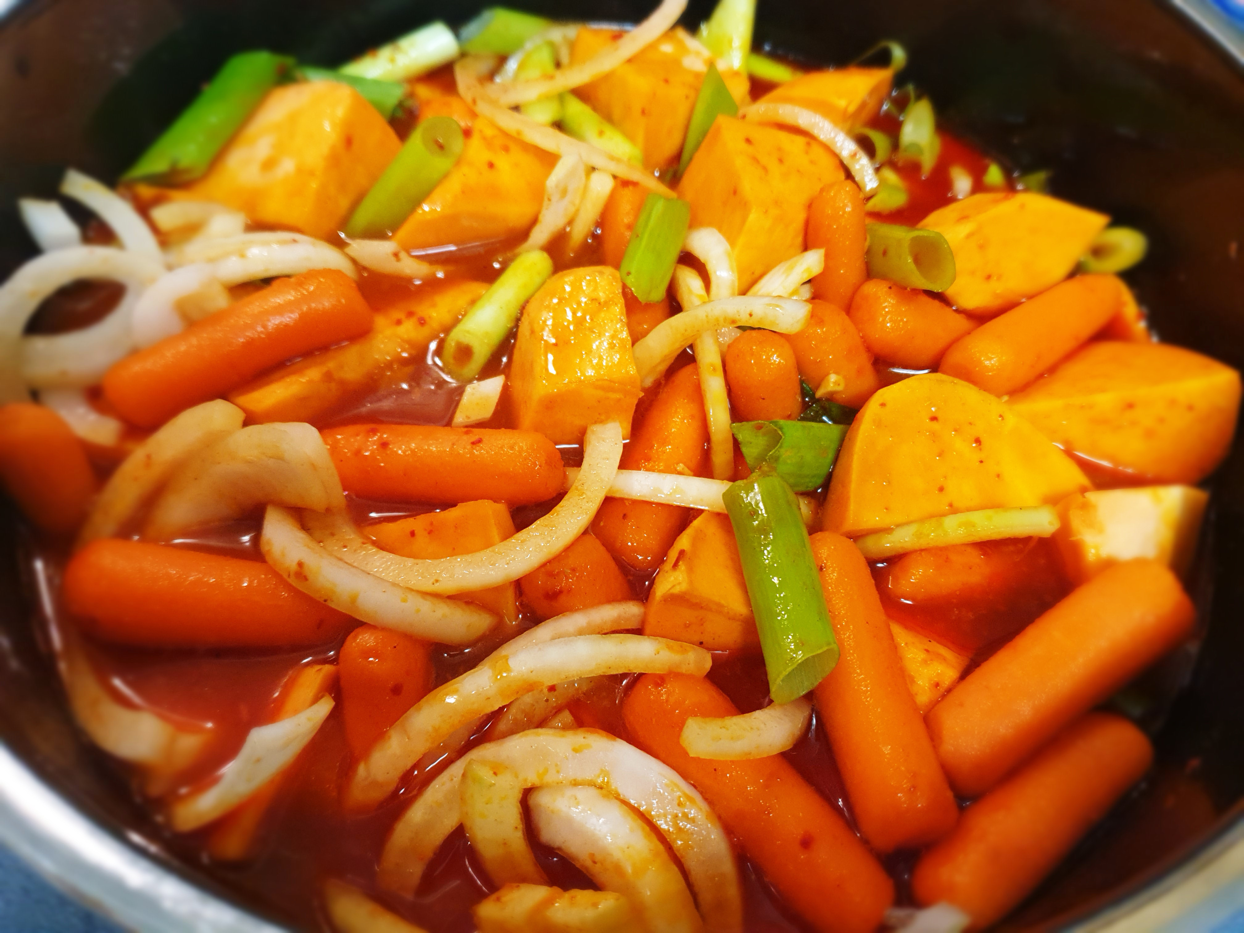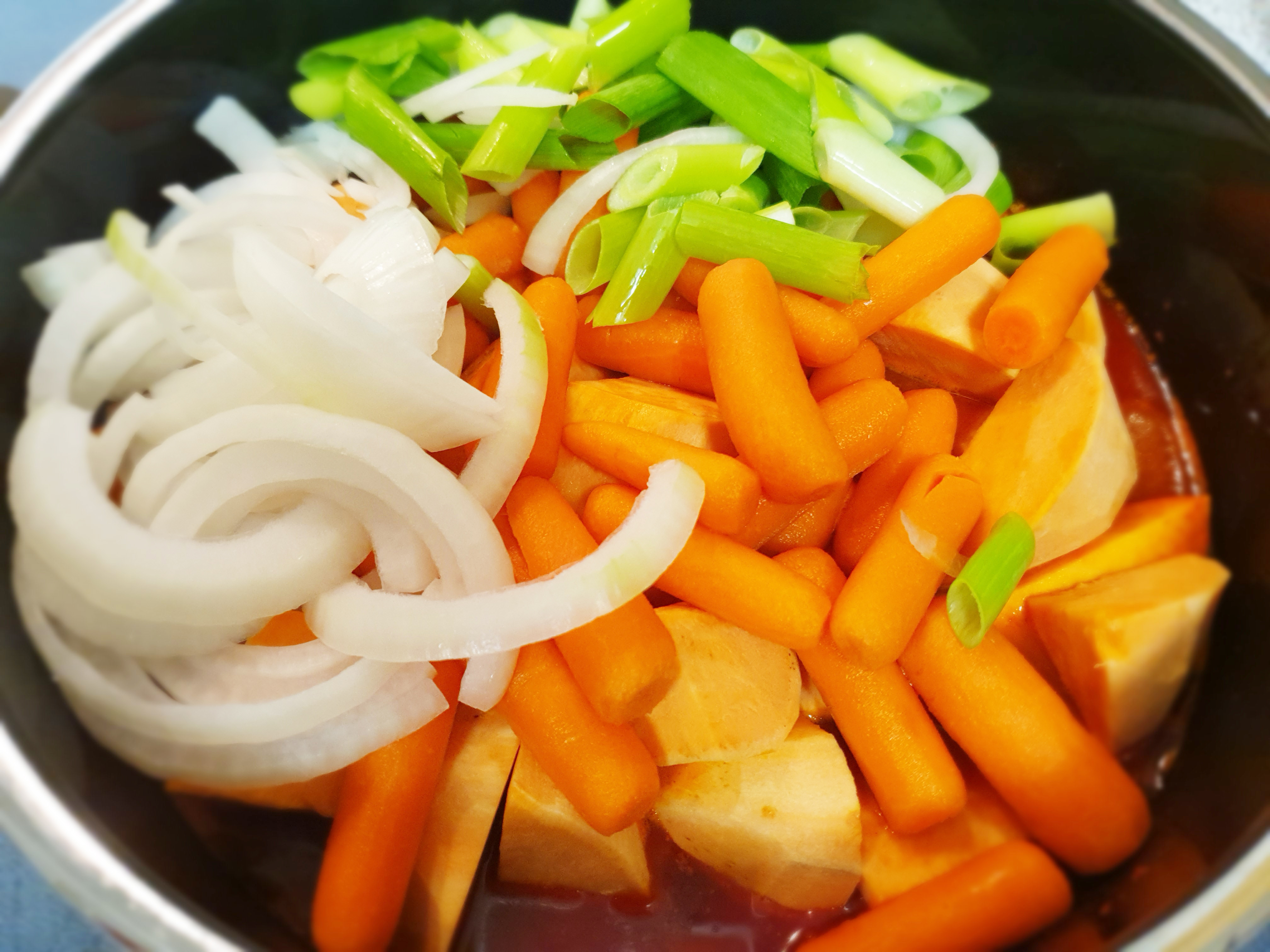 8. 고구마(또는 감자) 당근이 익을 때까지 끓여주면 끝! 전 거의 요리가 다될 때쯤 양파와 파를 더 넣어줬어요. 이 부분은 생략해주셔도 돼요!