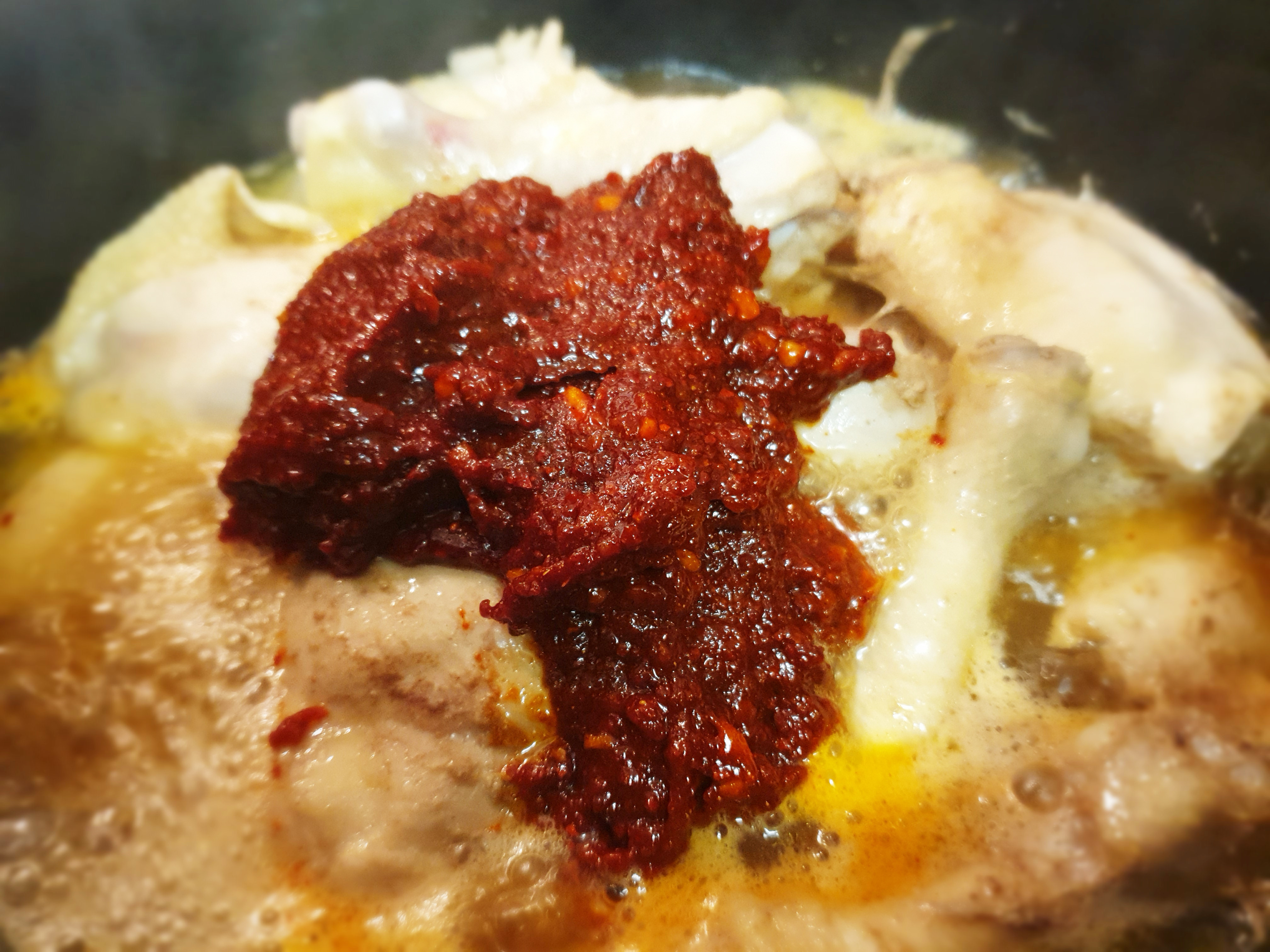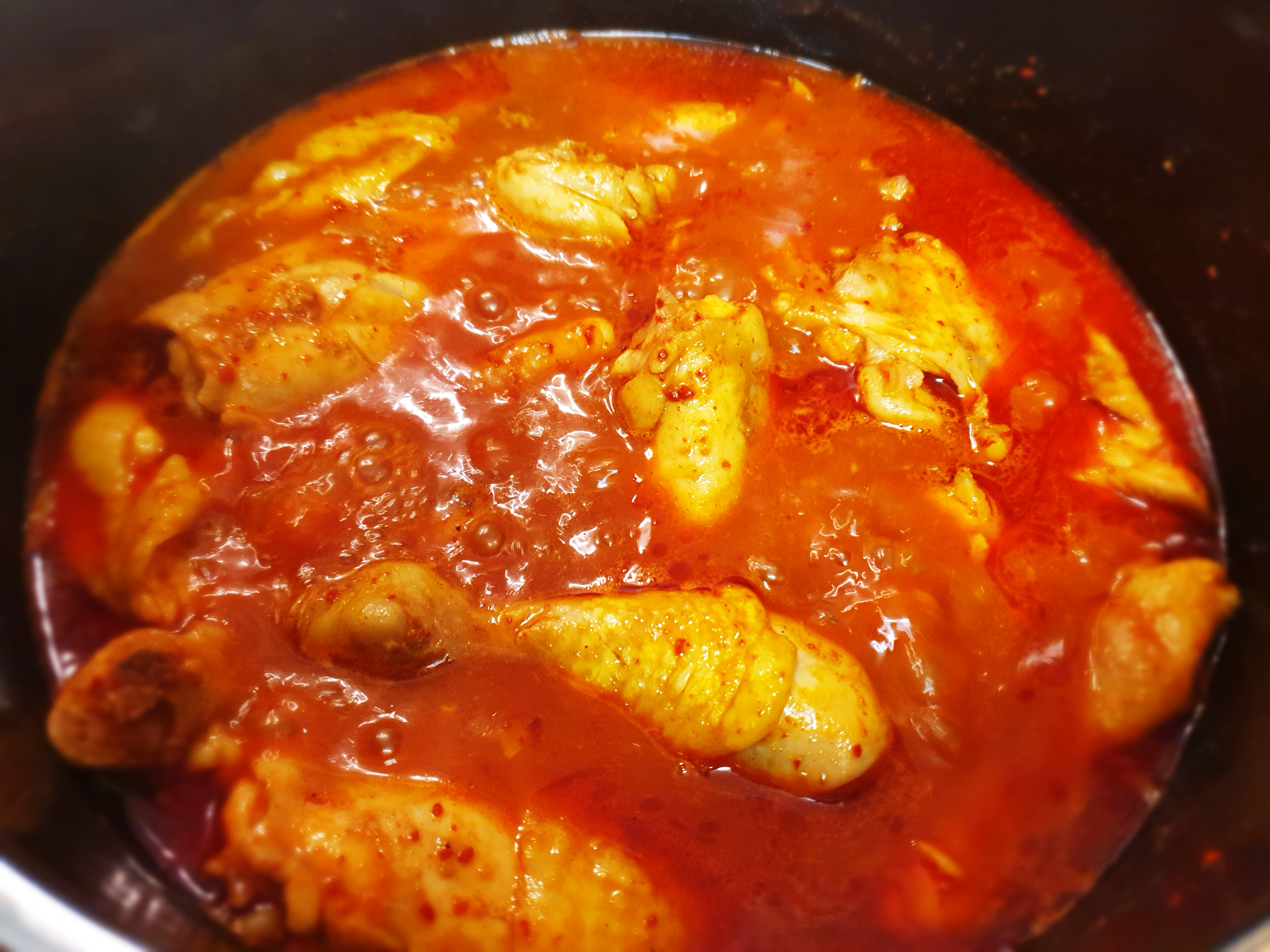 6. 양념장을 넣고 닭에 양념장 간이 밸 수 있도록 중간 불보다 높게 놓고 7~10분간 끓여줍니다.