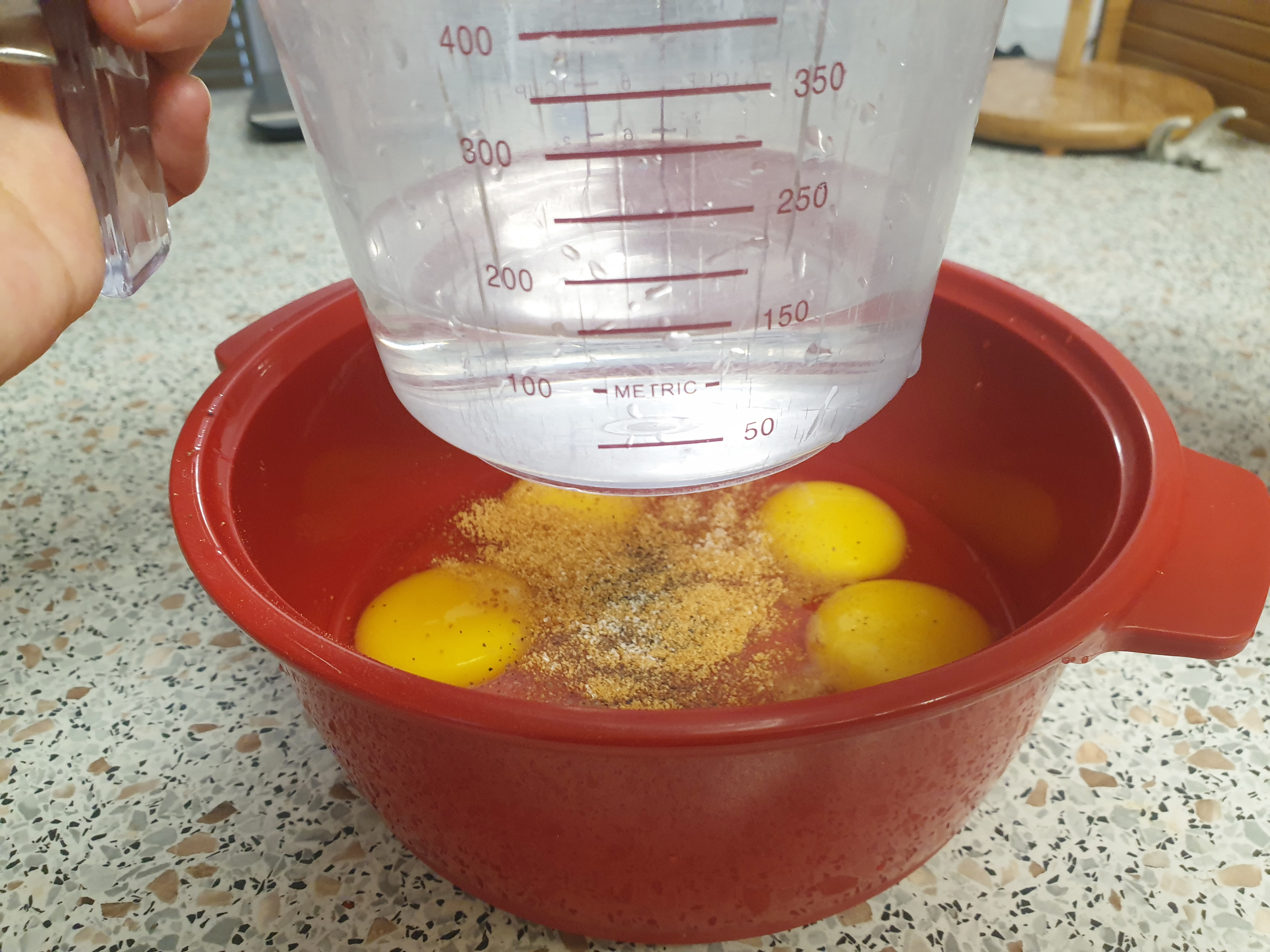 계란 5개 , 물 150ml , 소고기 다시다 티스푼1, 소금 한 꼬집, 후추를 넣어놓고 섞어주세요~ 계란이 잘 풀릴 때까지!