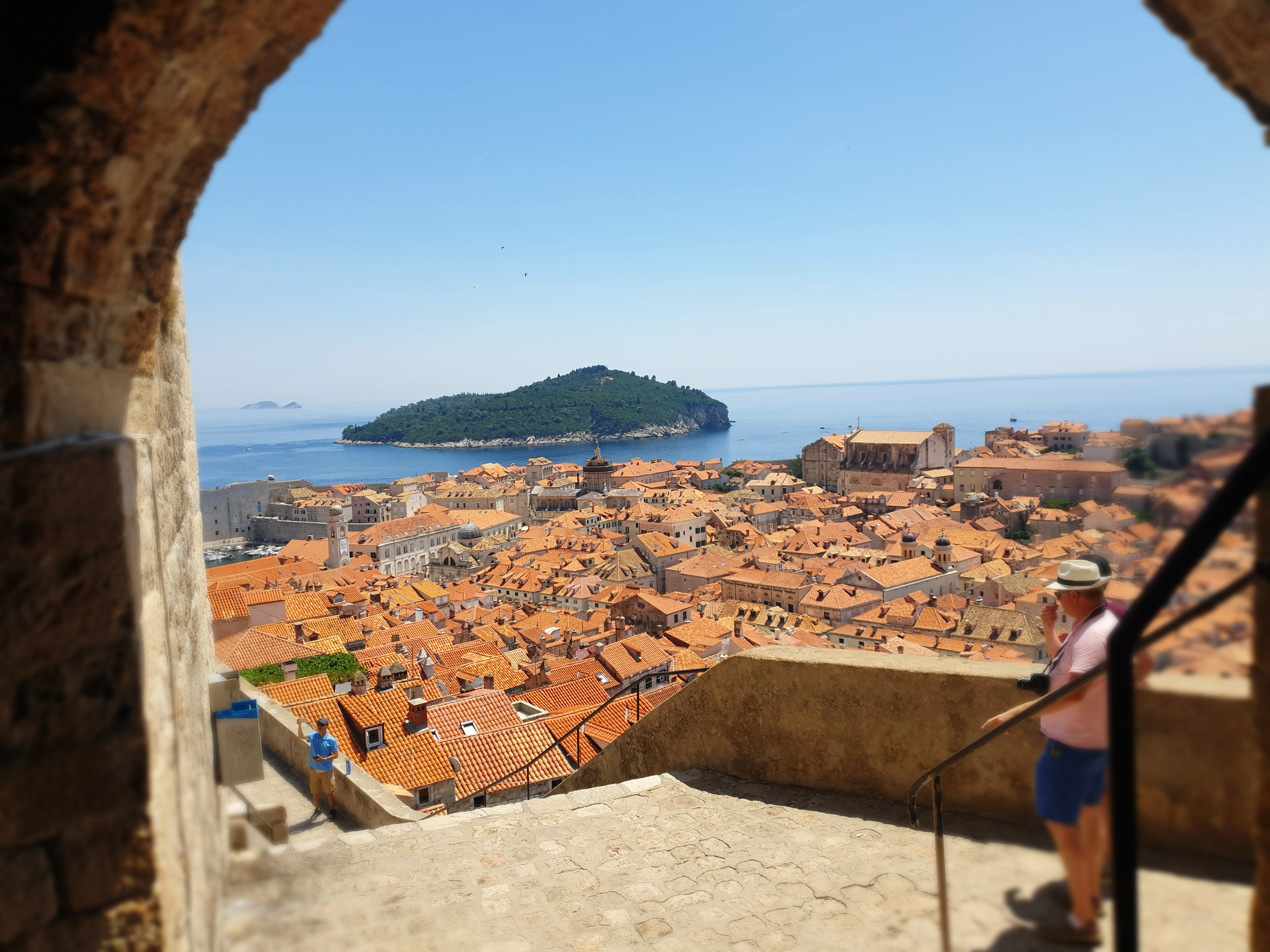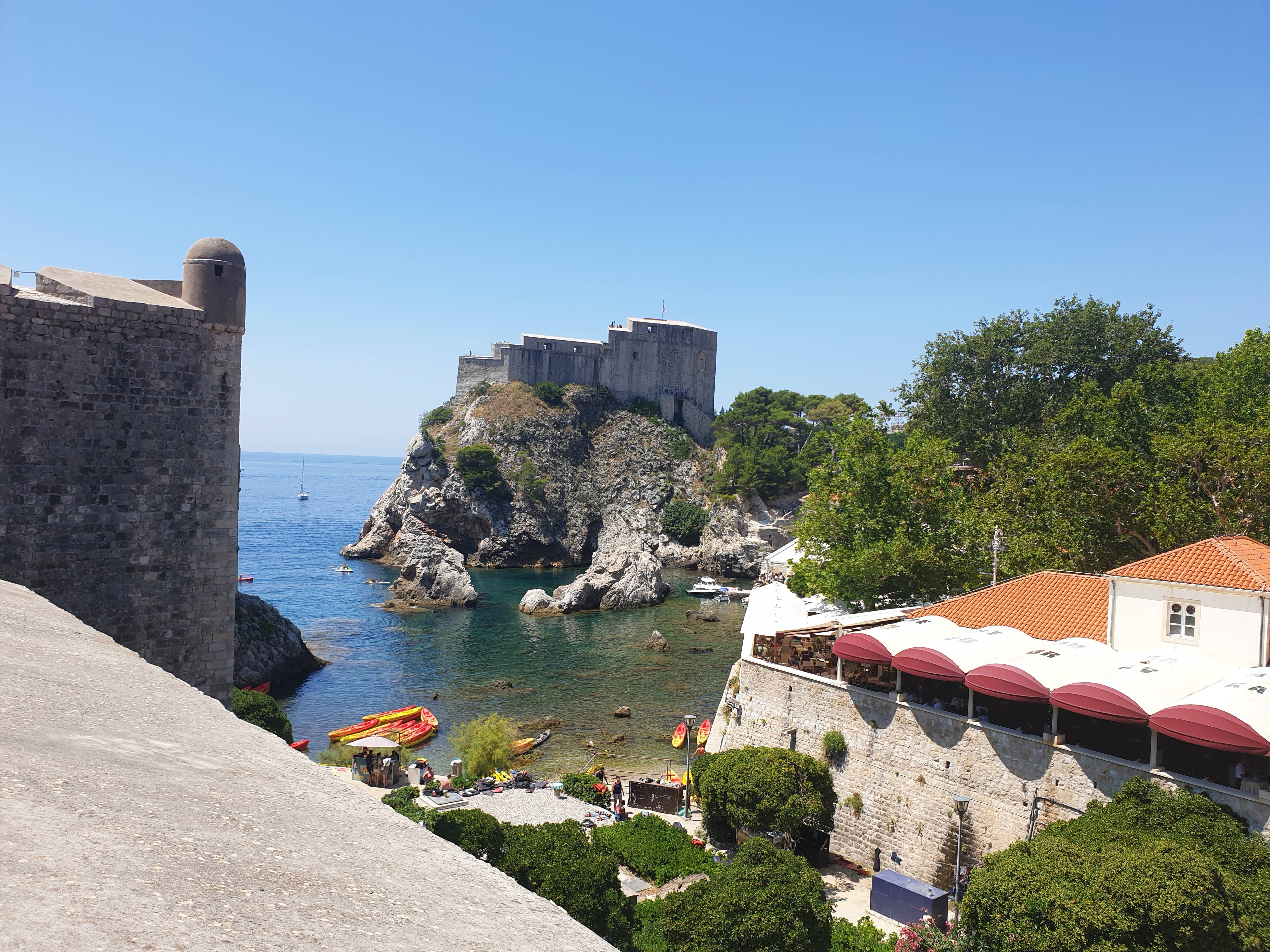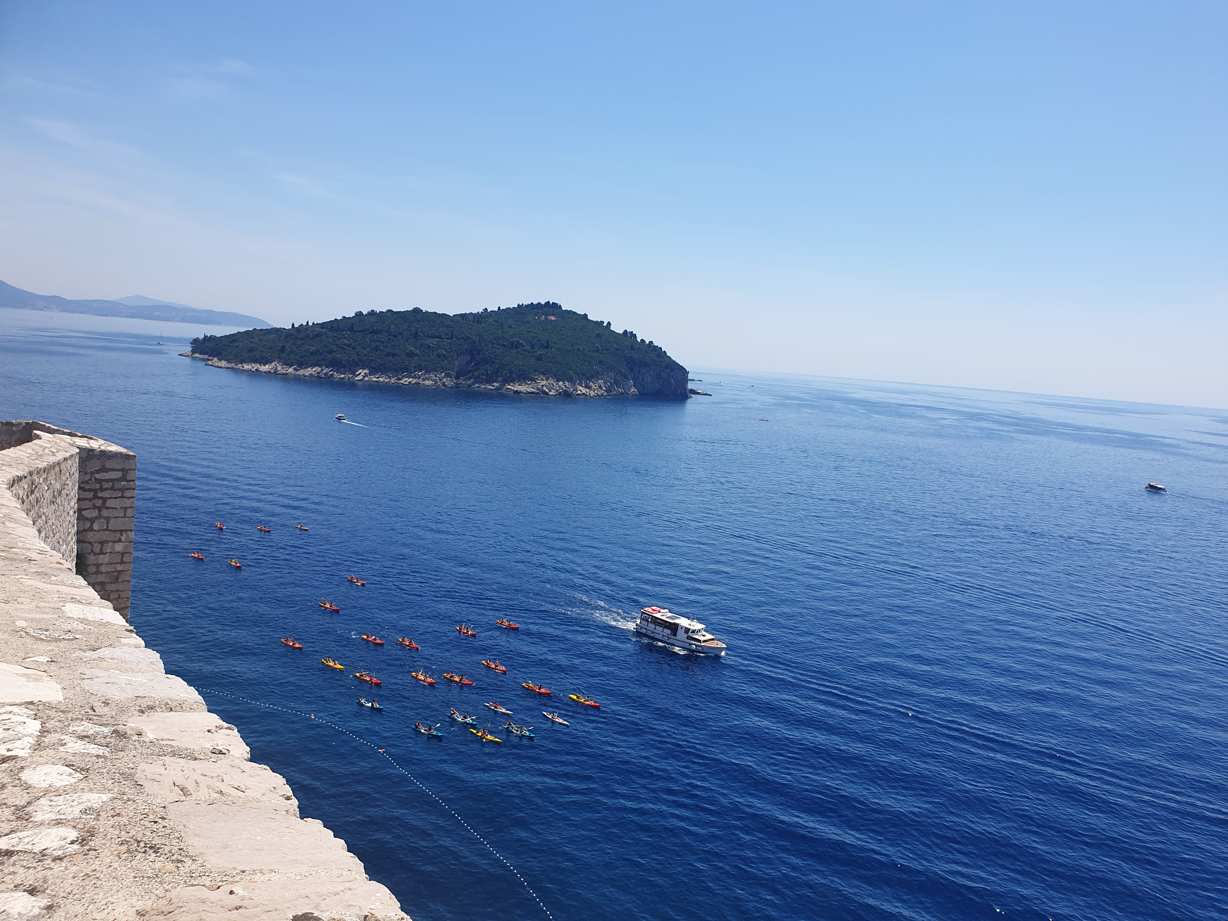 성벽 밖에 보이는 새파란 아드리아 해에서 카약 투어 하시는 분들.. 그리고 저 멀리 보이는 로크룸 섬!