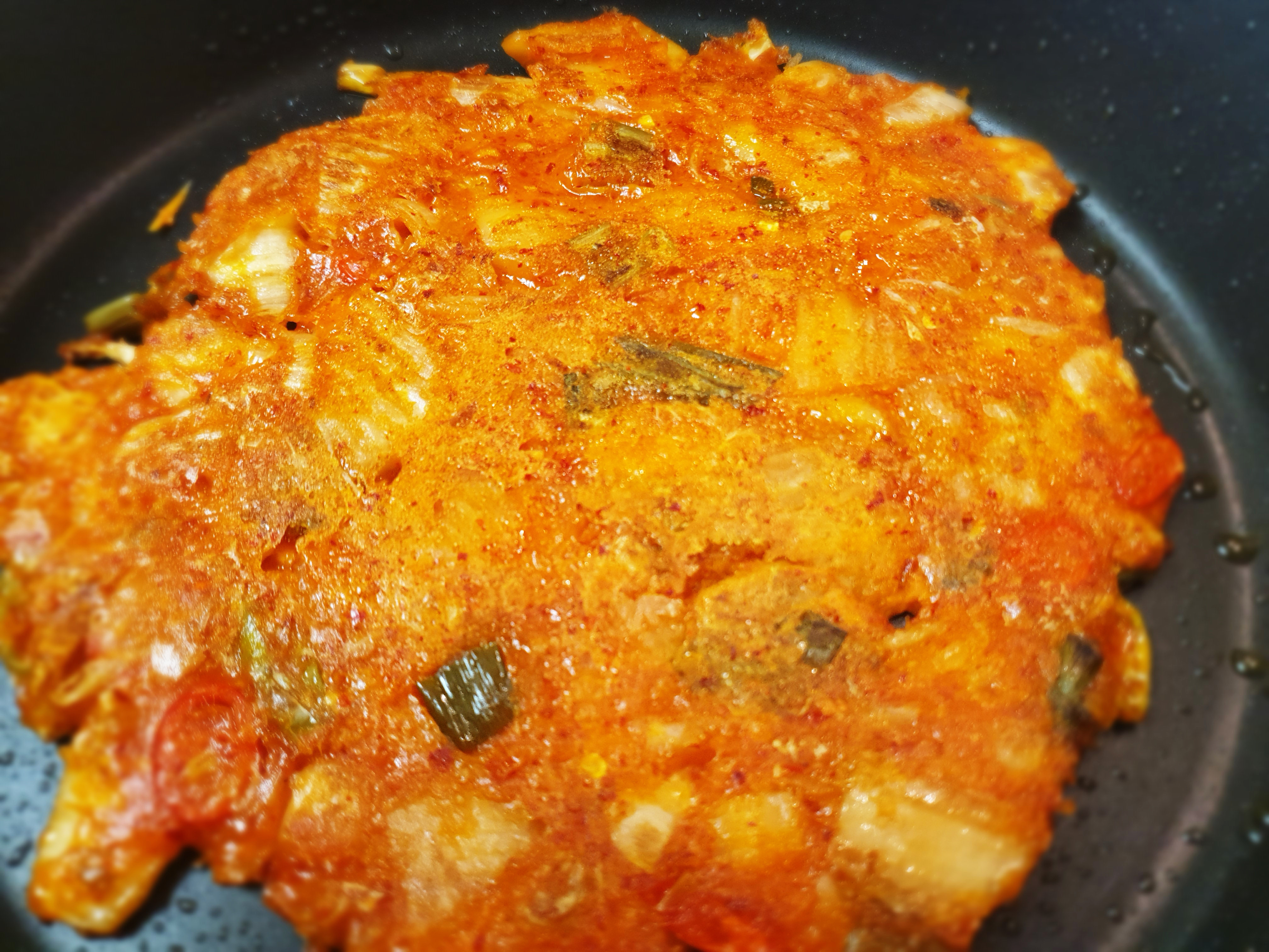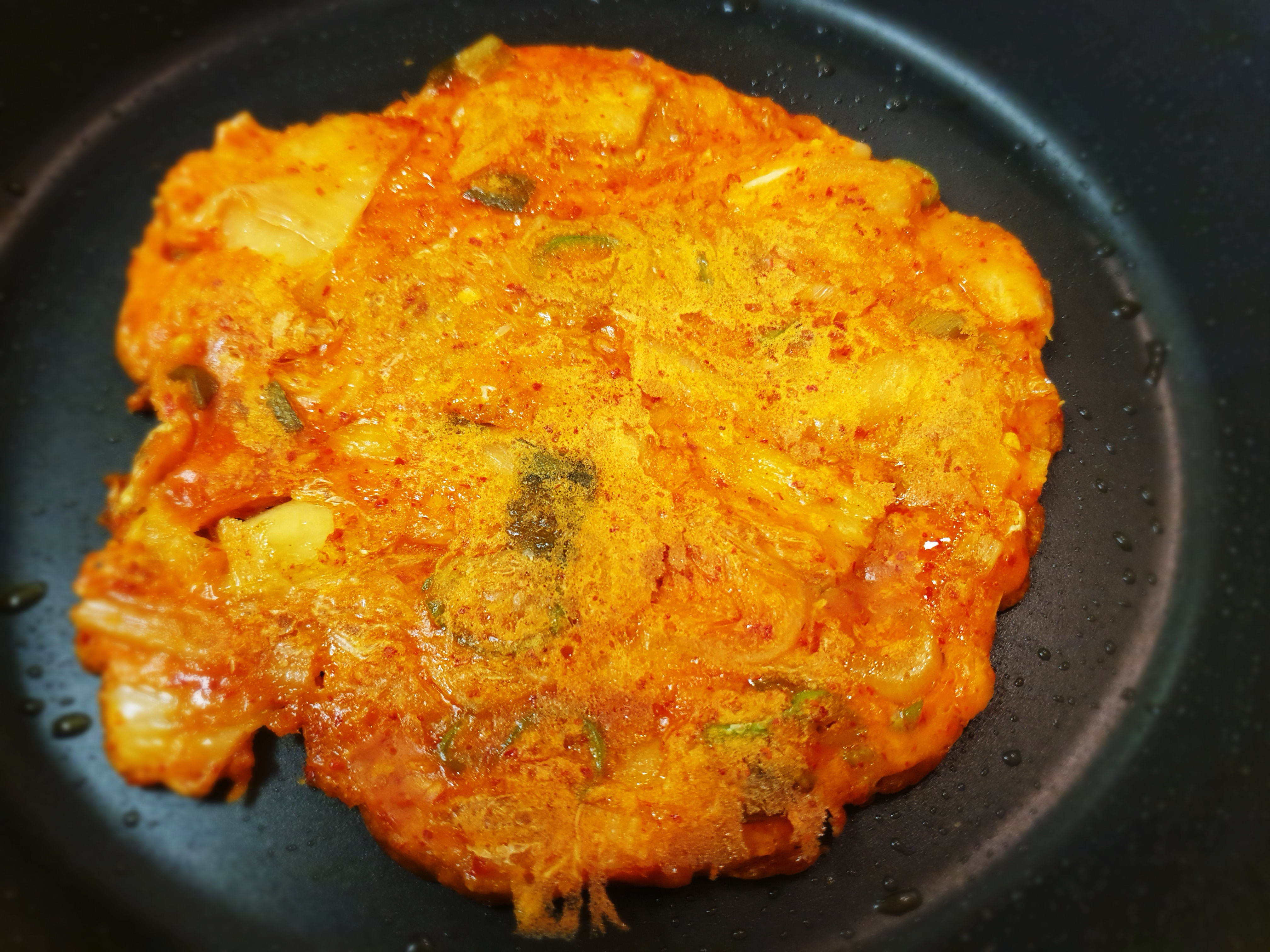기름이 달궈졌다면 만들어둔 김치전 반죽을 한국자 넣어주고 꾹꾹 눌어 모양을 잡아줍니다. 한 면이 익을 때까지 뒤집지 마세요~