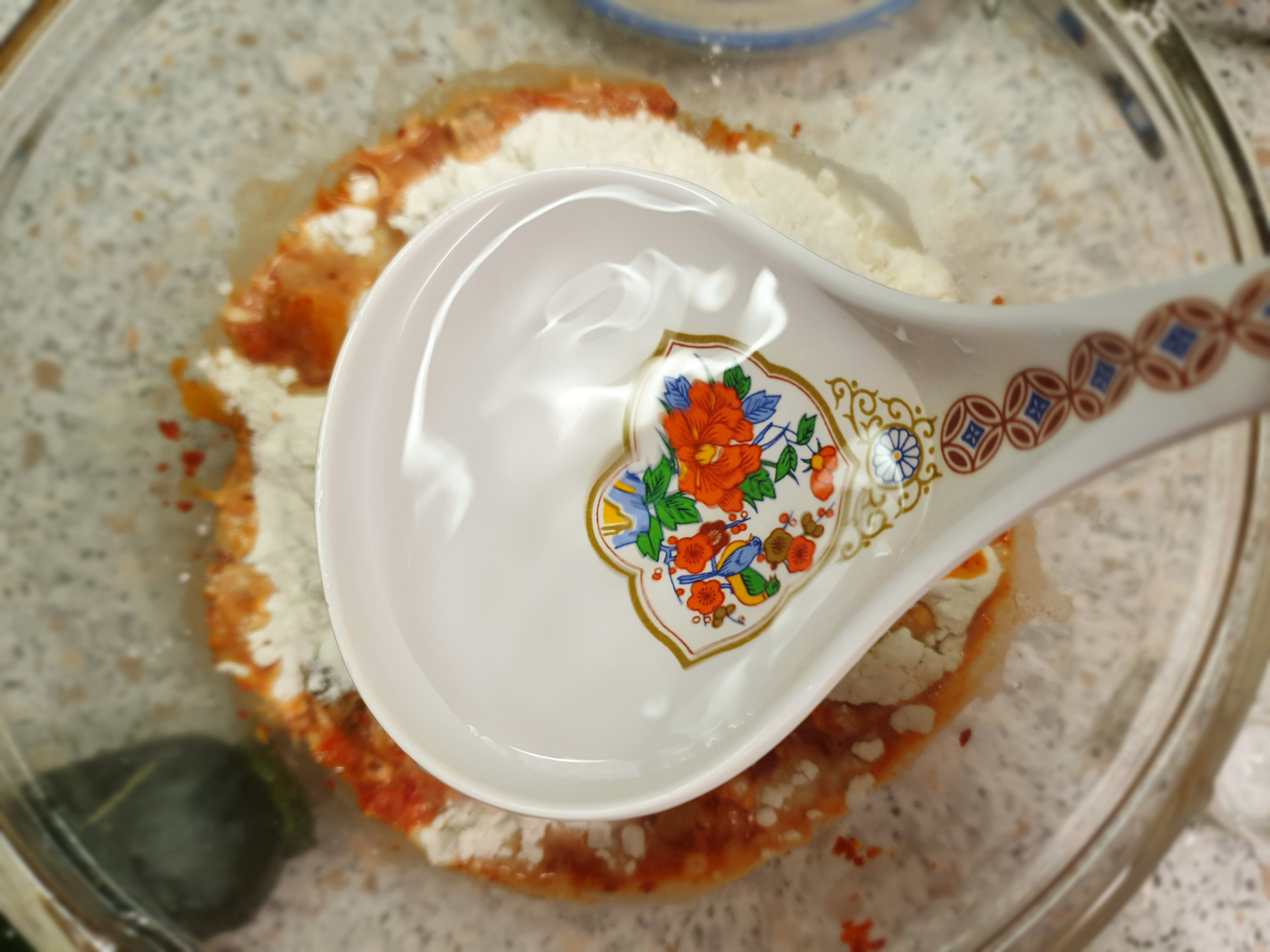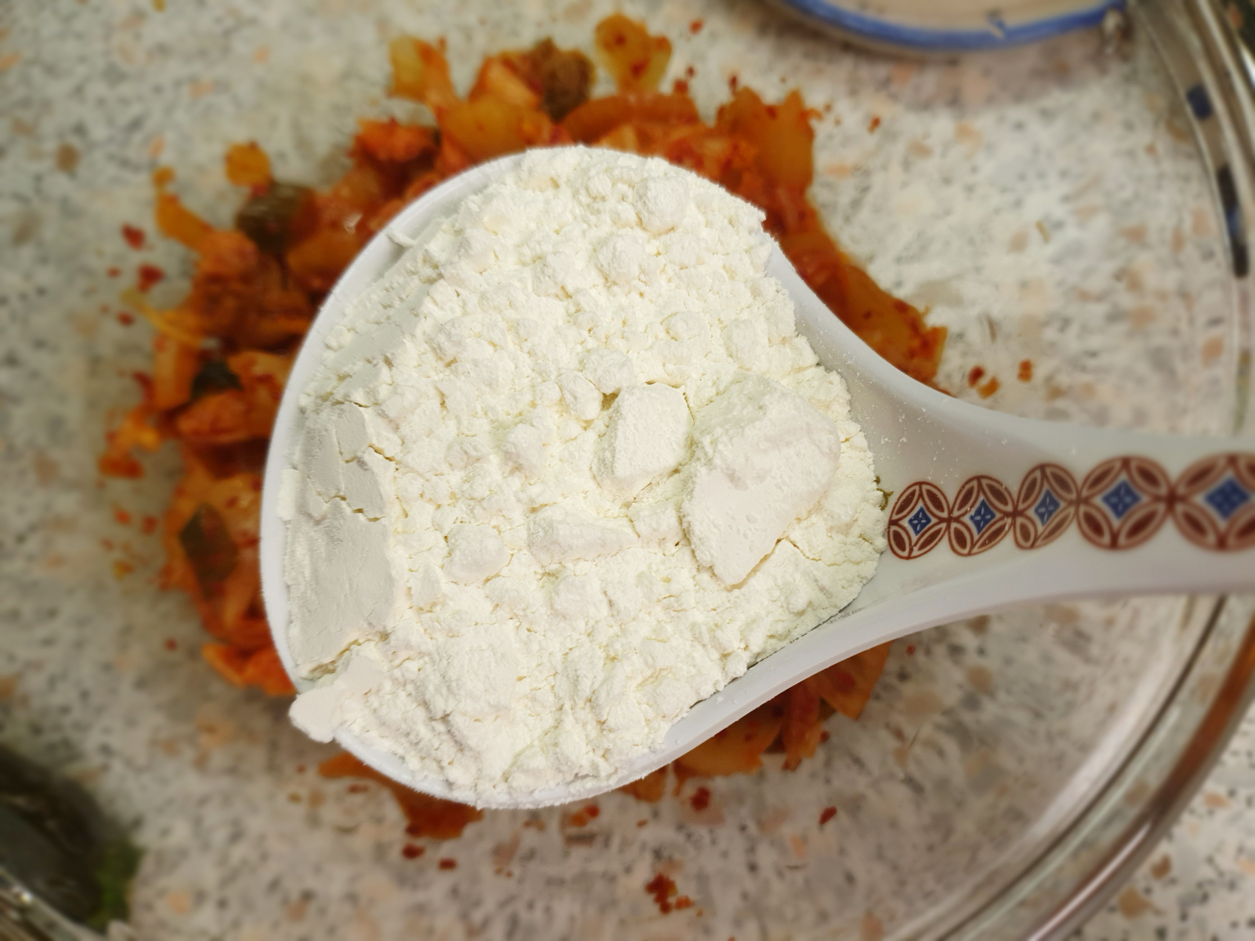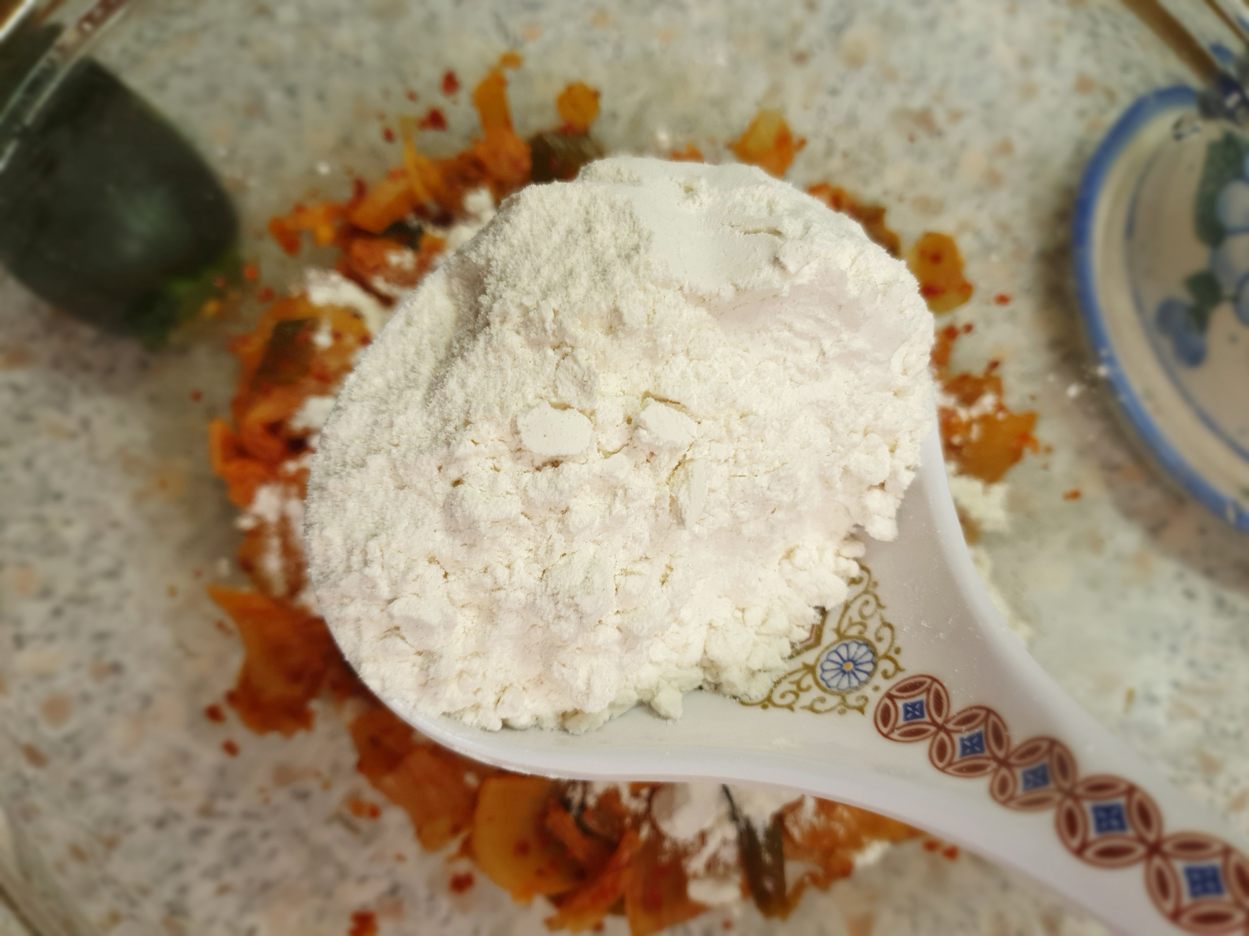 밀가루 1 국자, 부침가루 1 국자, 김치국물 1 국자, 물 2 국자,