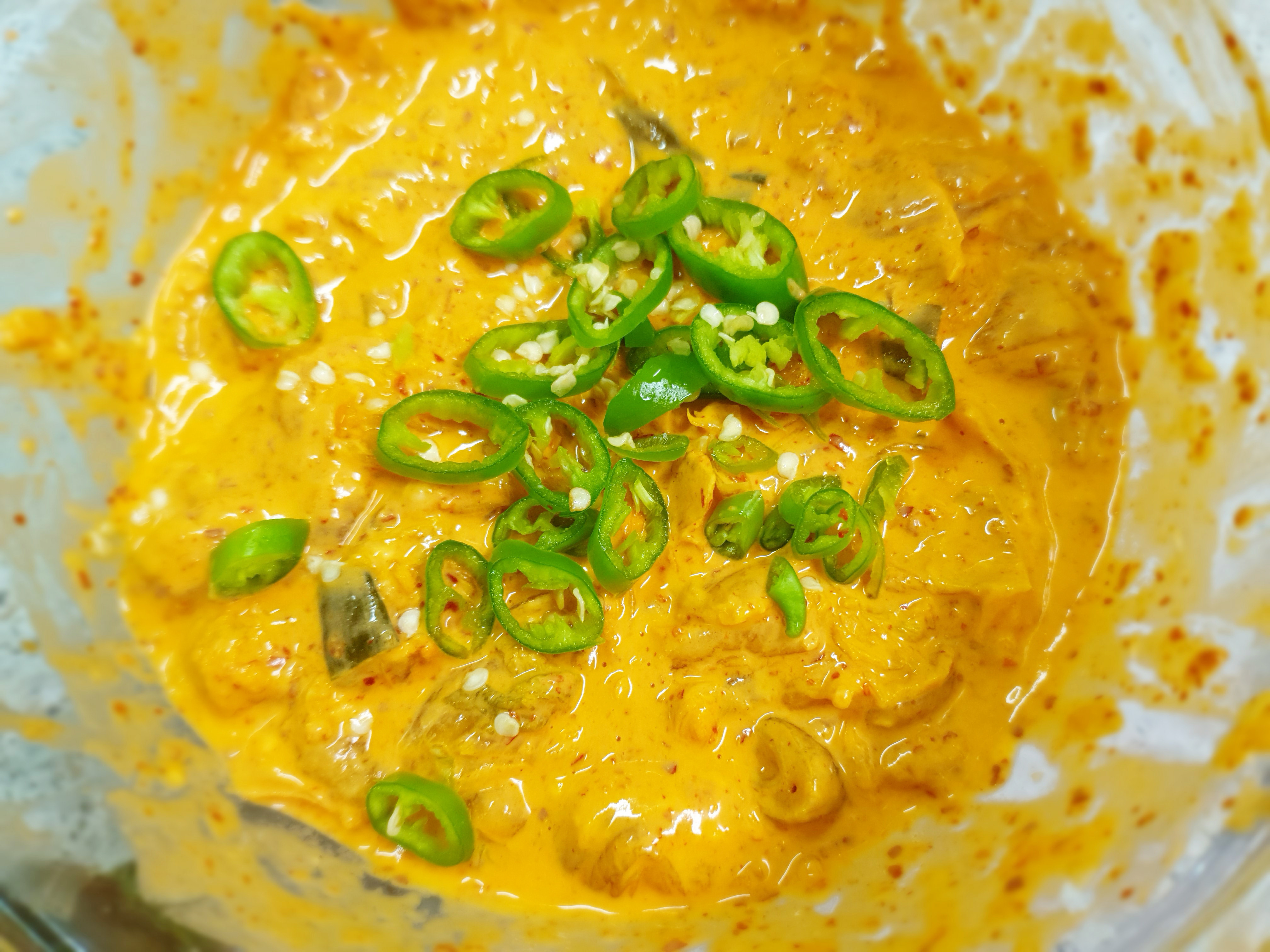 김치전 반죽이 준비 됐으면 청양고추를 썰어 넣어주세요~ 아이들과 함께 먹는다면 청양고추는 제외해주세요~!