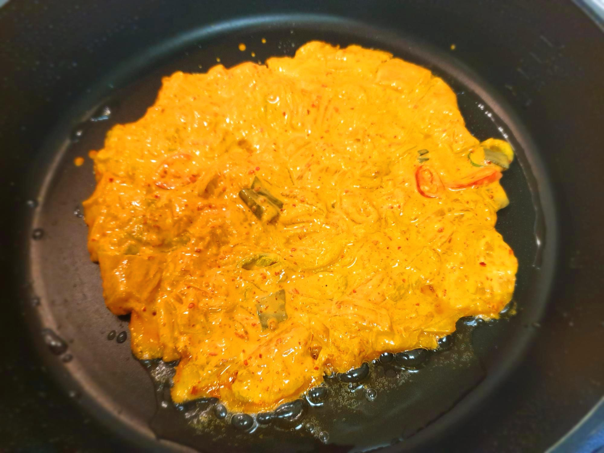 김치전 반죽이 완성됐다면 프라이팬에 식용유를 적당량을 두른 후 달궈줍니다. 바삭하게 부치기 위해서 불은 중간 불 보다 쌘 불어 두었어요~ 1~10까지 있다면 7 정도!