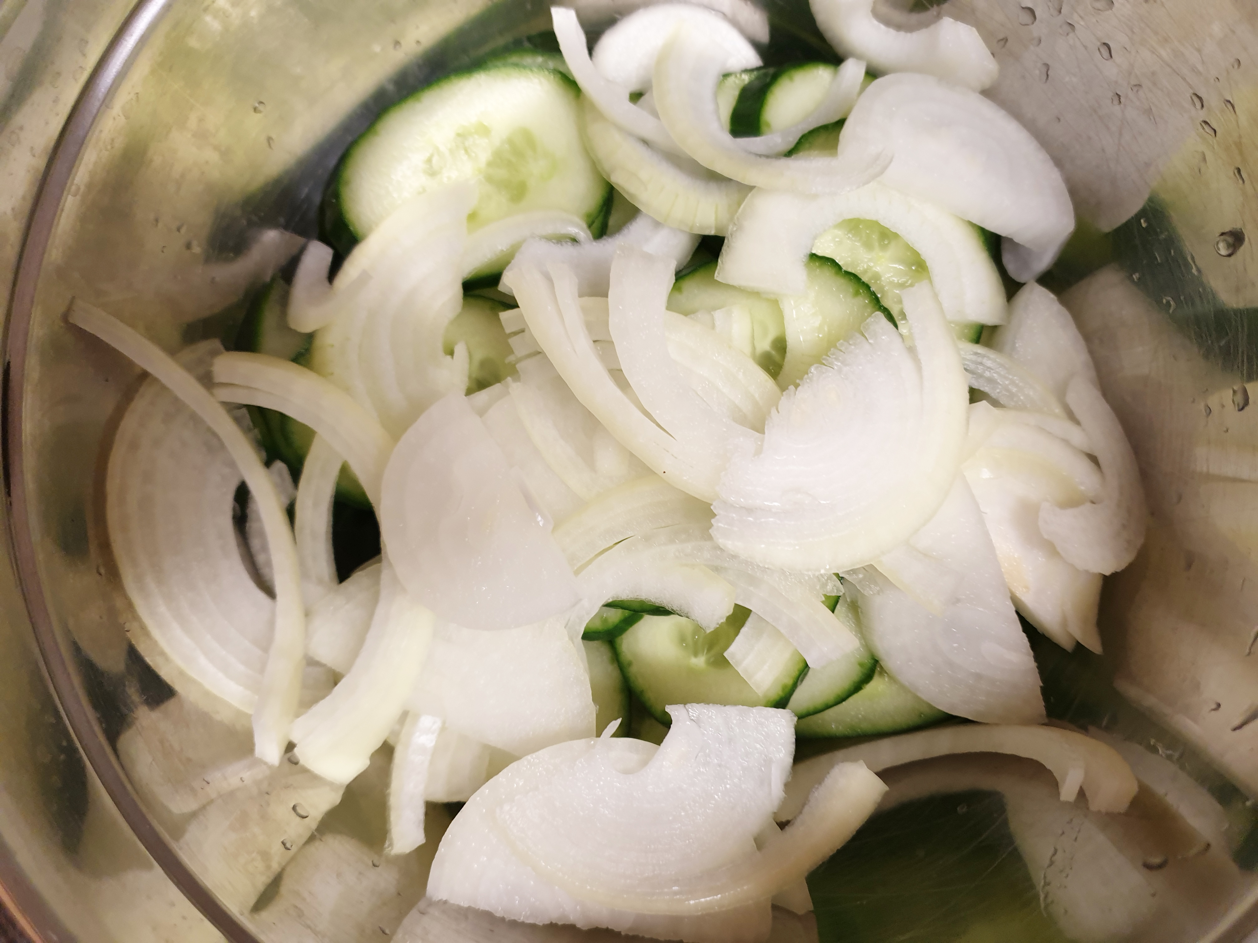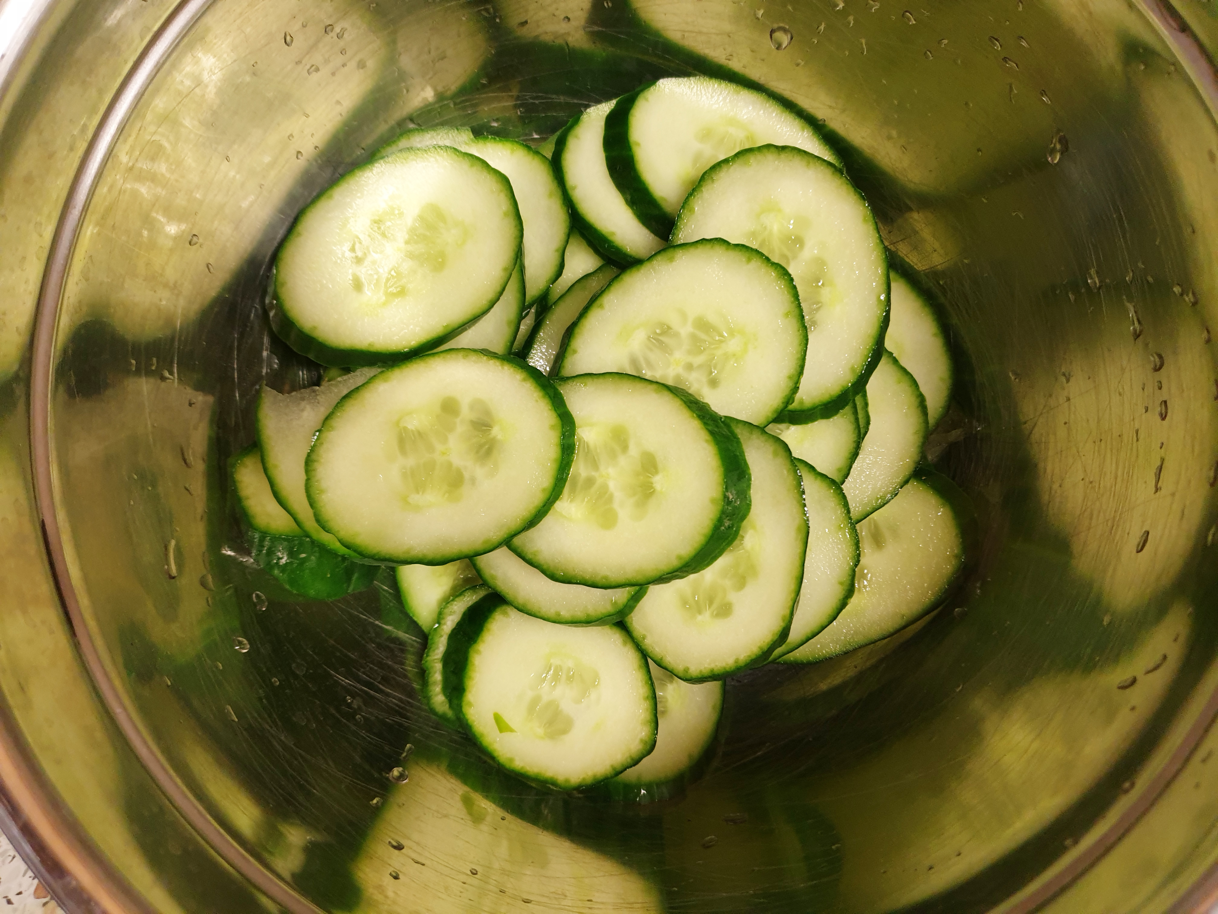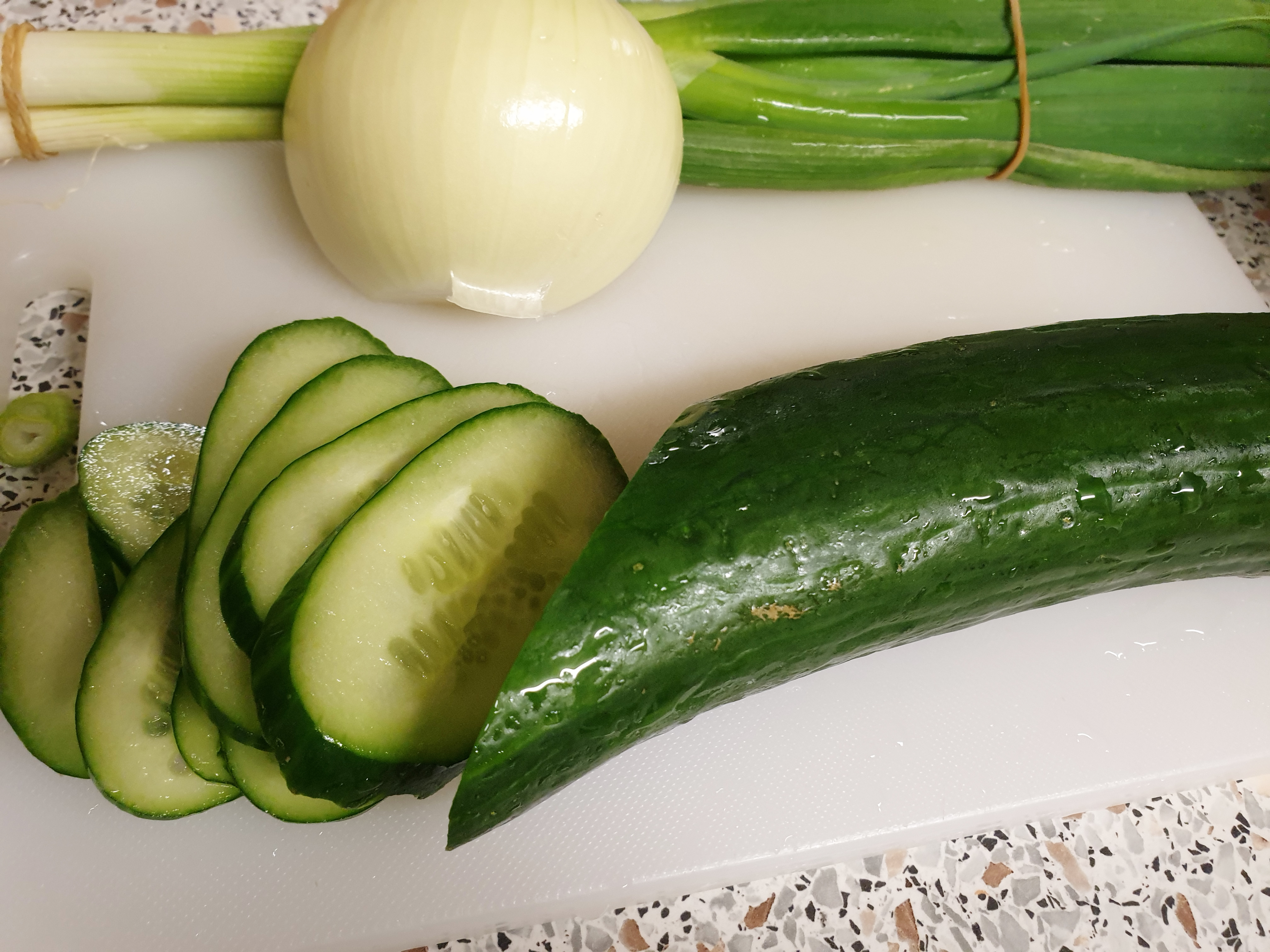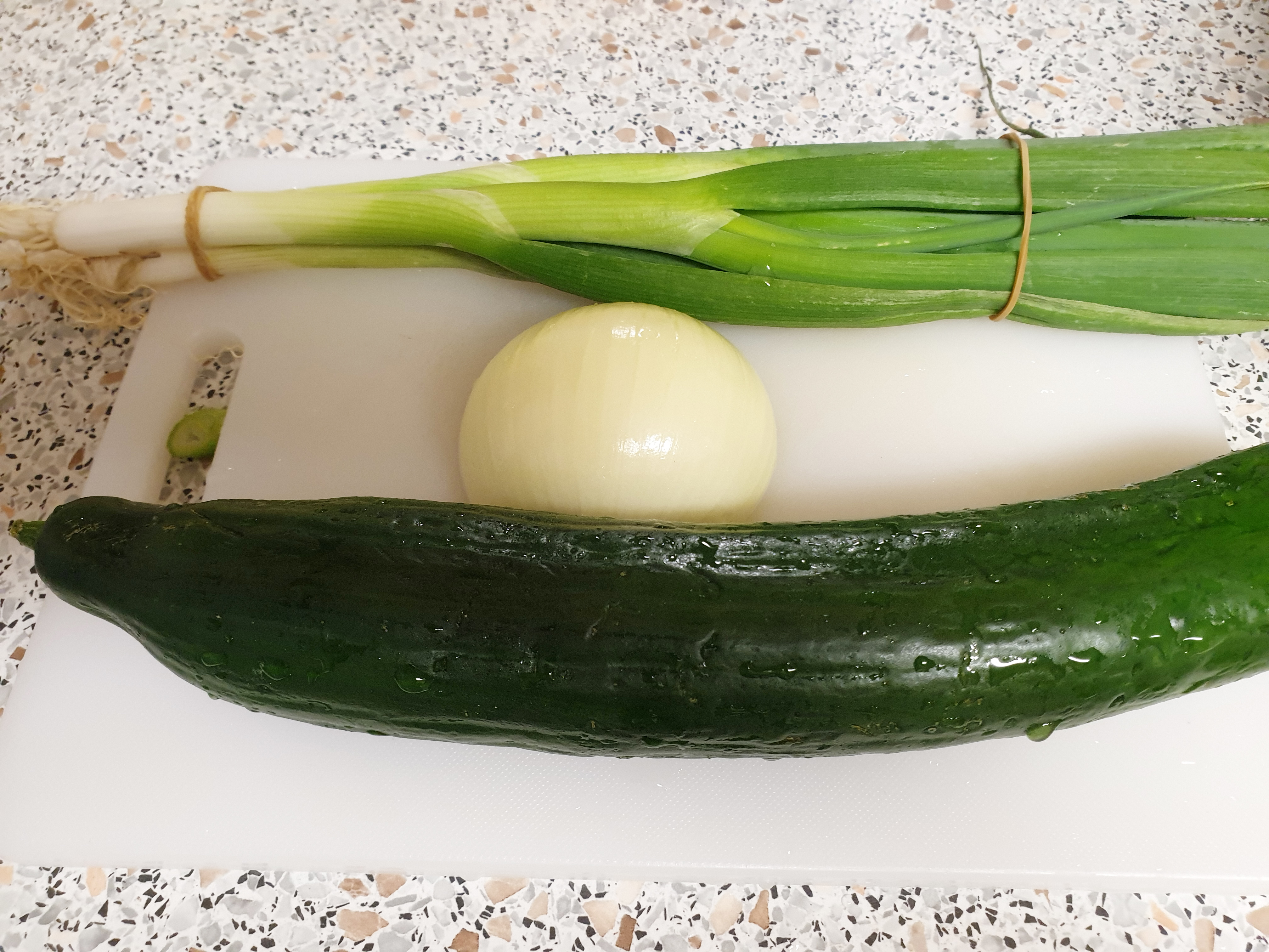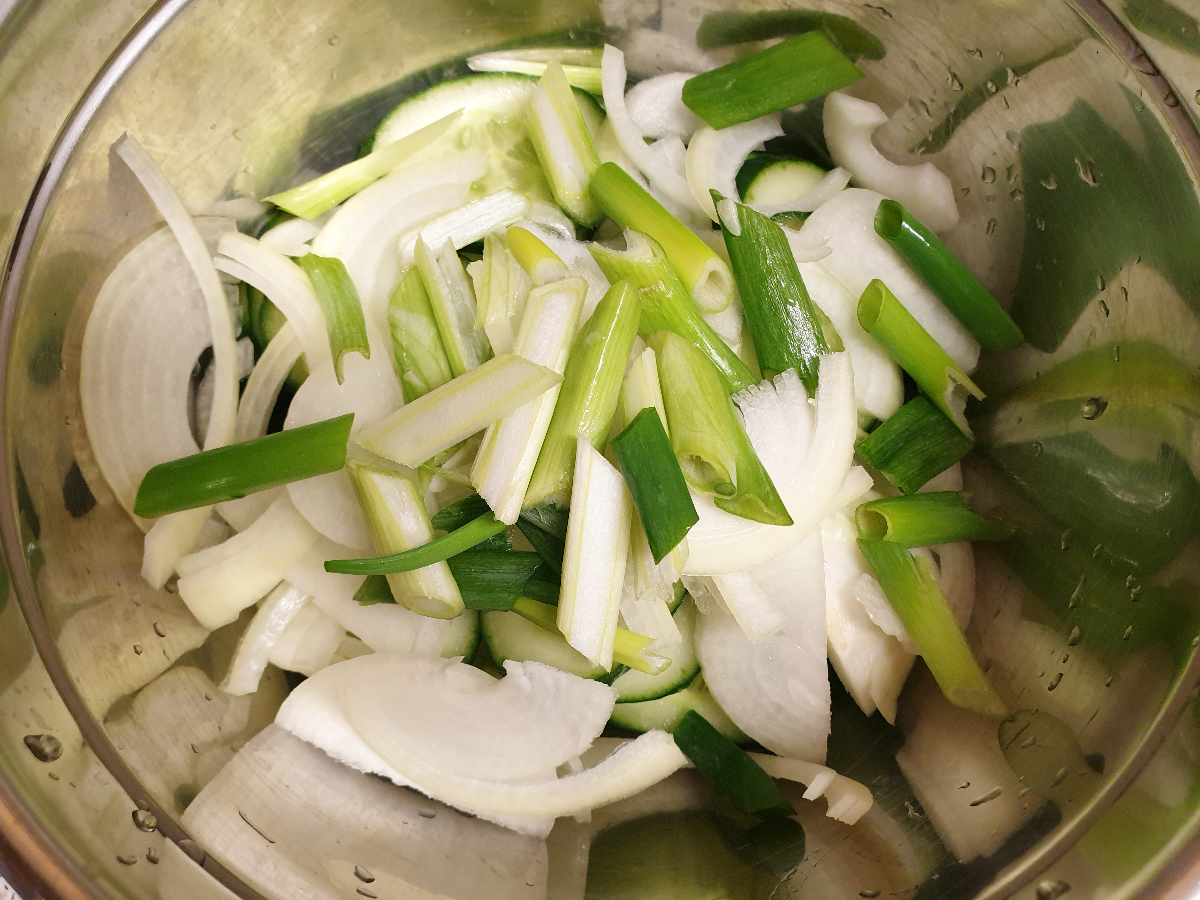 오이 , 양파 , 파가 준비가 됐다면 썰 차례! 오이에 양념이 잘 밸 수 있도록 너무 굵지 않게, 식감을 위해 너무 얇지 않게 굵기는 약 0.3 정도로 썰어줍니다.