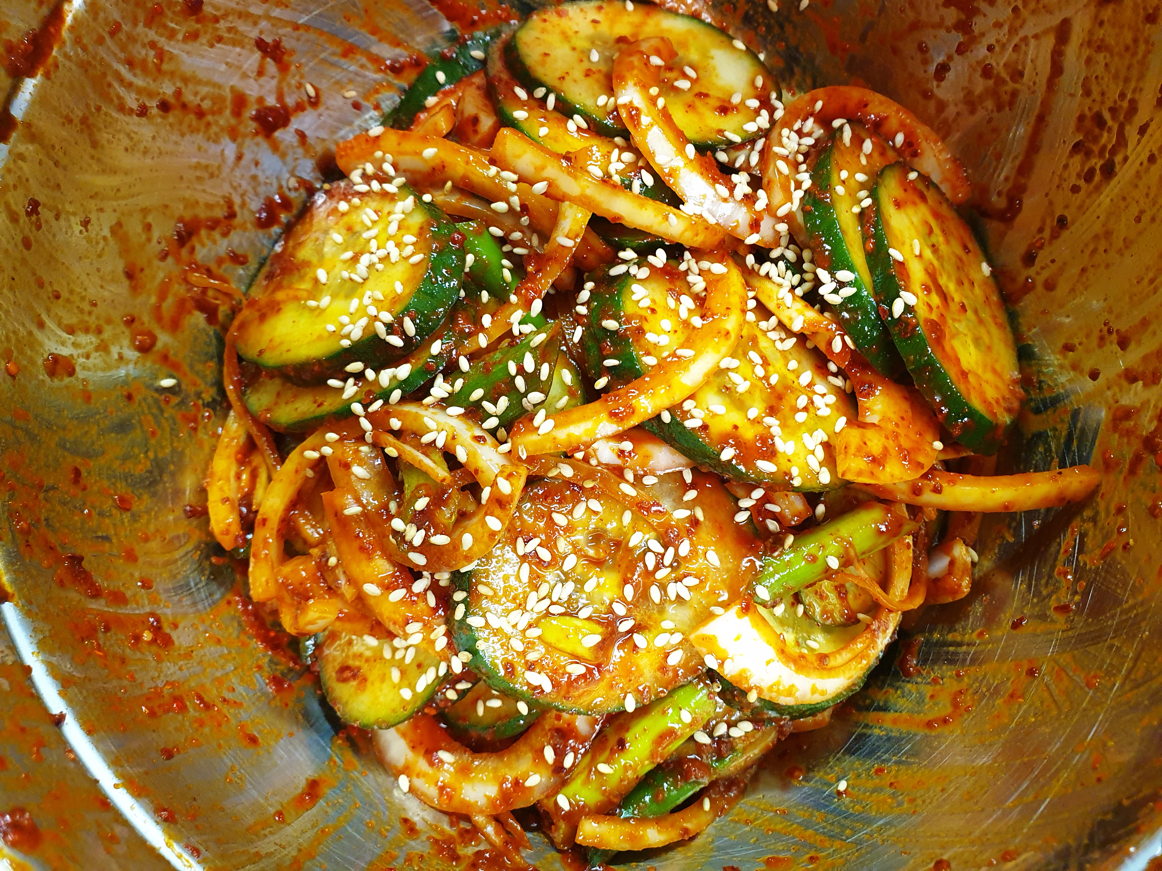 믹싱볼에 준비된 오이와 양파, 파를 넣고 양념장을 넣어 잘 버무려 줍니다. 고소한 맛을 더하려면 참기름을 살 짝 둘러주세요~ (전 새콤한 맛이 좋아 참기름을 넣지 않았어요.) 그리고 볶음 깨를 뿌려 무리해줍니다.