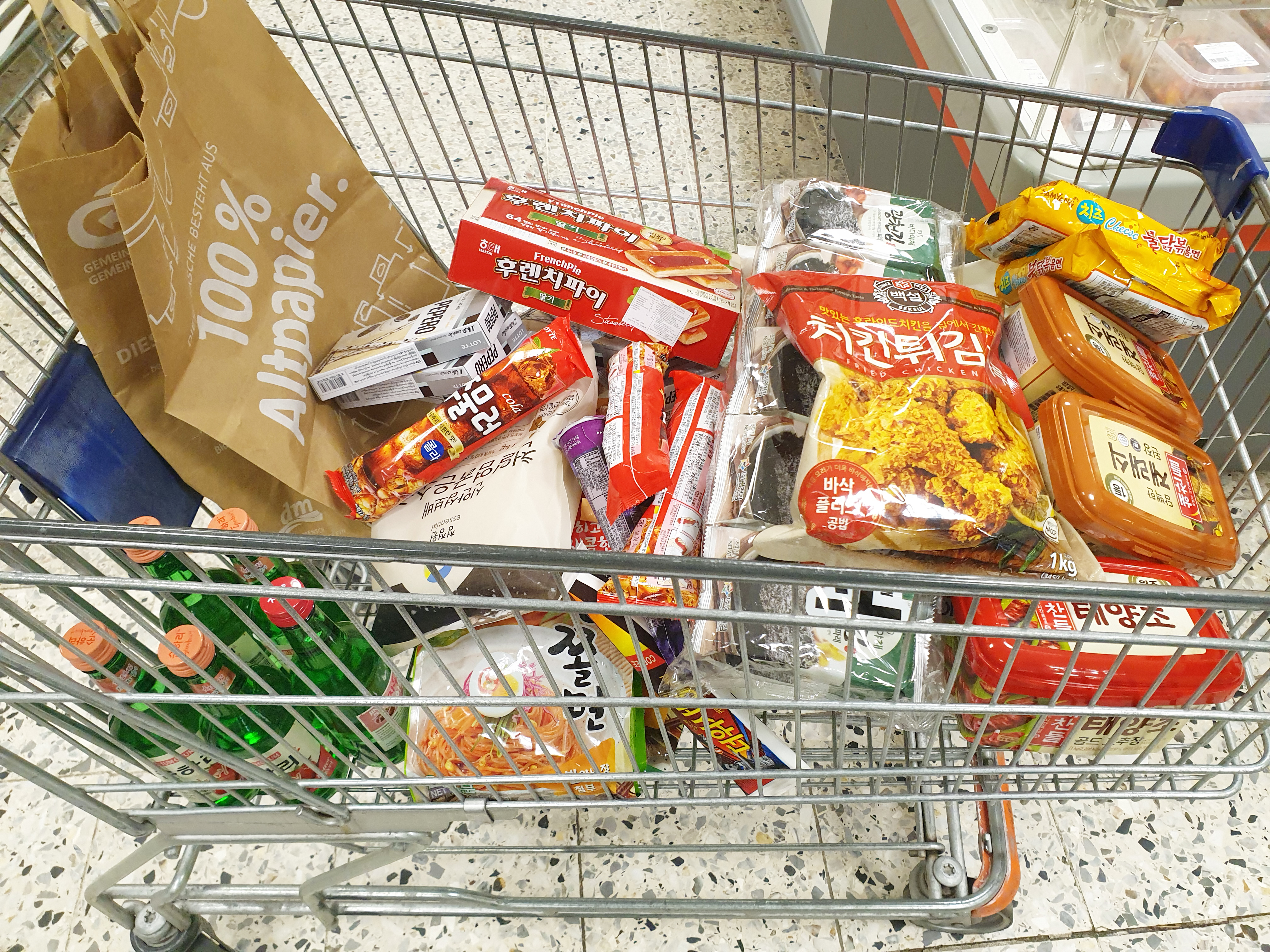 담다 보니 이만큼~ 100유로 정도 나왔다. 한독마트가 아시아 마켓보다 몇 가지 상품 빼고는 저렴한 편이다. 그리고 다양하다. 사실 더 사고 싶은 것들이 많았는데 재고가 충분치 않았음 그 점이 아쉬웠음.. 닭발과 한독마트때문에 프랑크푸르트에 살고 싶은 마음이 들었다.ㅋㅋㅋ