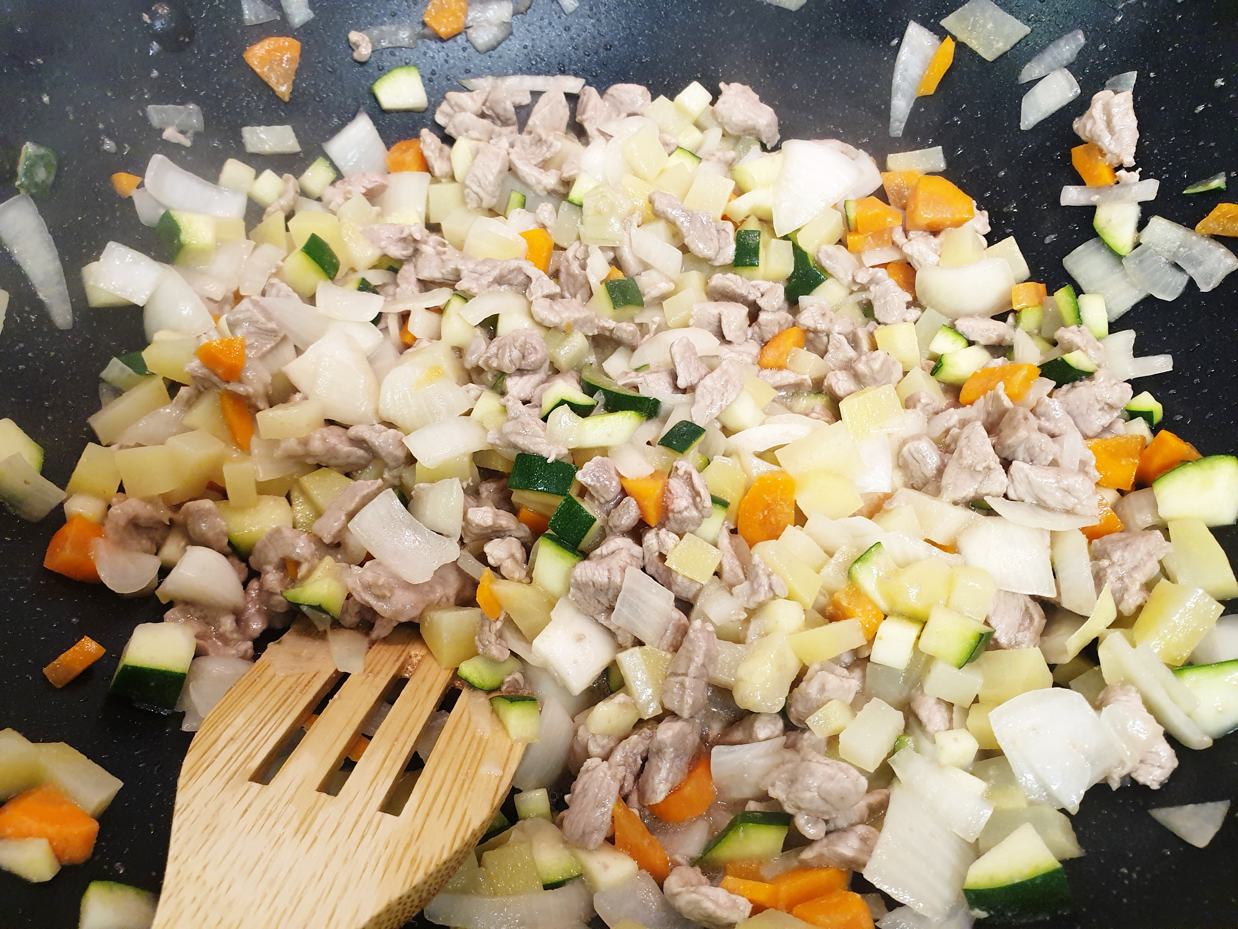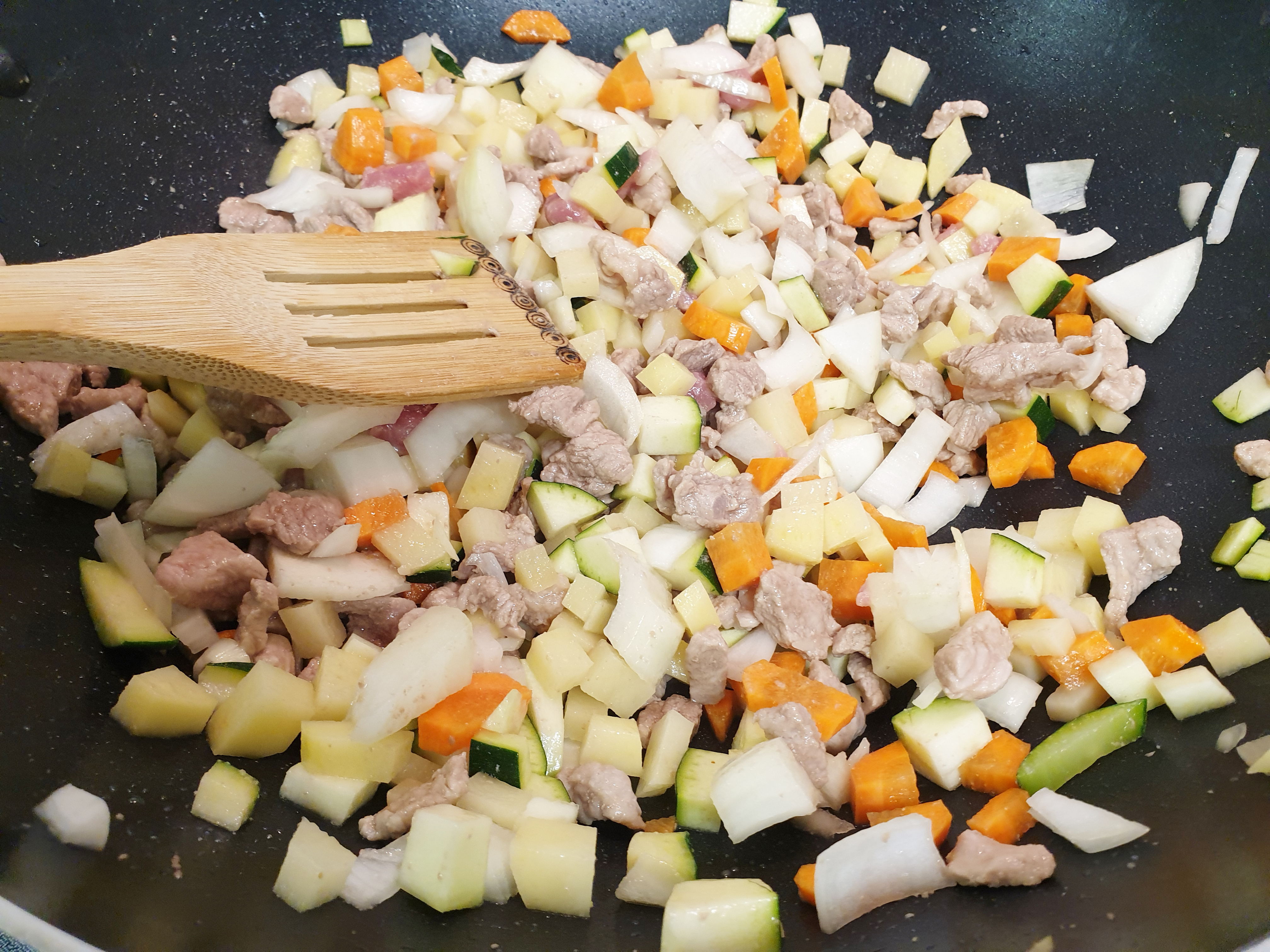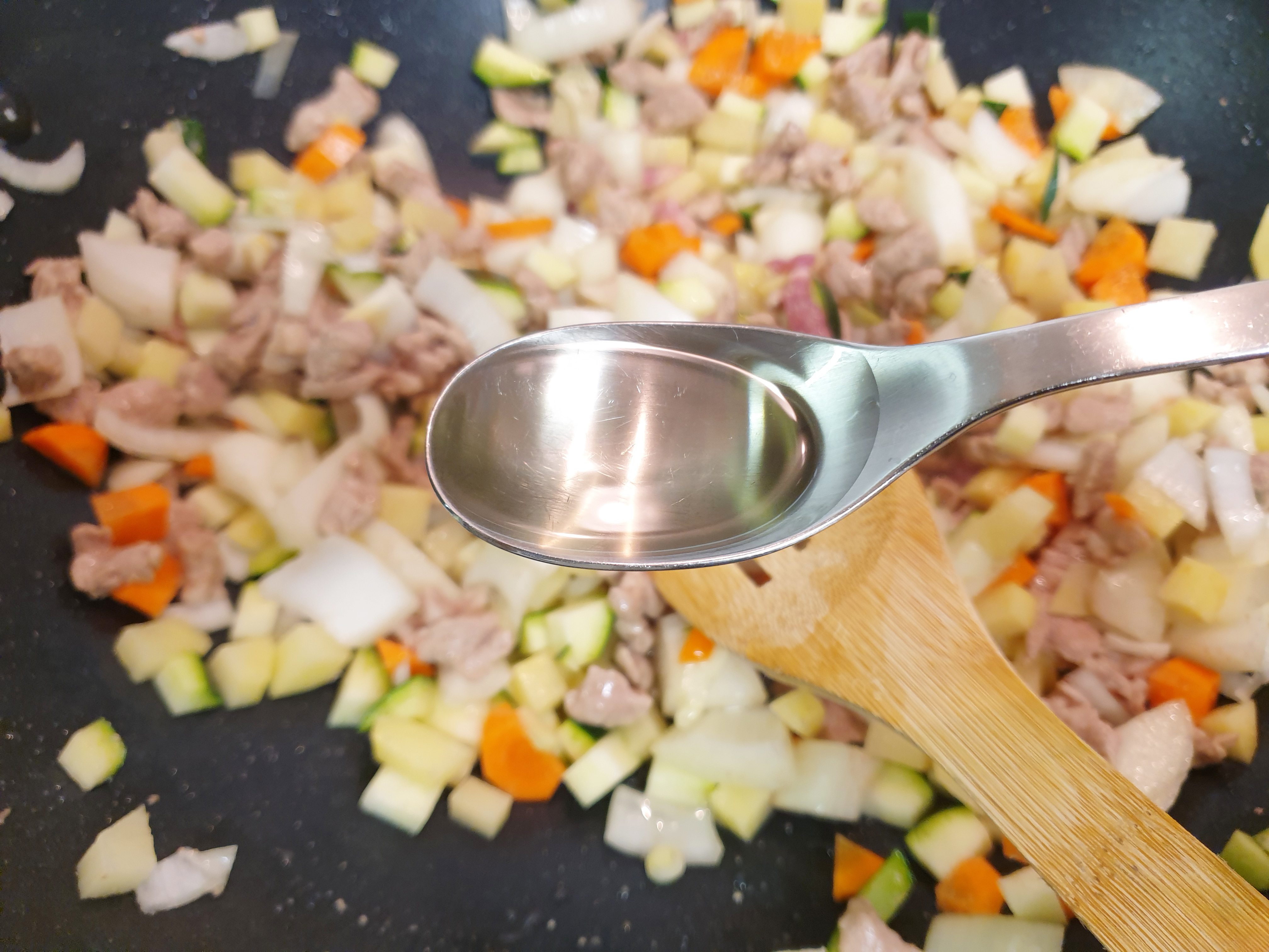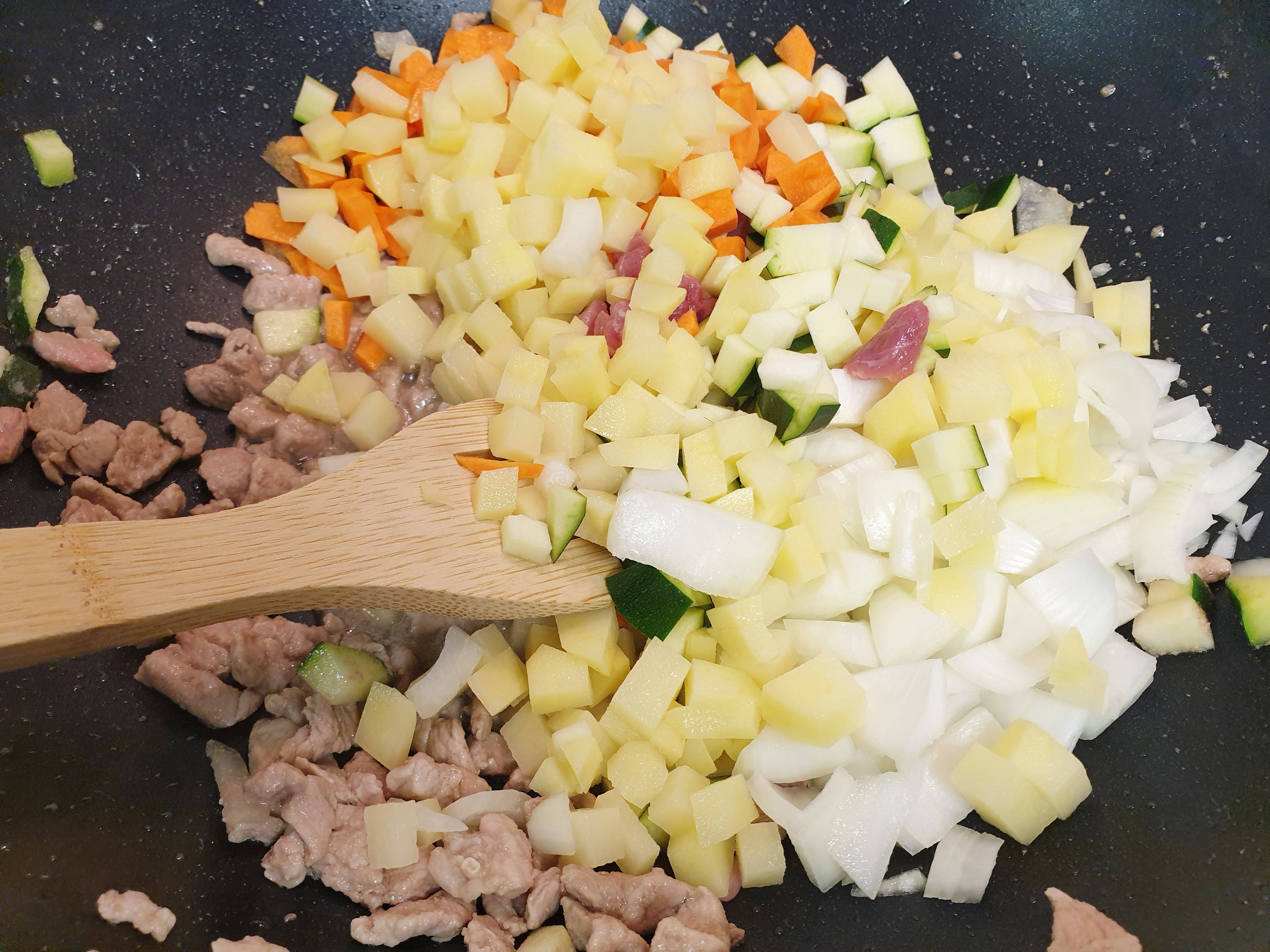고기가 익었다면 식용유 2스푼을 추가해주고 감자, 양파, 호박, 당근을 넣고 볶아줍니다.