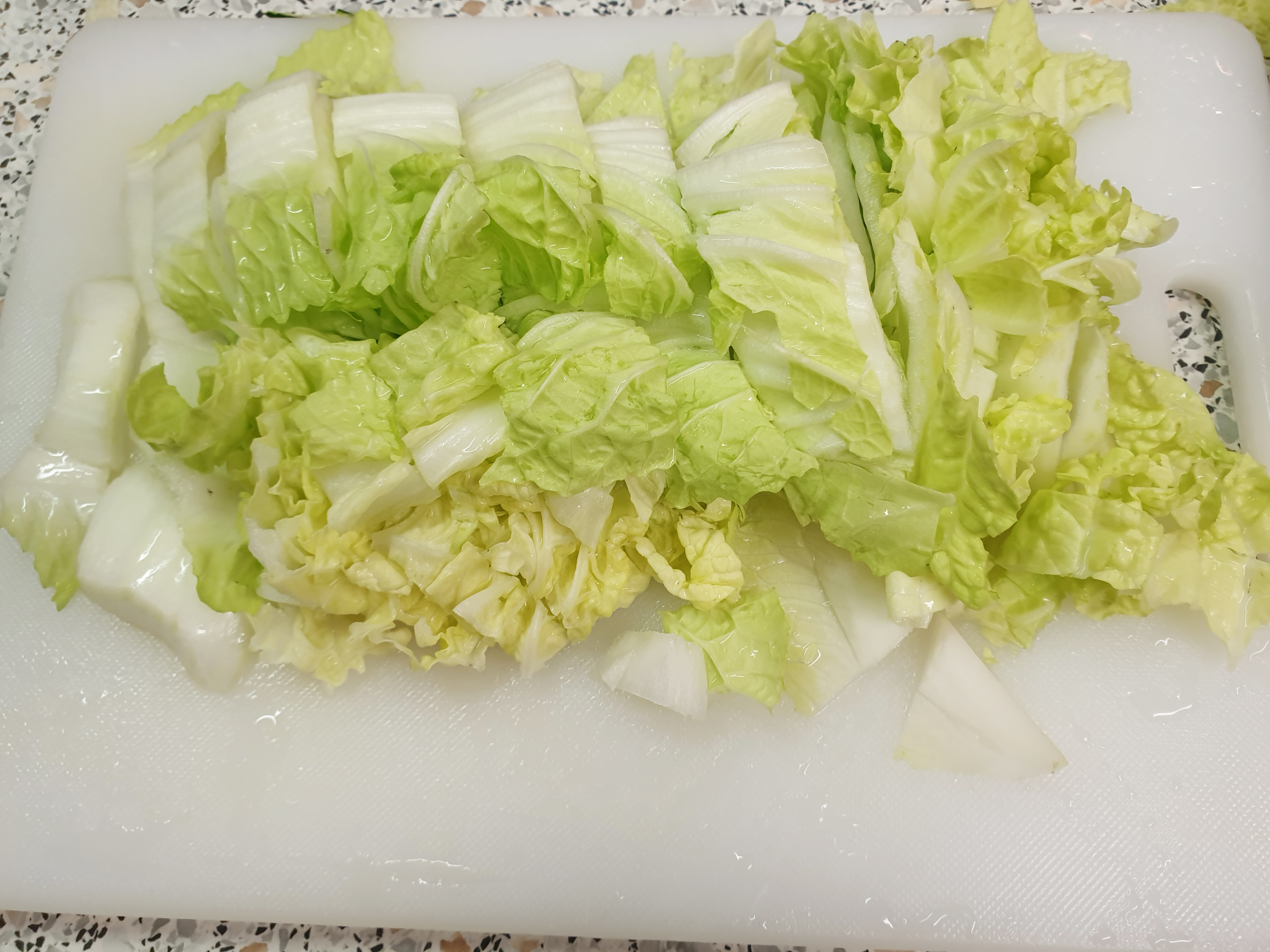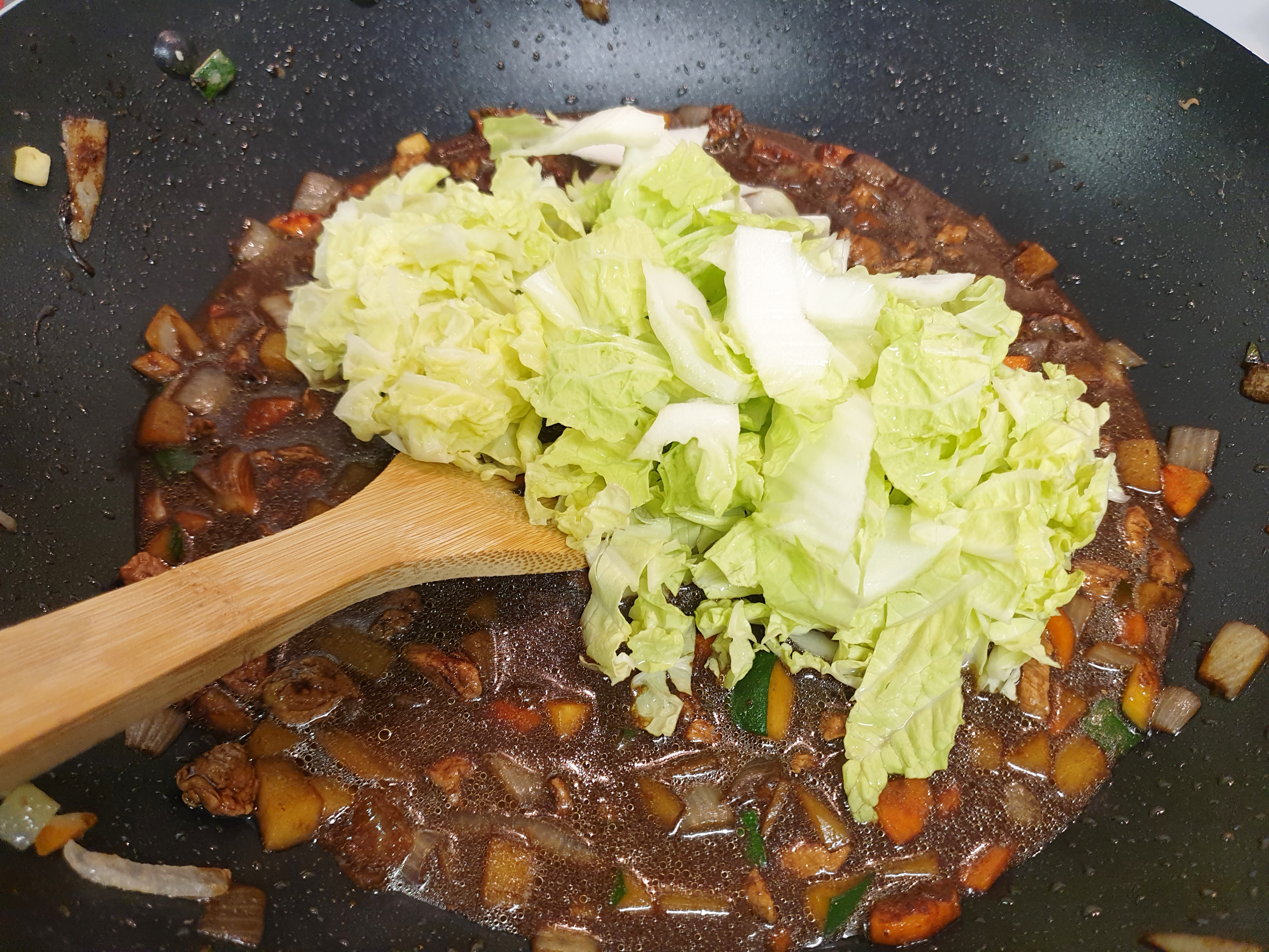 물을 부은 후 썰어둔 배추를 넣어줍니다.(양배추로 준비하셔도 돼요.)