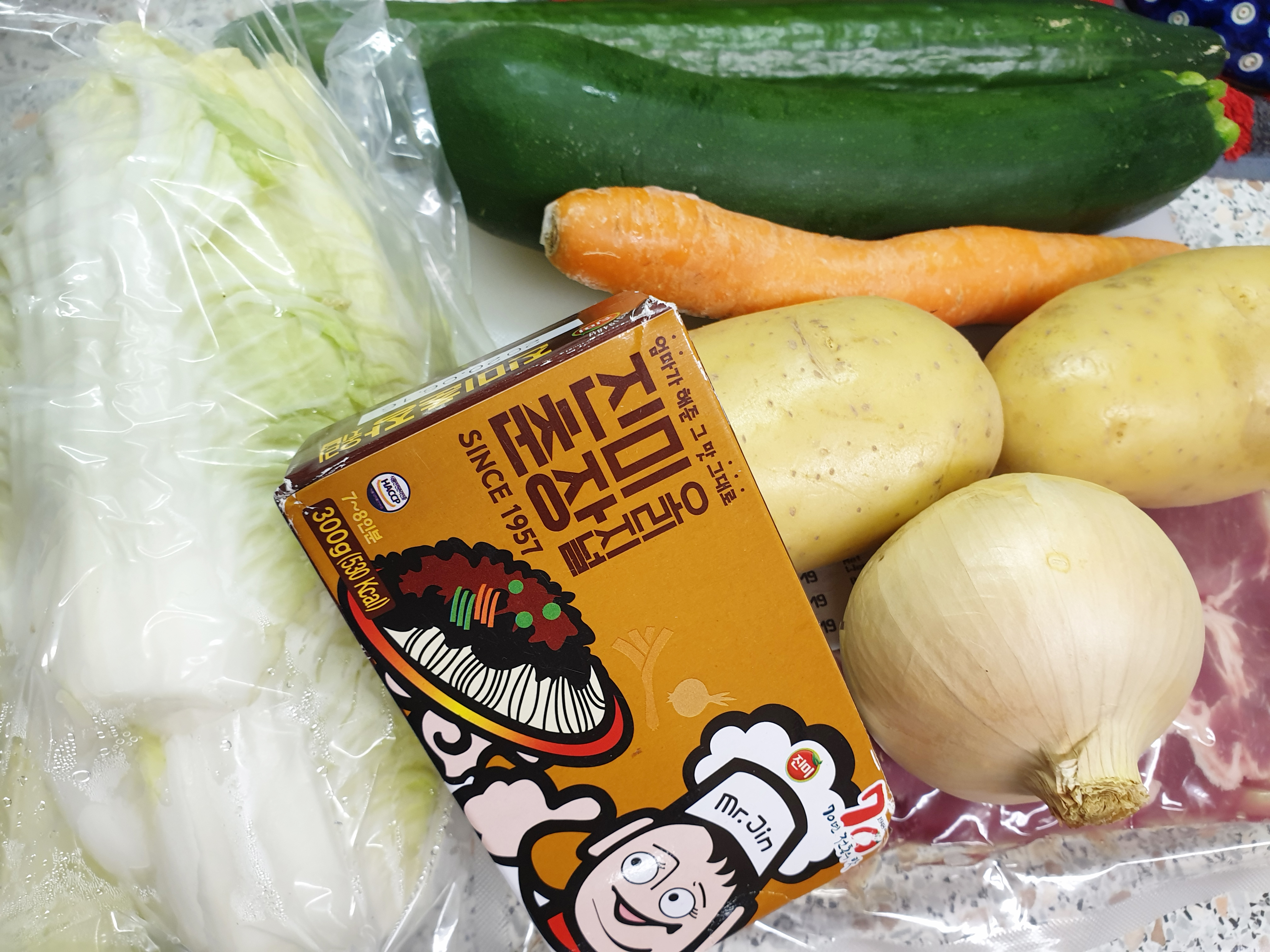 준비할 재료(6인분~7인분 기준): 당근 1, 배추 5장, 호박 1/2 , 오이 1/2 , 감자 2 , 돼지고기 500g , 양파 1