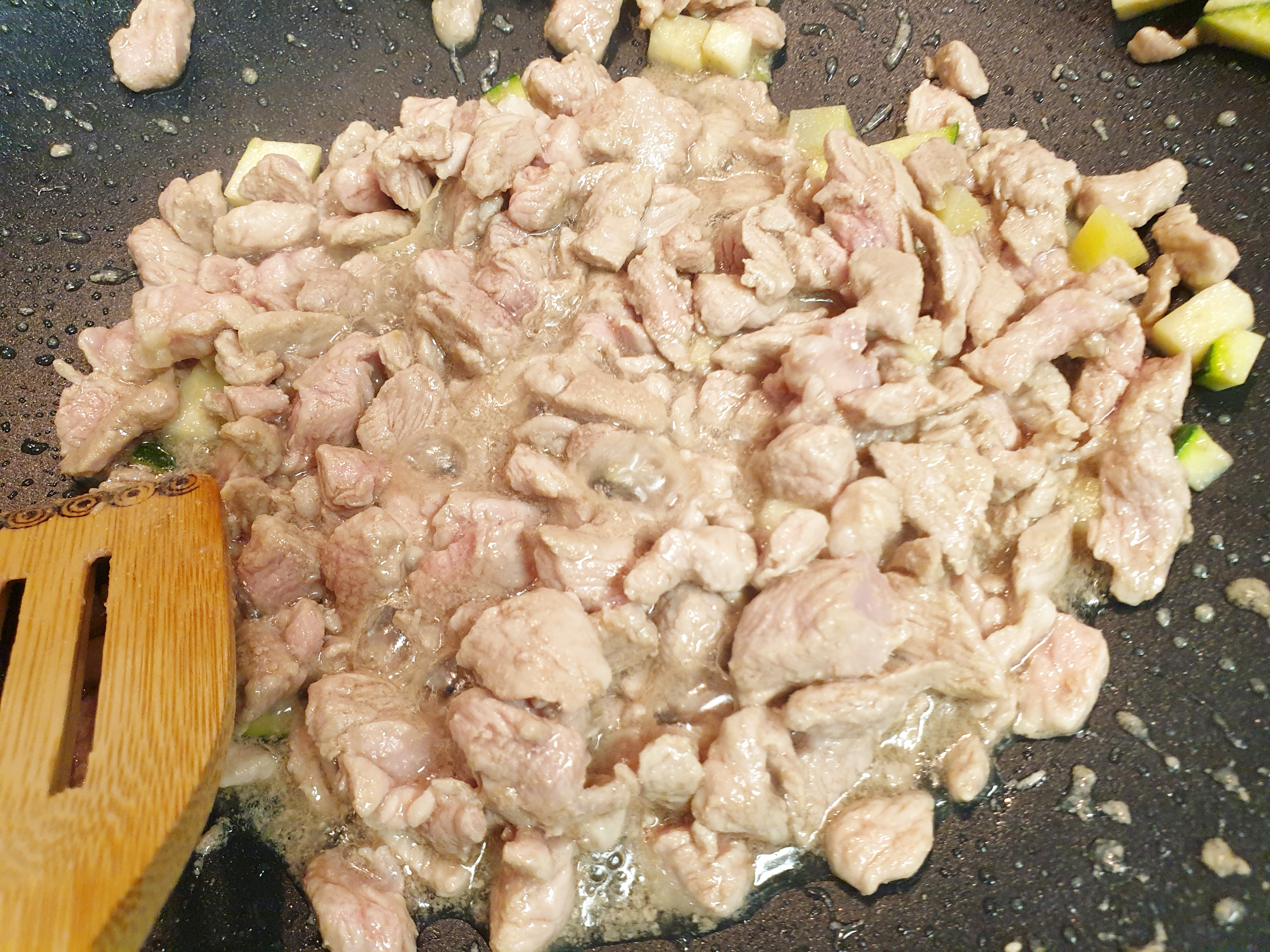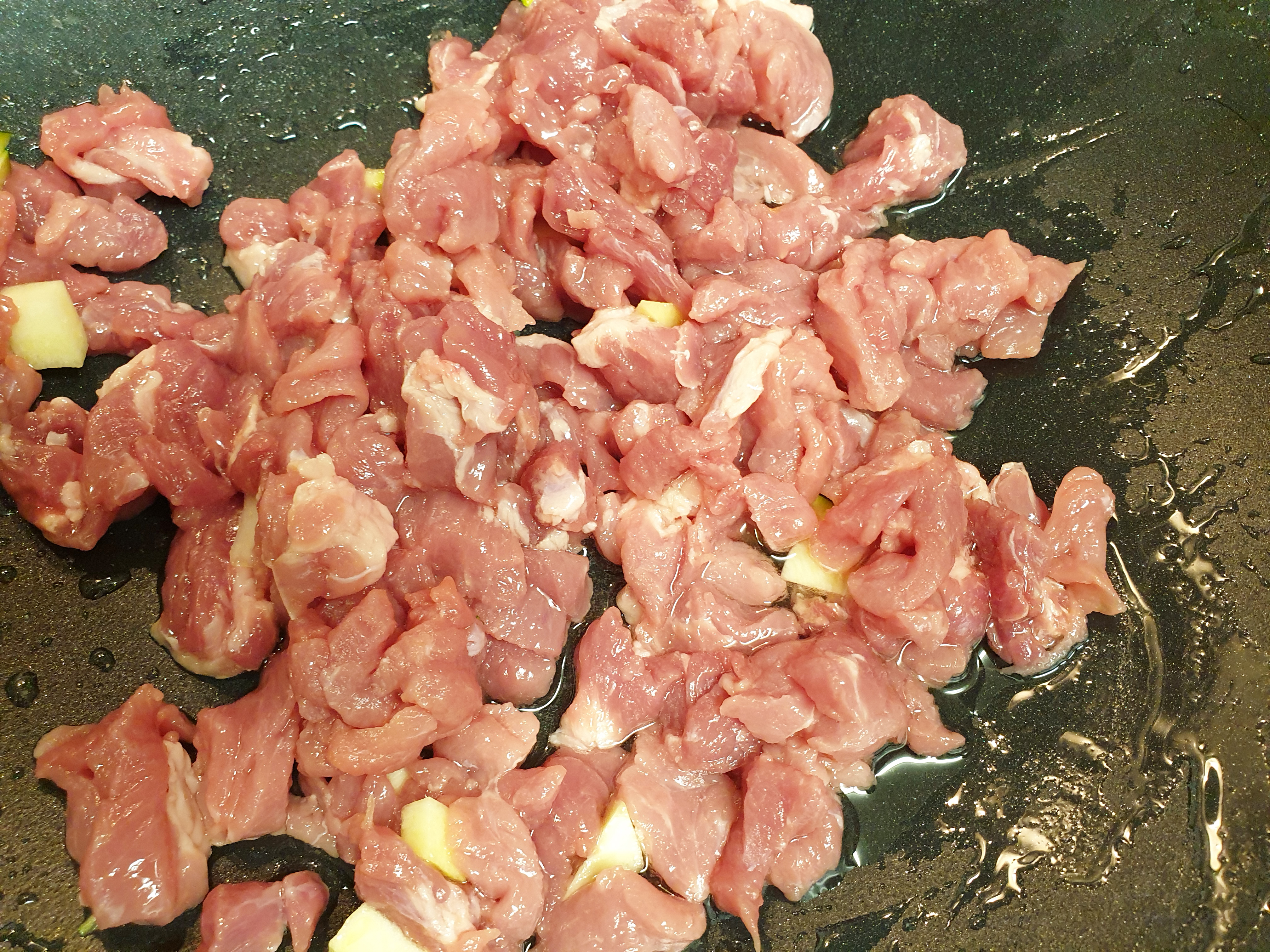 가장 먼저 썰어둔 고기를 볶아줍니다. 고기가 익을 때까지~!