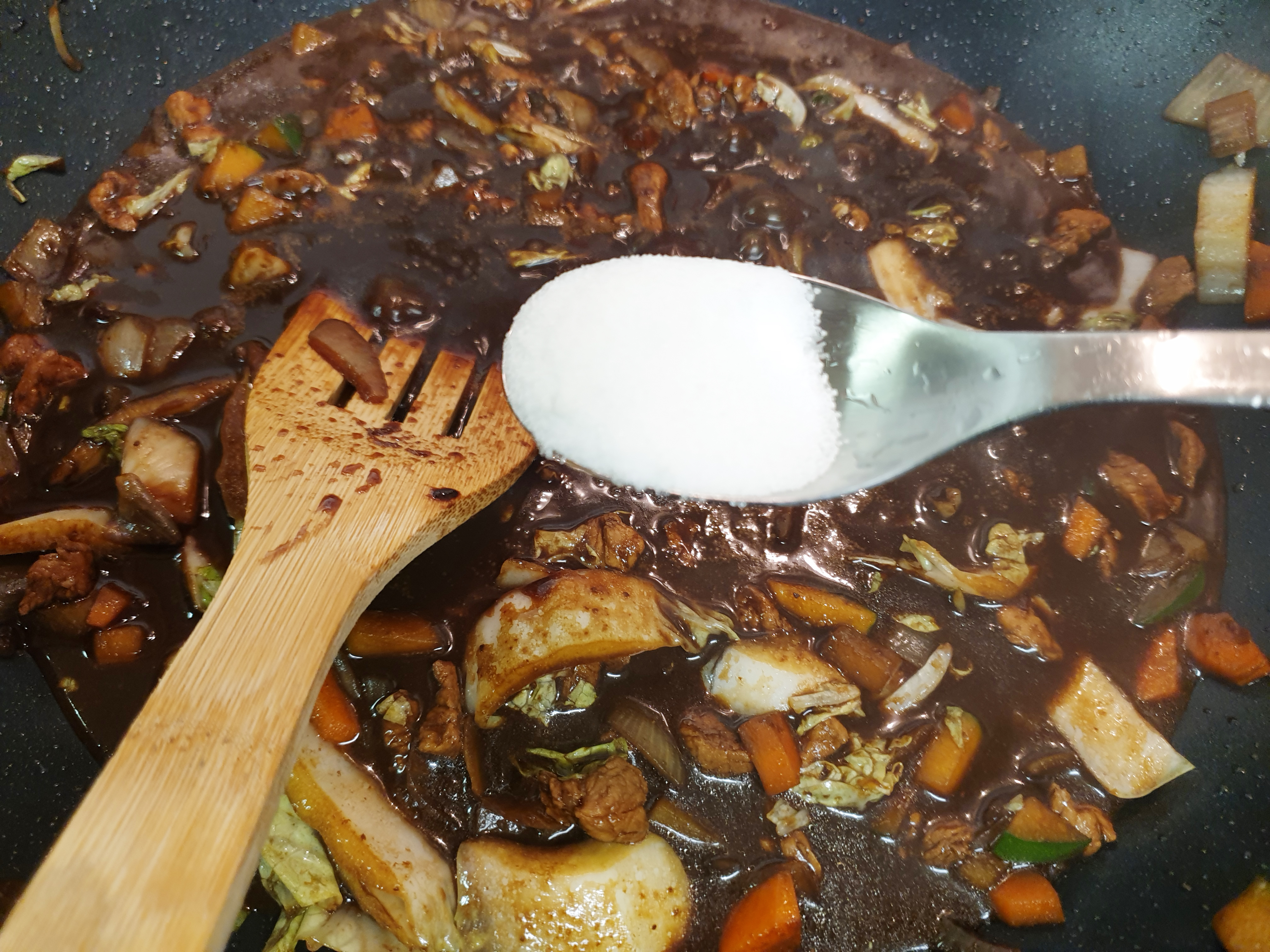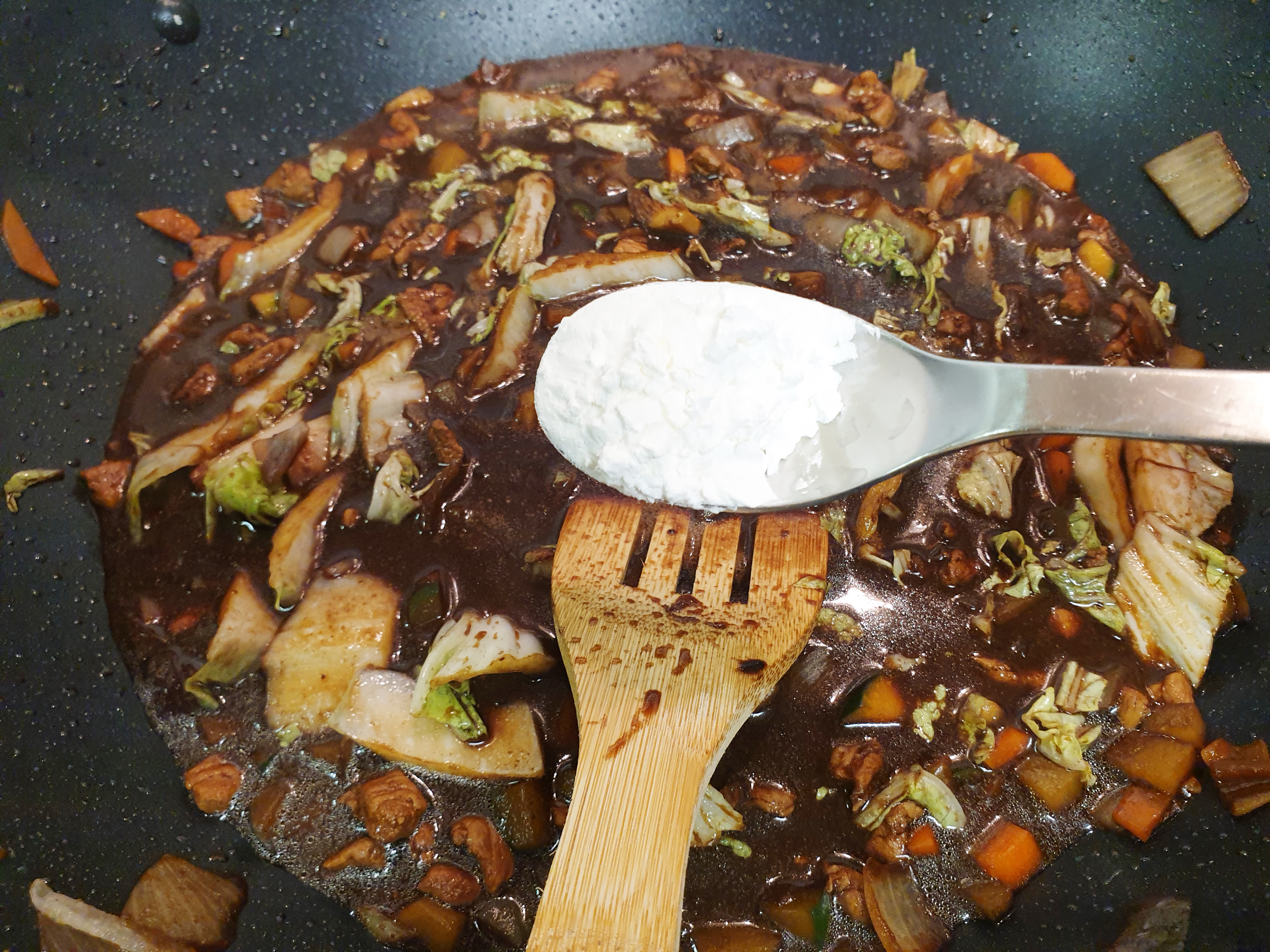 물이 끓고 채소가 전체적으로 익었다면 전분 2스푼, 설탕 1스푼을 넣어줍니다.