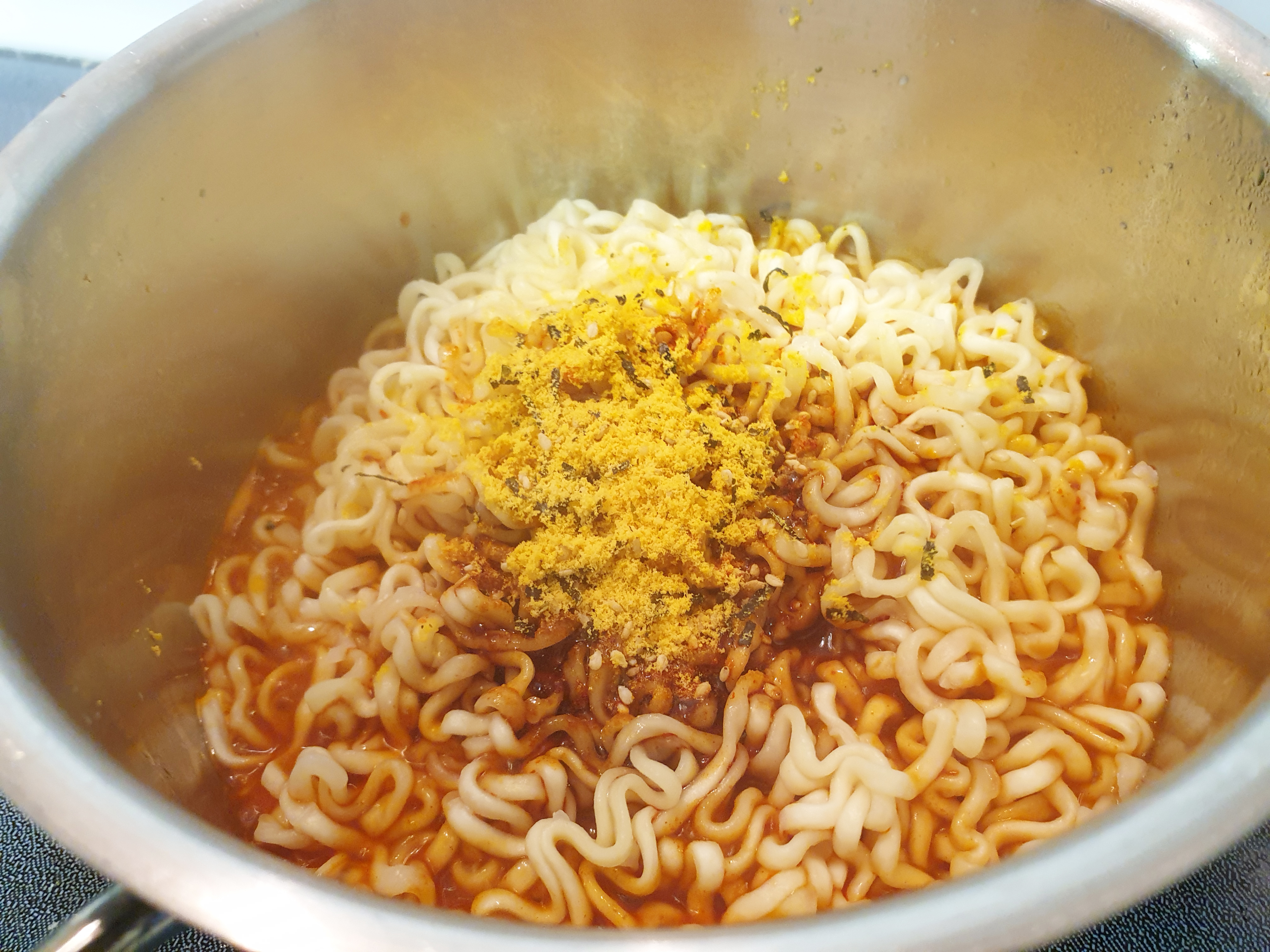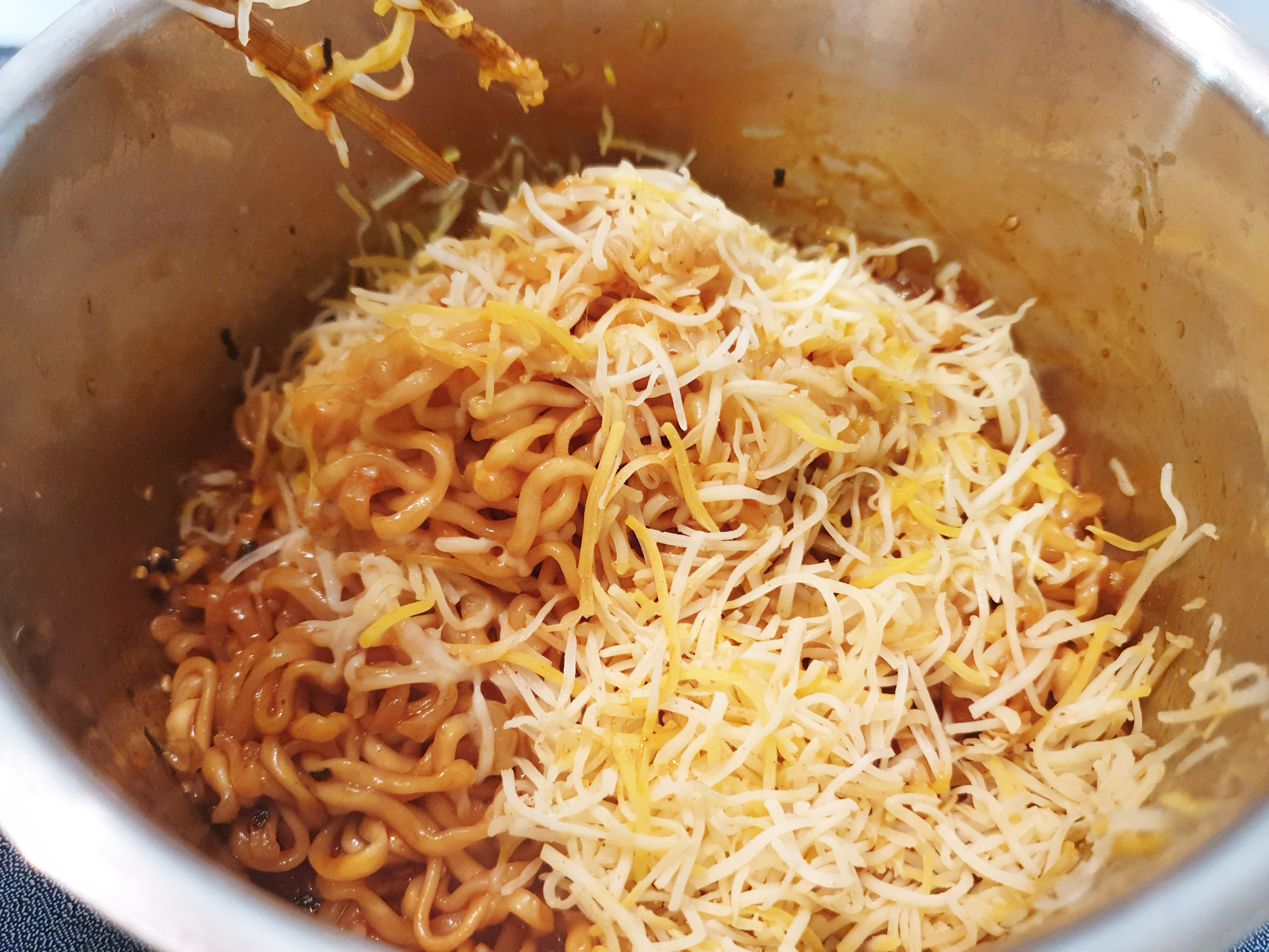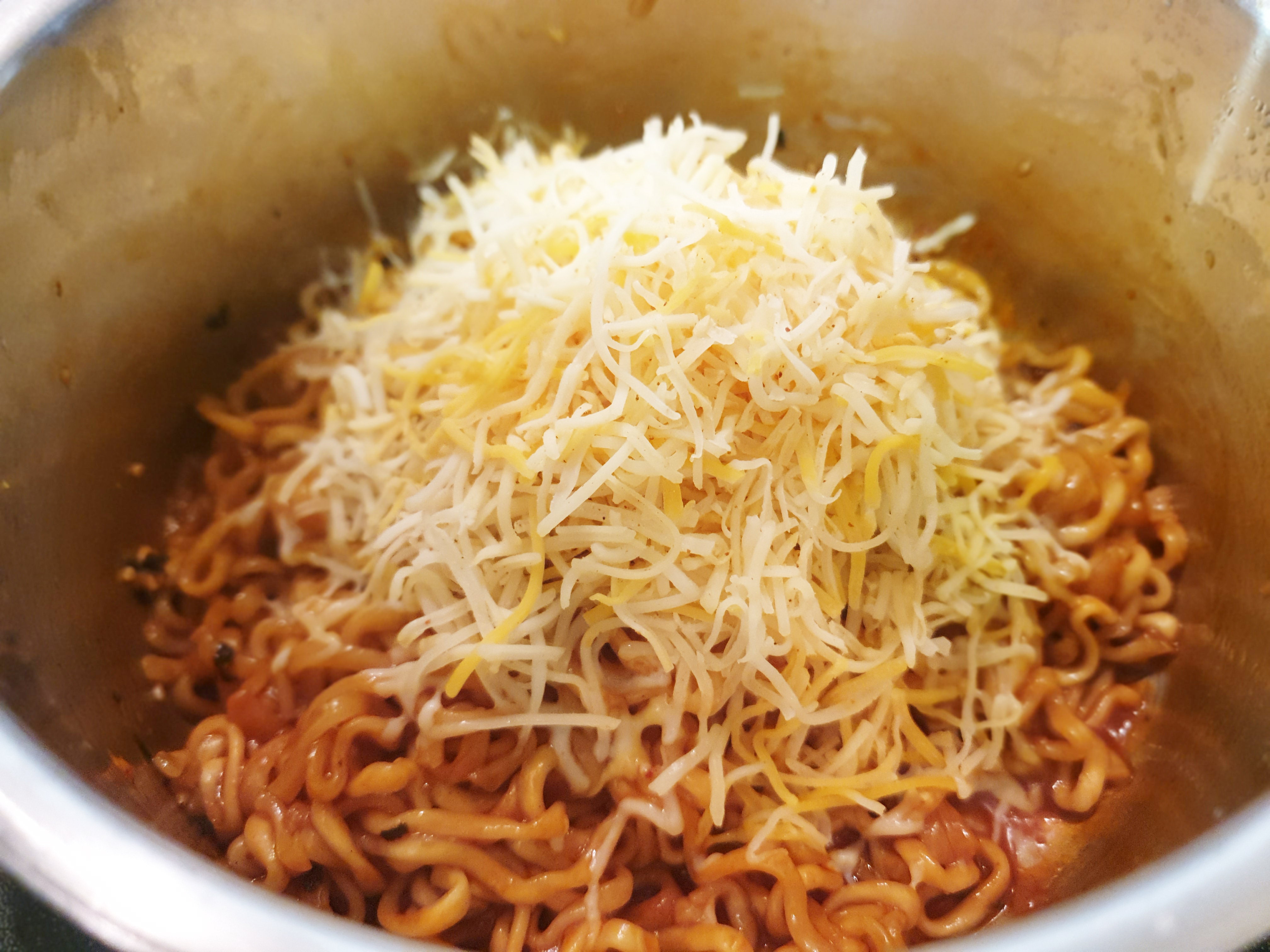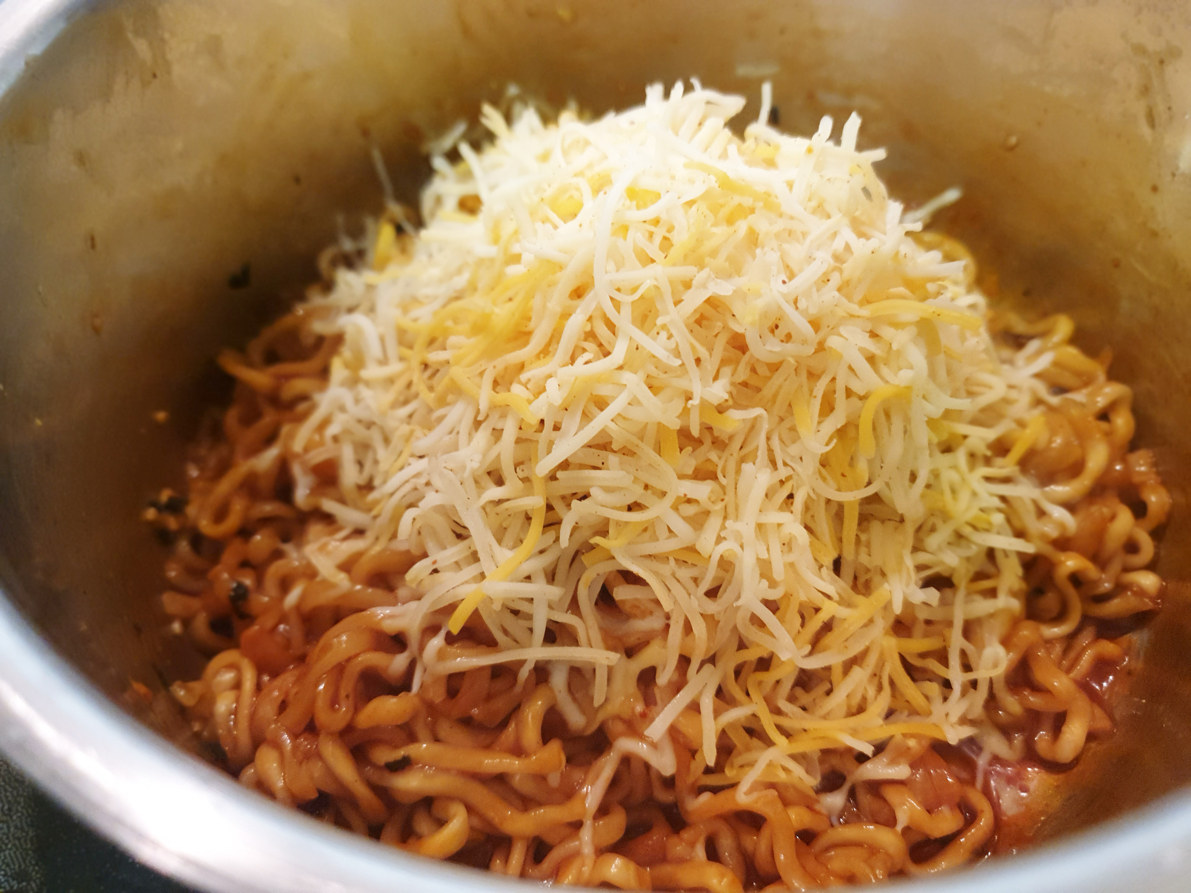 완성된 치즈불닭볶음면에 치즈의 맛을 더 추가하기 위해 타코에 들어가는 치즈를 추가로 넣어줬음!