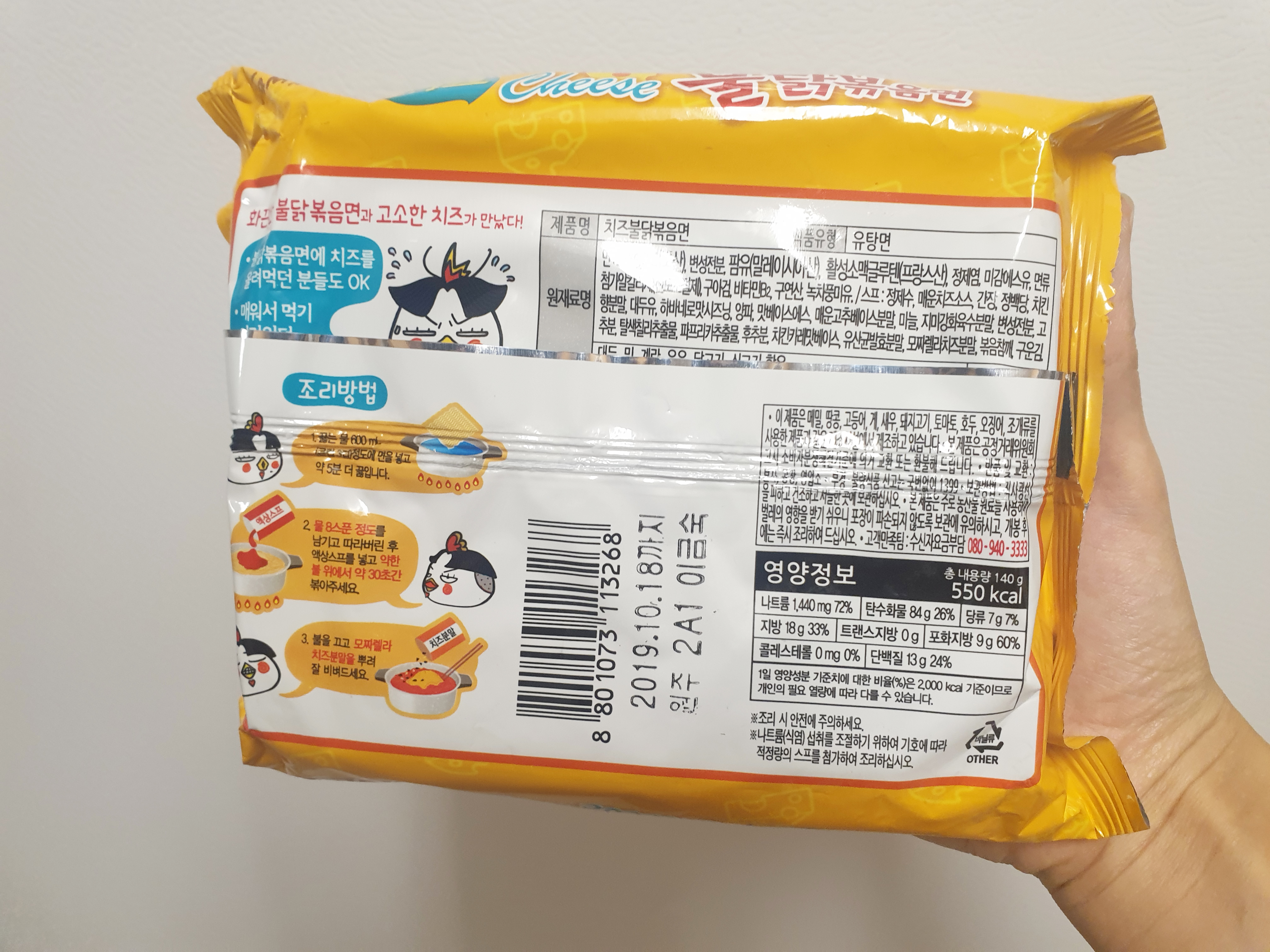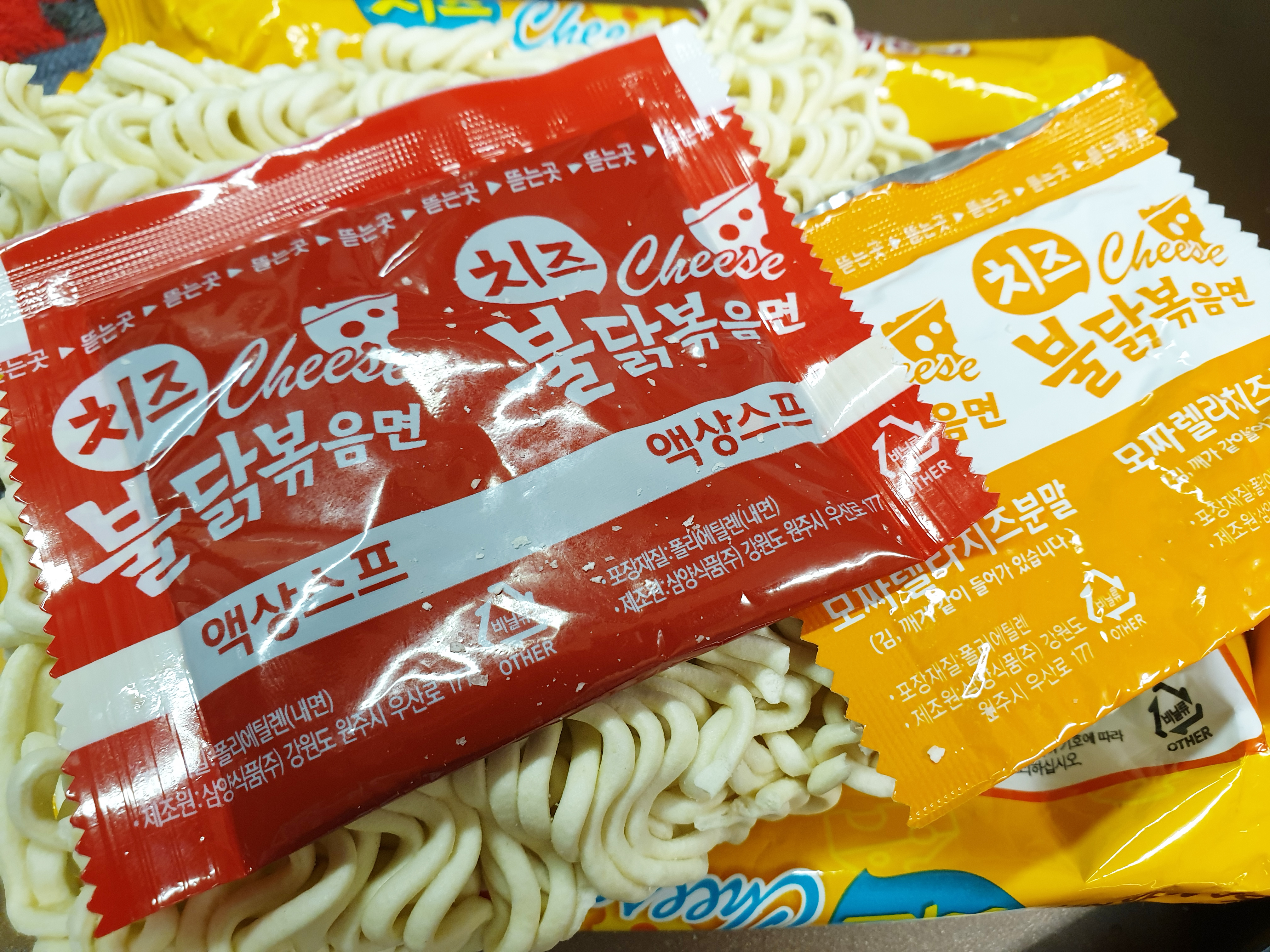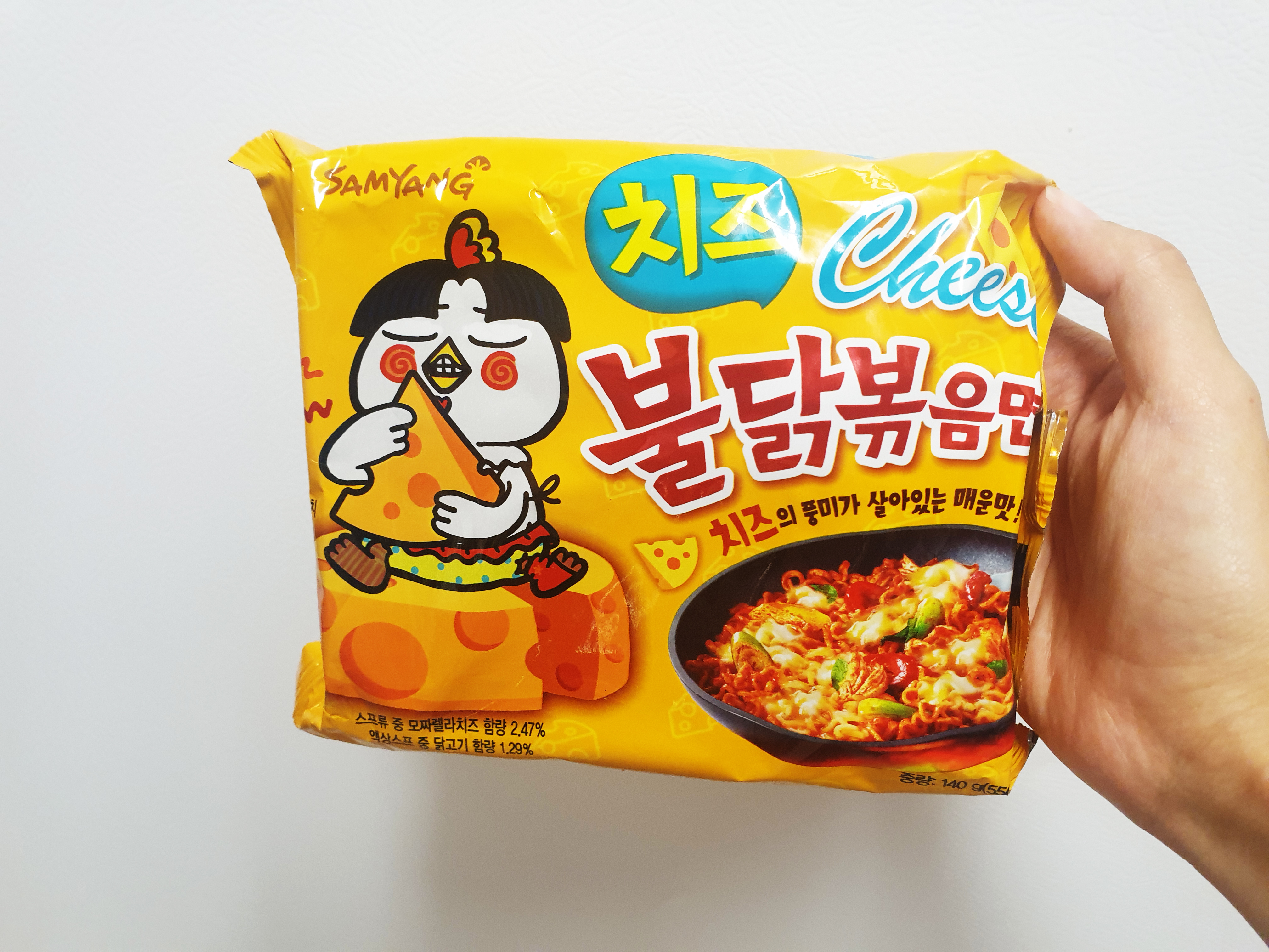 이렇게 노란색 포장이 치즈 불닭볶음면이다. 아시아마켓에서 구매한 가격은 1.45유로 정도 했던 것 같다. 치즈 불닭볶음면 맛있게 먹는법은 굉장히 간단함. 라면만 끓일 줄 안다면 누구나 쉽게 만들어 먹을 수 있다.