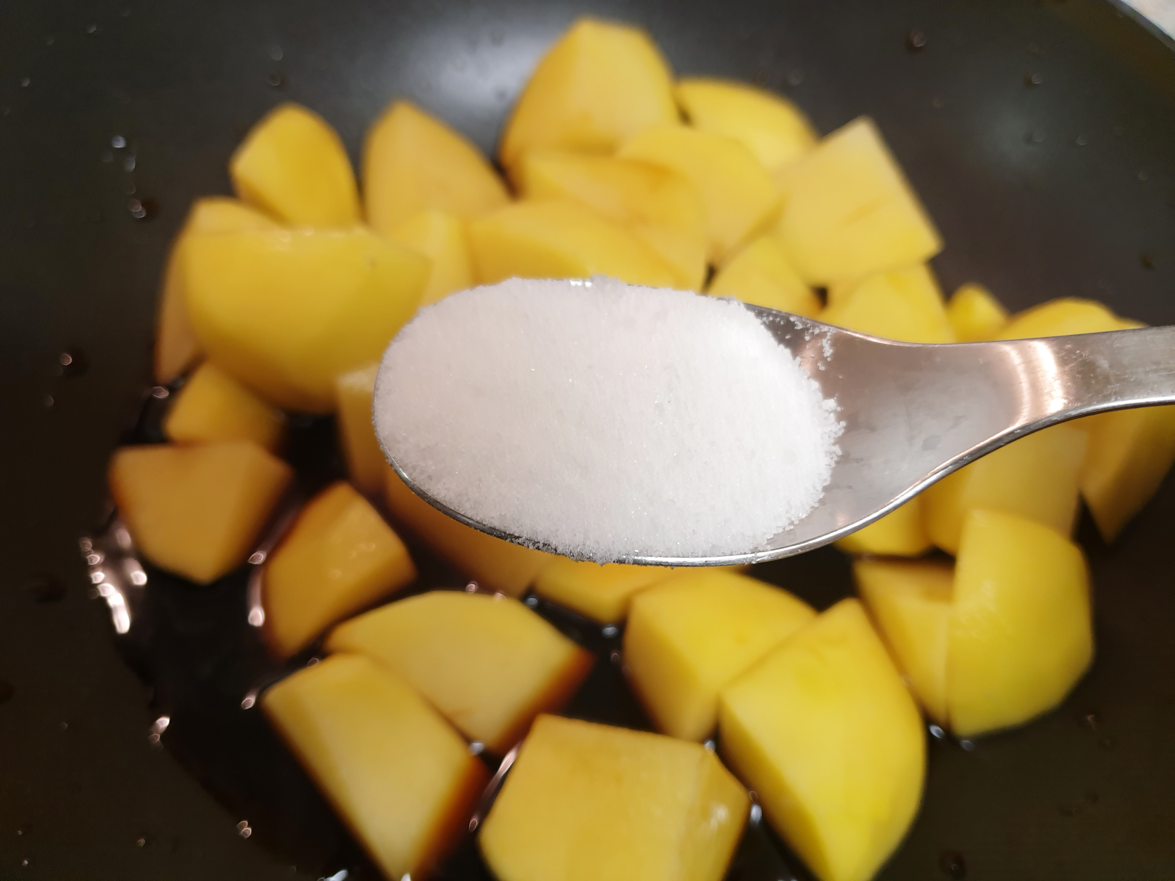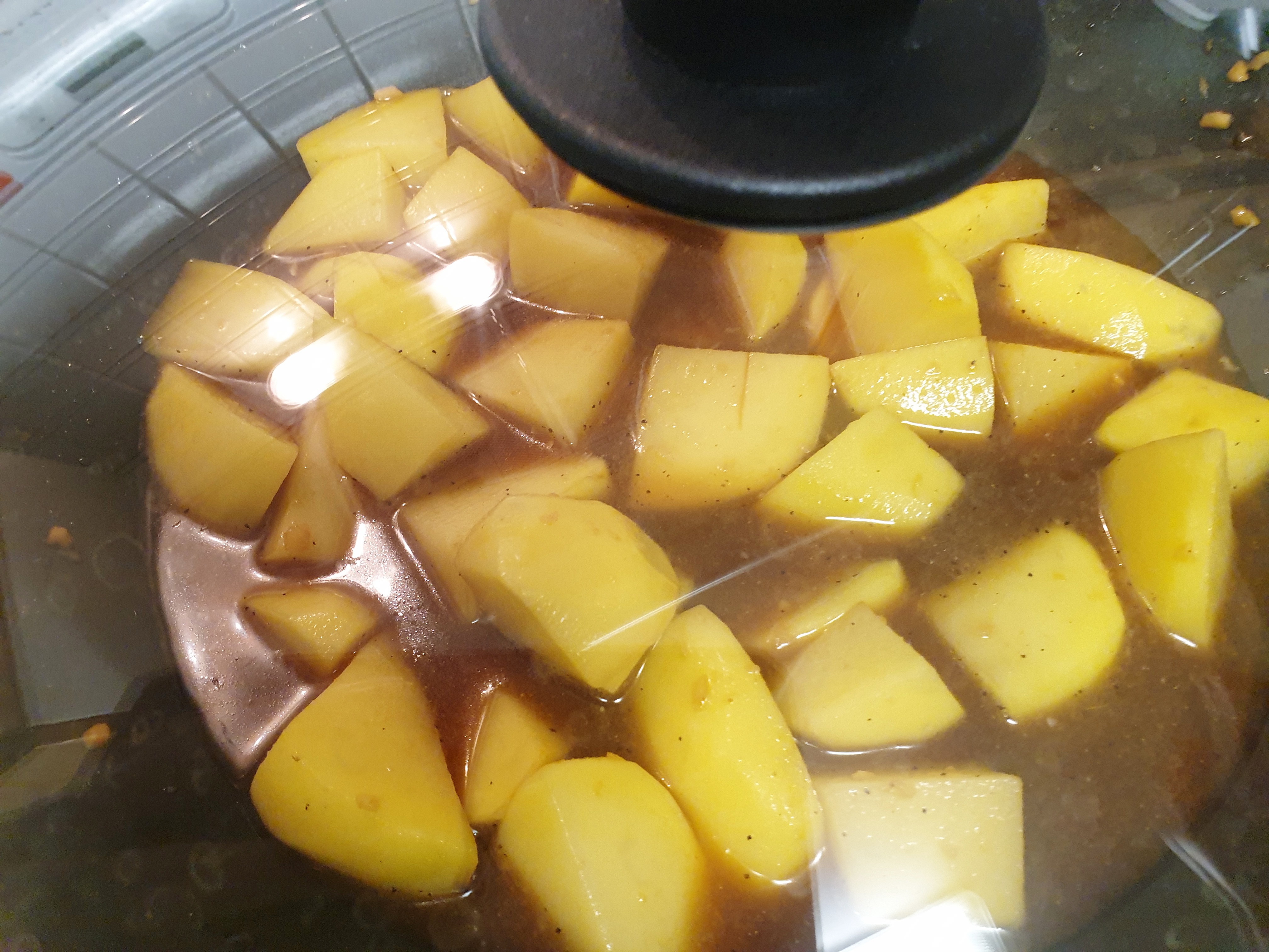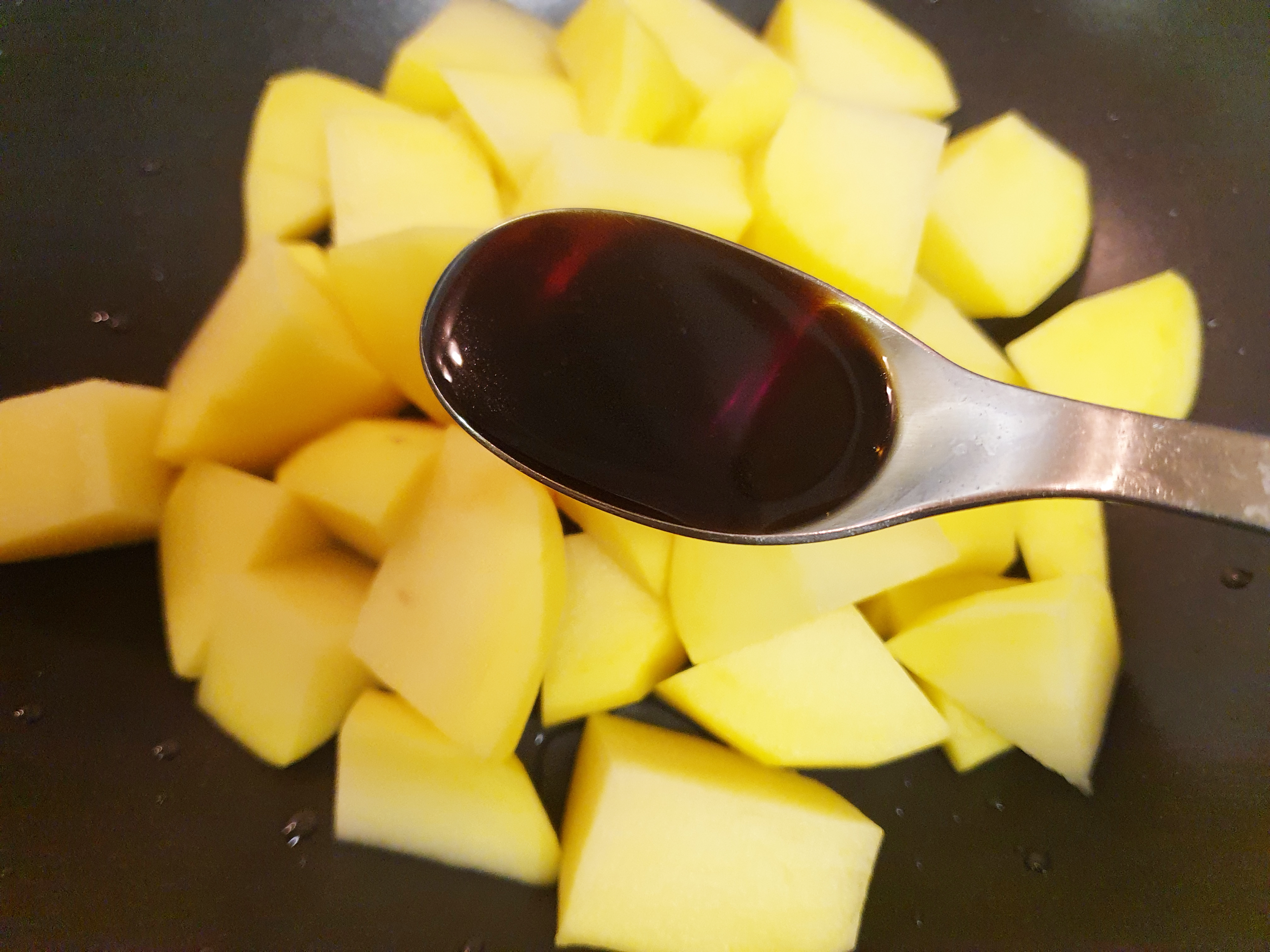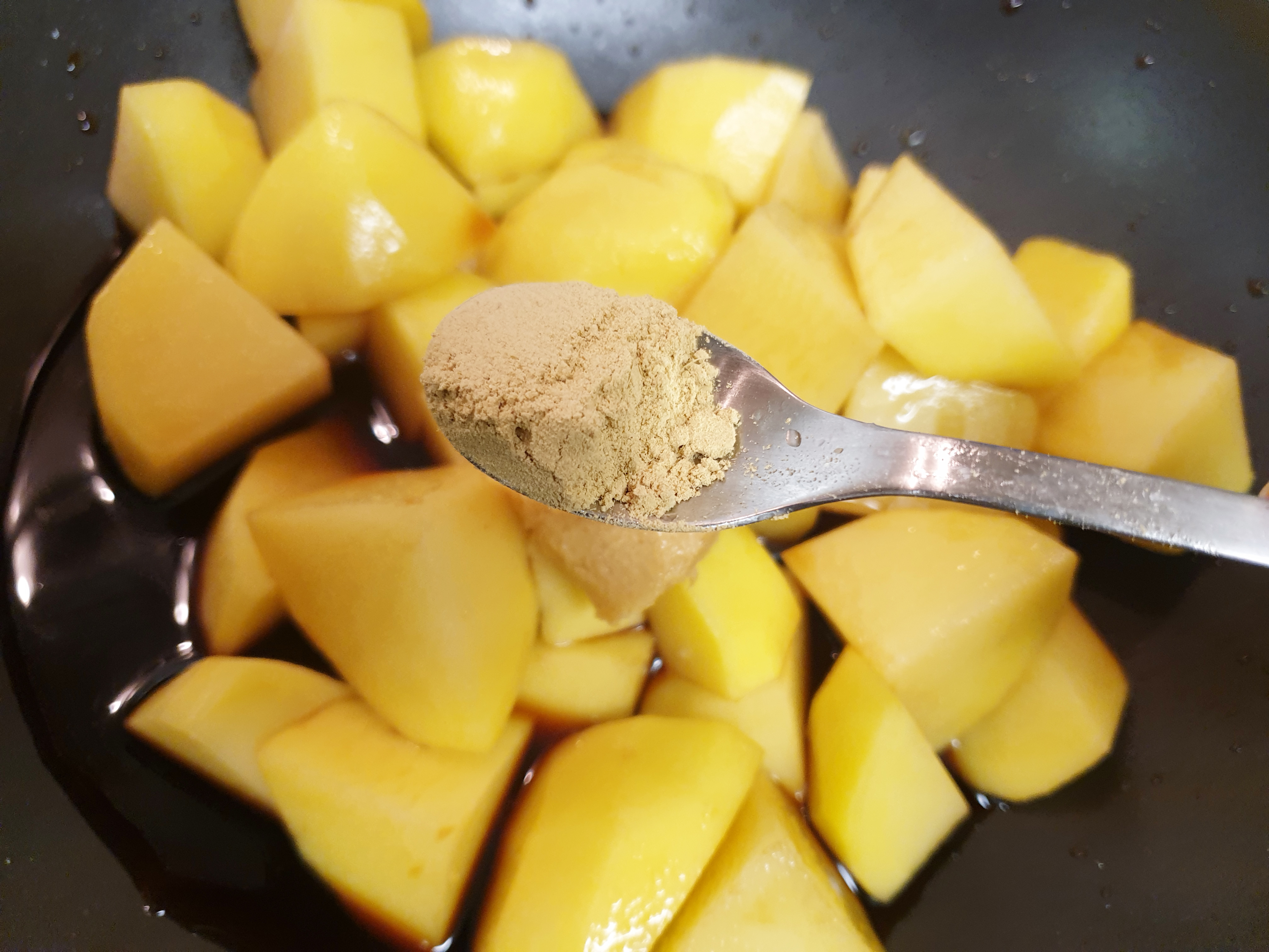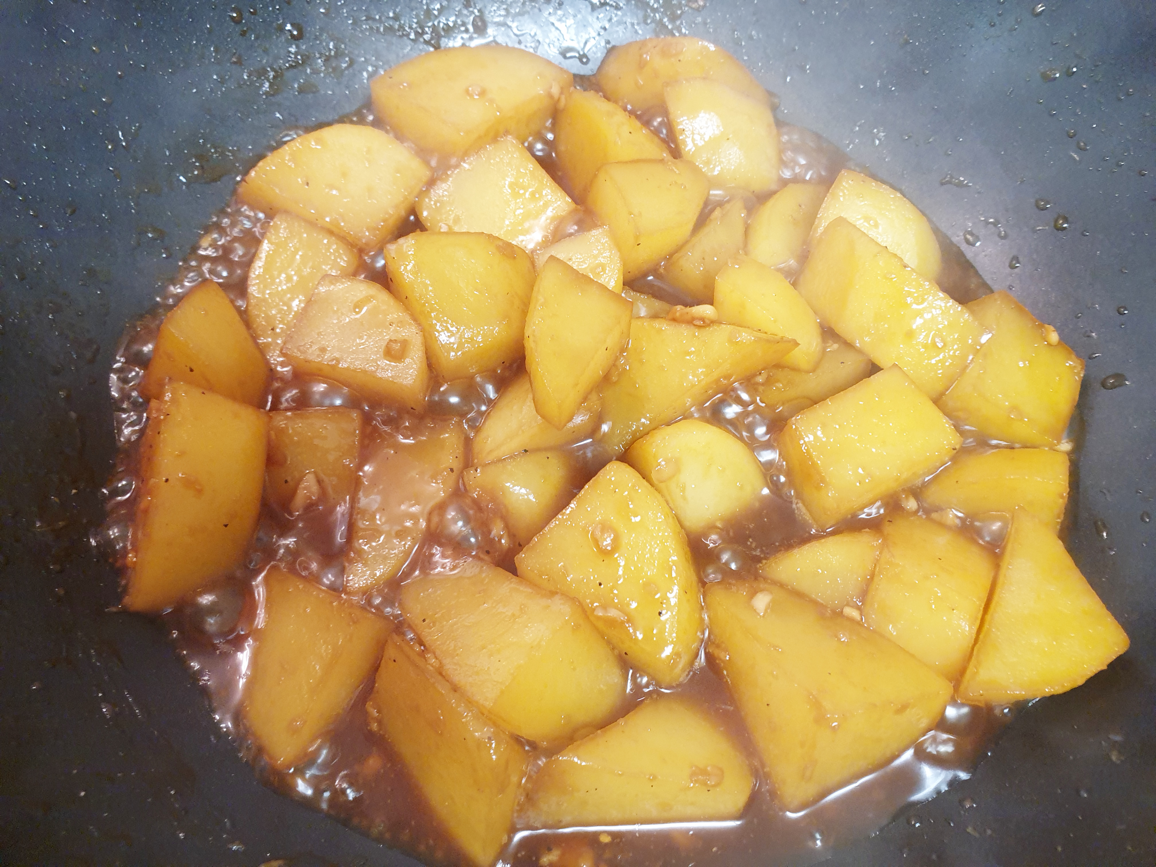 감자가 서서히 익어가고 완전히 졸여지기 전 불을 중간 불 보다 약하게 둡니다. 그리고 완전히 졸여주고 익혀주세요!