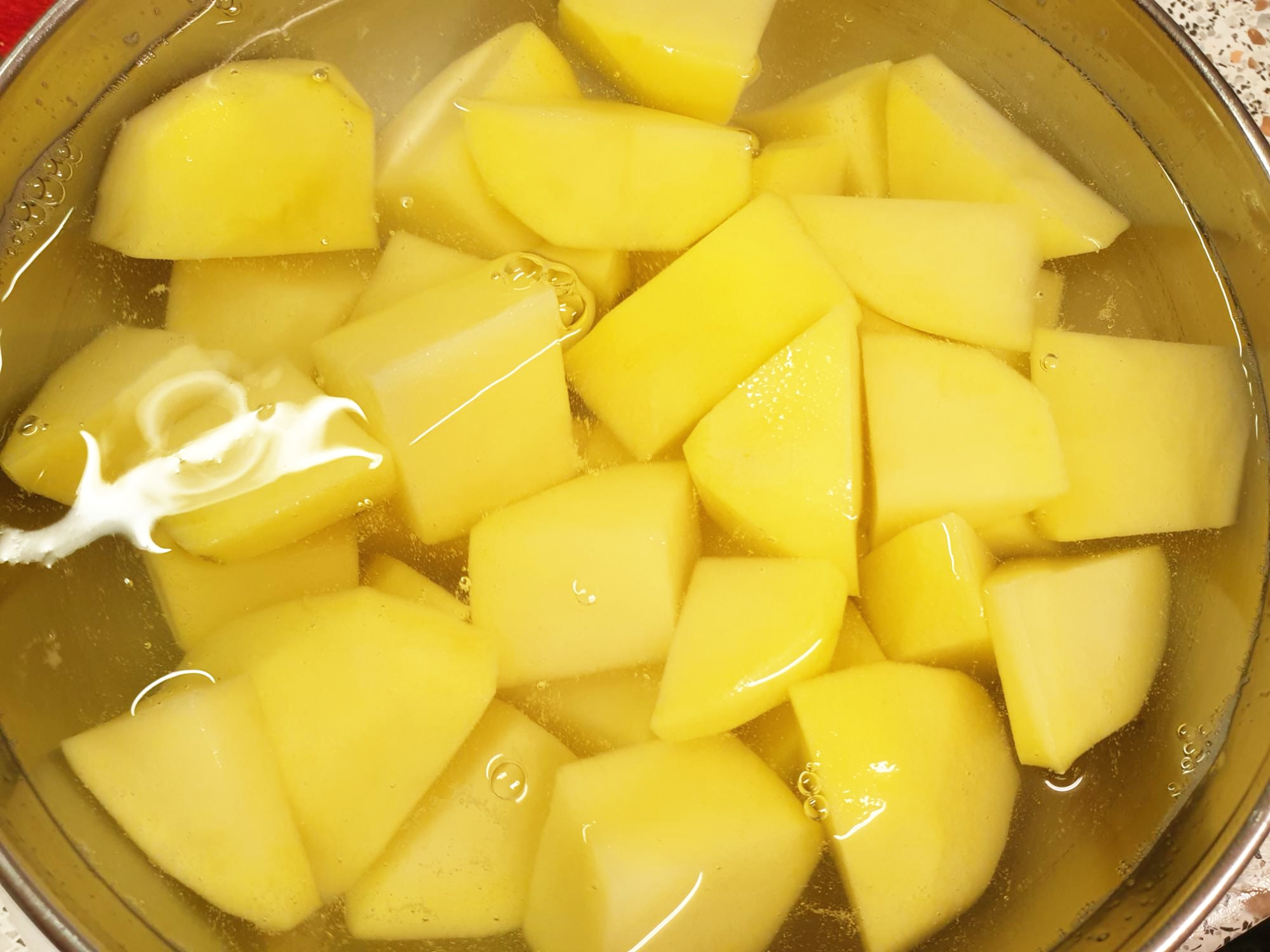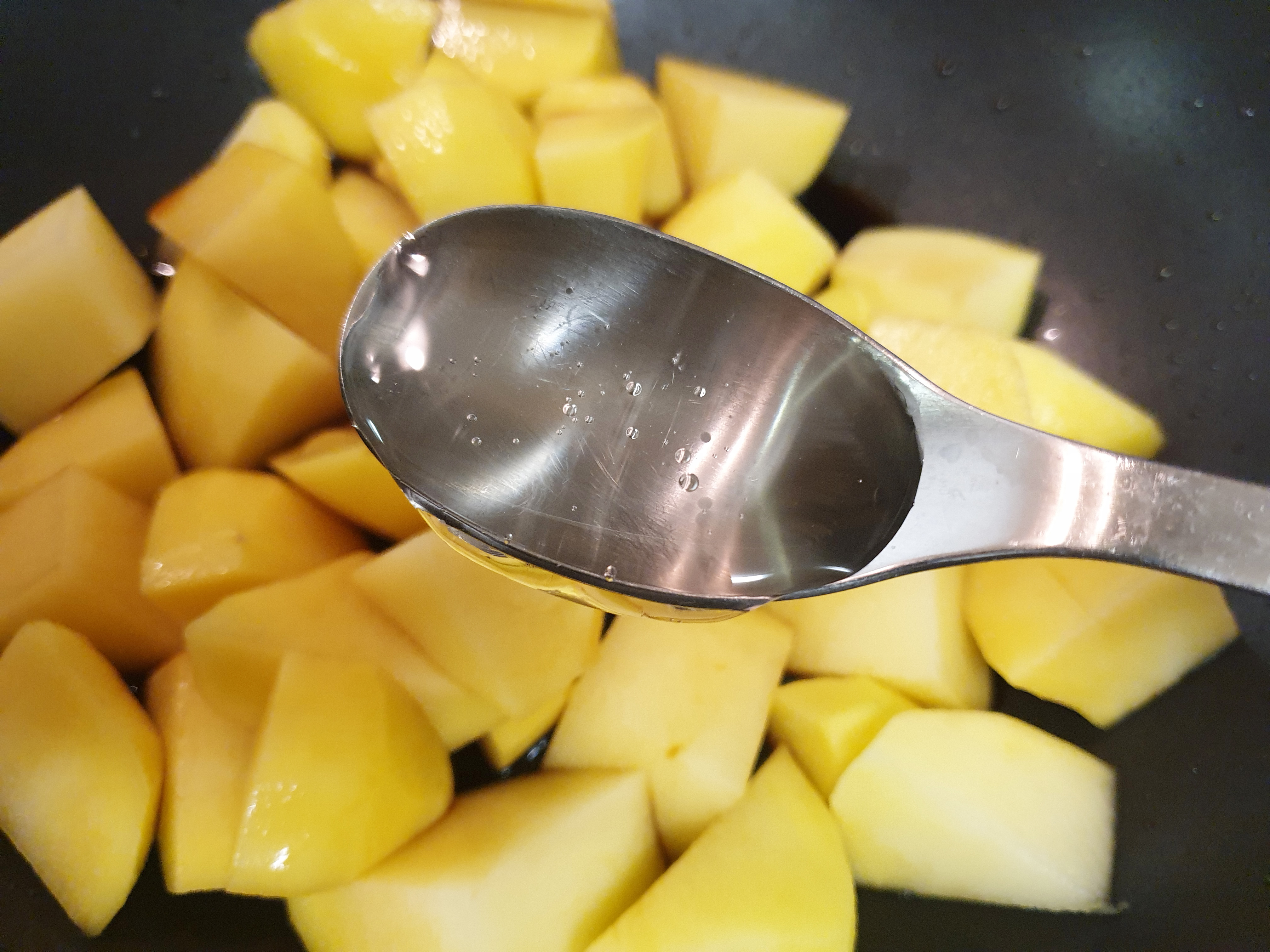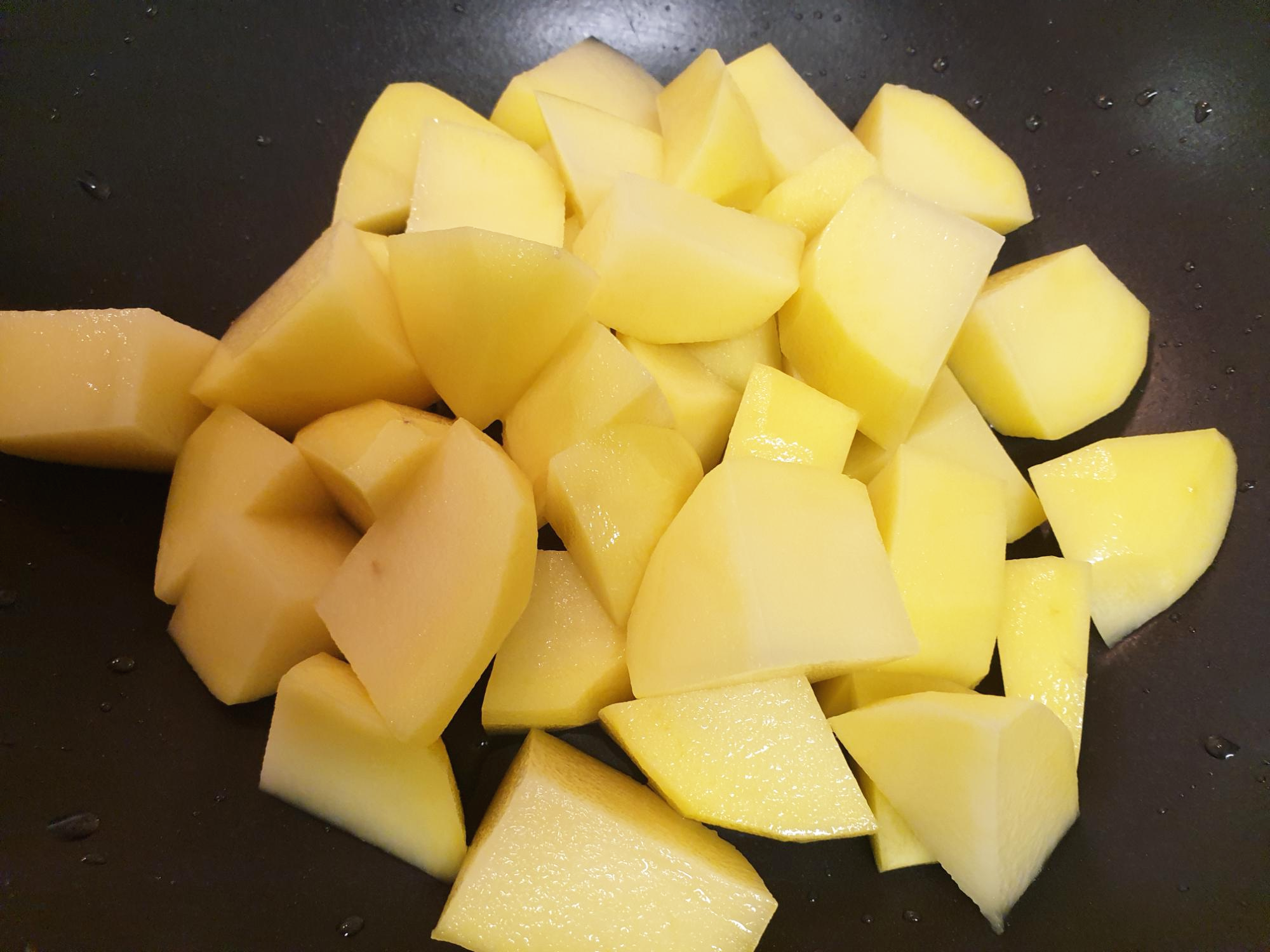 깨끗이 씻은 감자를 깍둑썰기를 해주세요 크기는 너무 작지 않게! 감자를 깍뚝썰기를 했다면 전분기를 빼기 위해서 물에 10분 이상 담가두고 헹궈줍니다 그다음 감자를 팬에 옮겨 담아주세요!