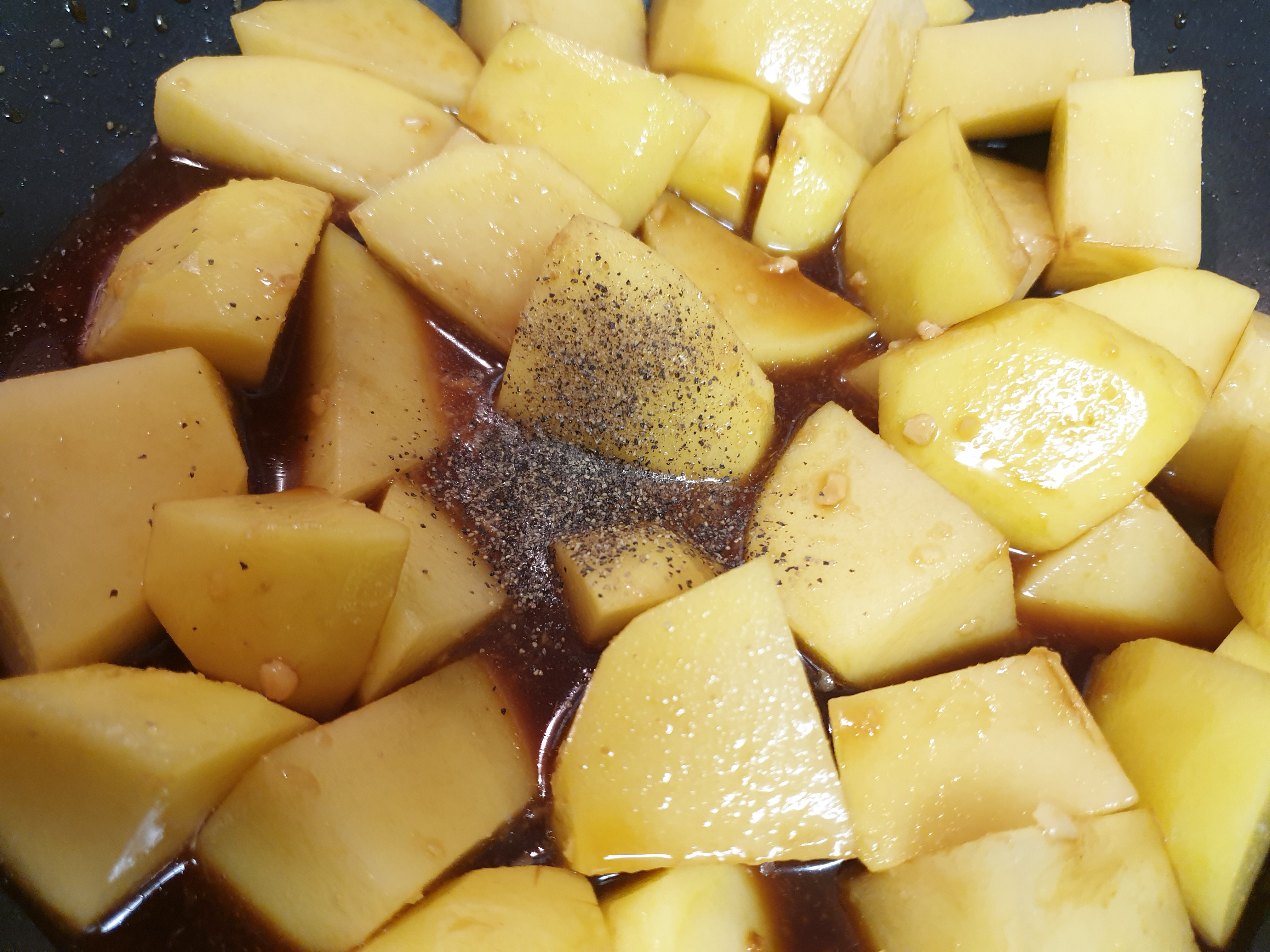 감자조림 양념을 할 차례! (감자 3개 기준) 간장 8스푼 , 올리고당 또는 물엿 1스푼, 설탕 3스푼, 다진 마늘 1스푼, 생강가루 또는 다진 생강 1 티스푼, 후추, 물 100ml를 넣어주고 불은 중간 불보다 센 불에 둡니다.