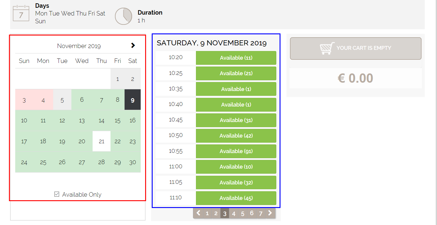 예약 날짜를 선택하고 시간선택 및 예약 가능 수 확인하세요! 원하는 날짜와 시간에 예약을 할 수 있다면 선택을 하고 다음으로!
