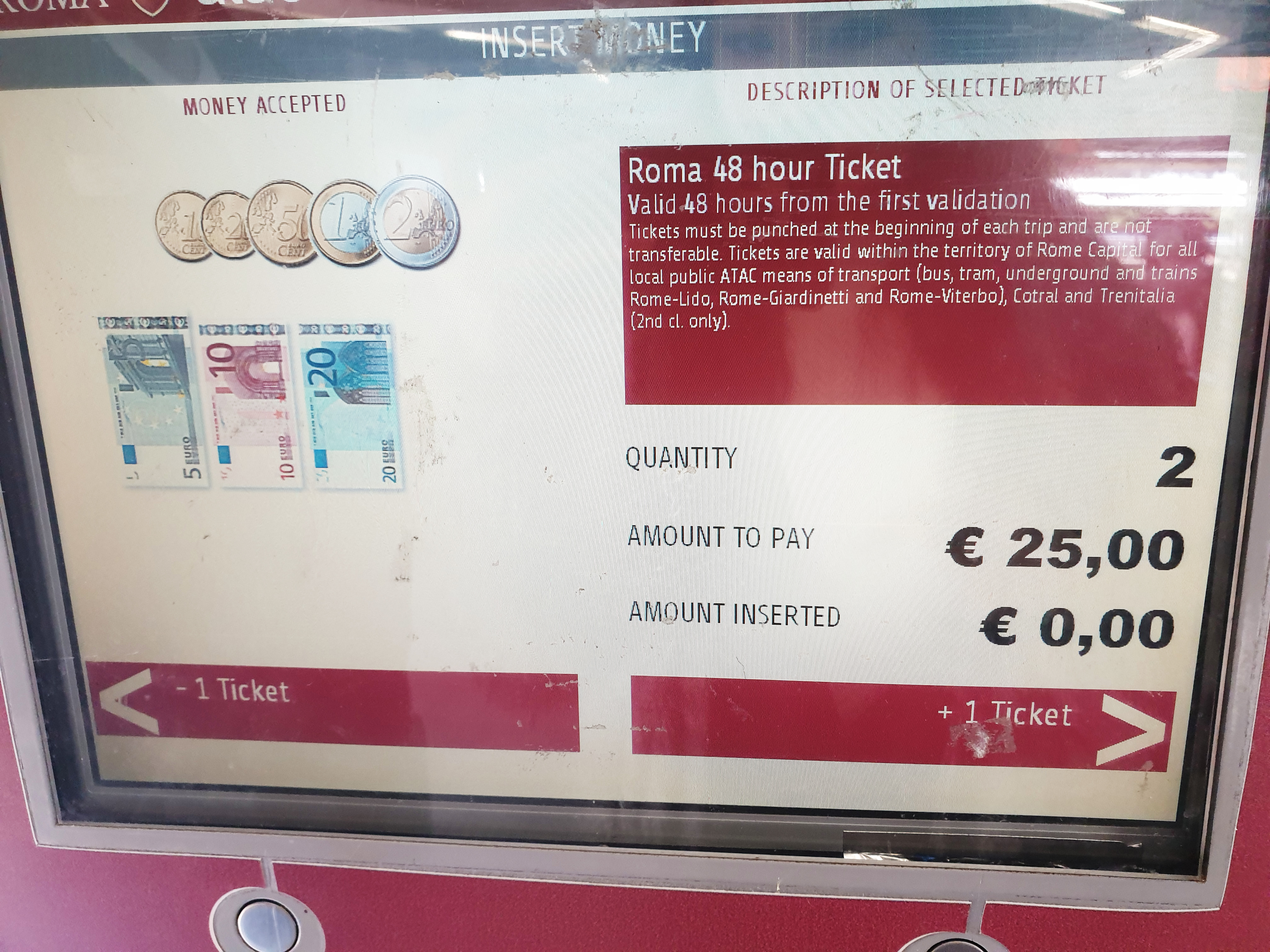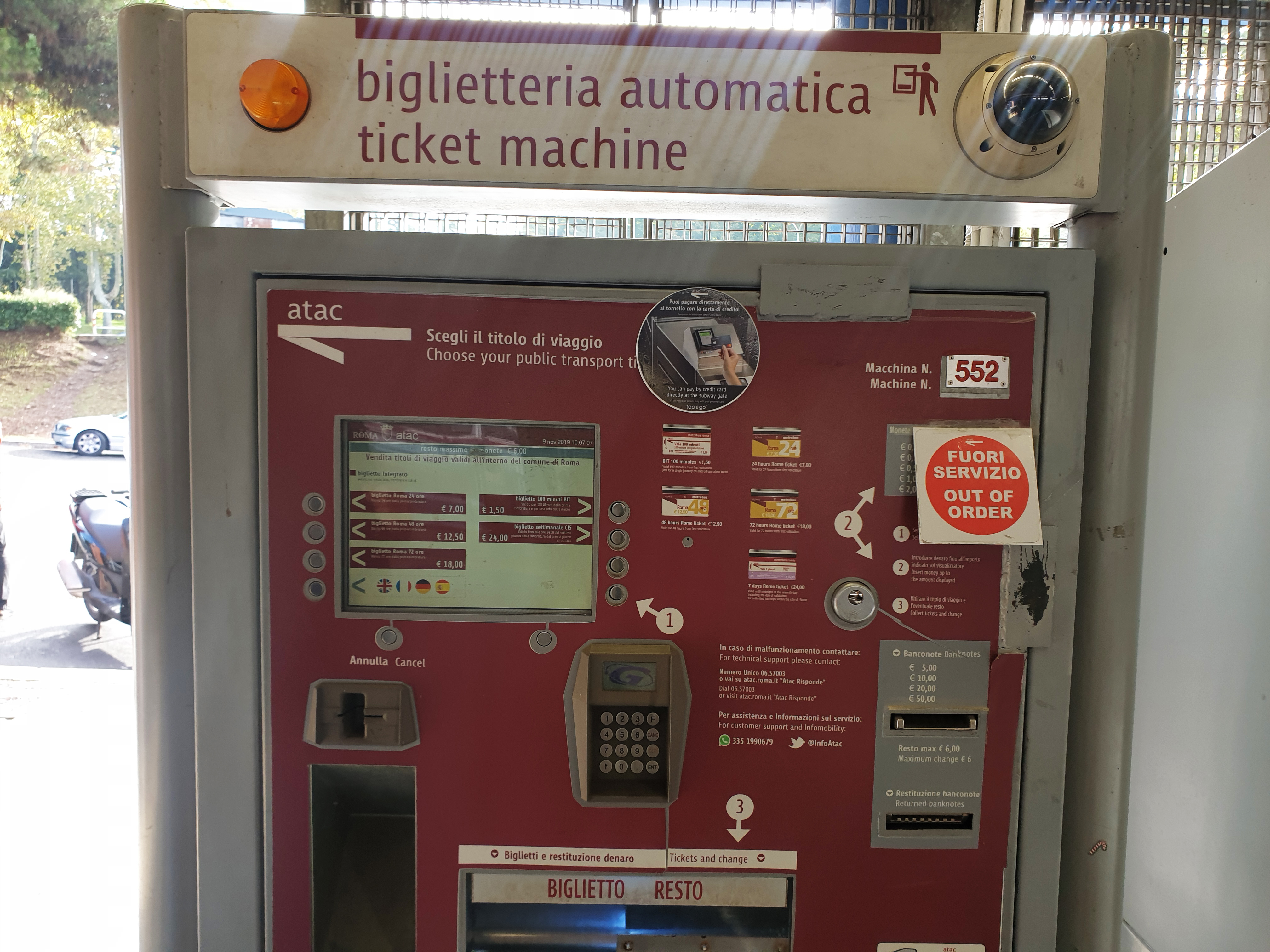 지하철 역으로 가면 티켓머신을 볼 수 있을 거예요! 로마 교통권 1회 권부터 일주일권까지 다양하게 있습니다.(지하철역 외에 티켓을 구매할 수 있는 곳은 담배가게나 신문 가판대에서 구매할 수 있다고 합니다.)
