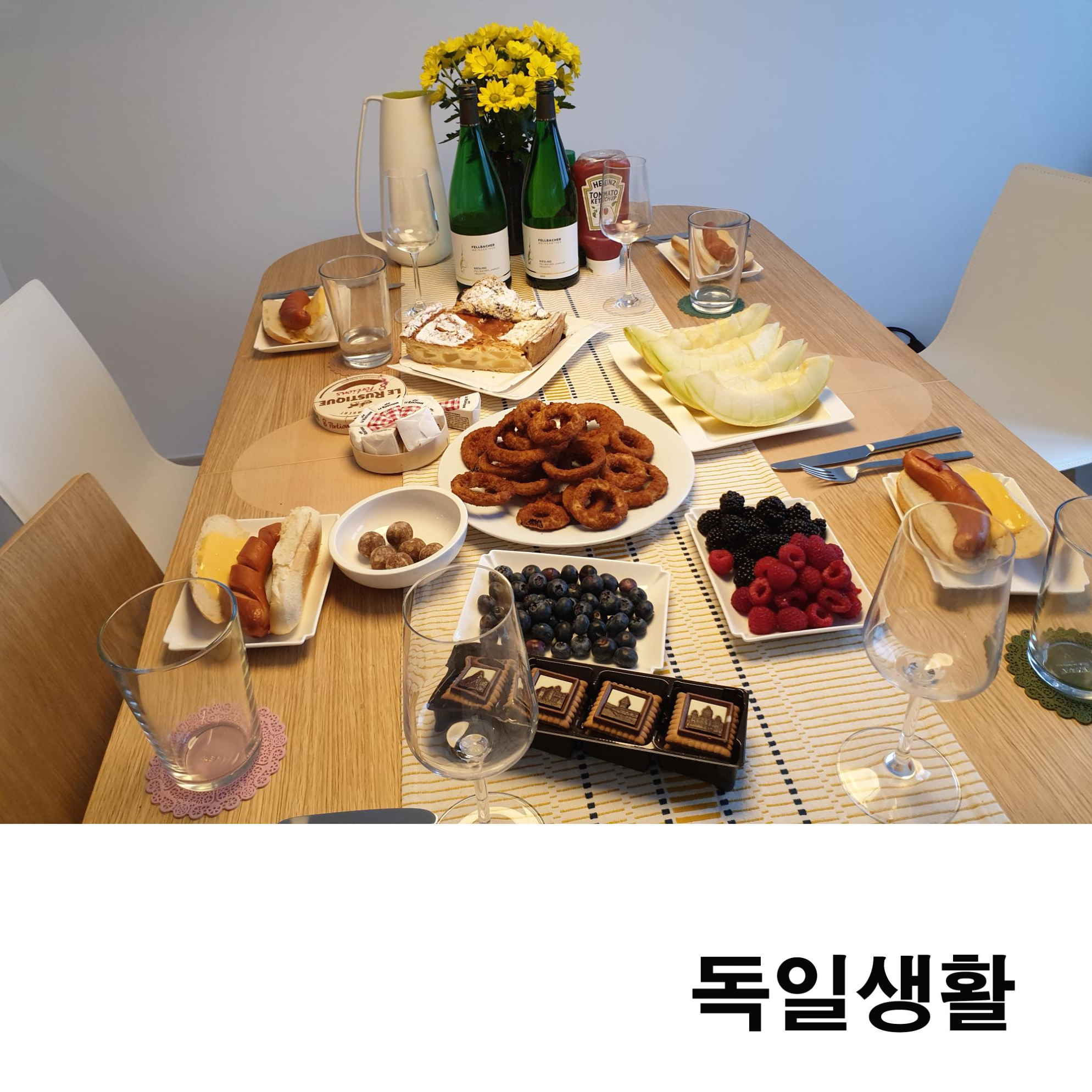 오늘은 독일에서의 일상을 포스팅하려고 해요~ 며칠 전 독일에서 알게 된 동생집에 초대를 받아서 놀러 갔는데 집 인테리어가 너무 이쁘더라고요~ 이쁜 공간에서 각자 가져온 음식들을 모아 차려보니 분위기 있는 멋진 상차림 되었어요 ㅎㅎ 손님 초대상차림으로도 재격인 것 같아요, 가끔 친구들과 모여서 분위기 있는 식사 시간을 가질 때 이렇게 차려놓고 먹으면 좋을 것 같아서 공유해요~