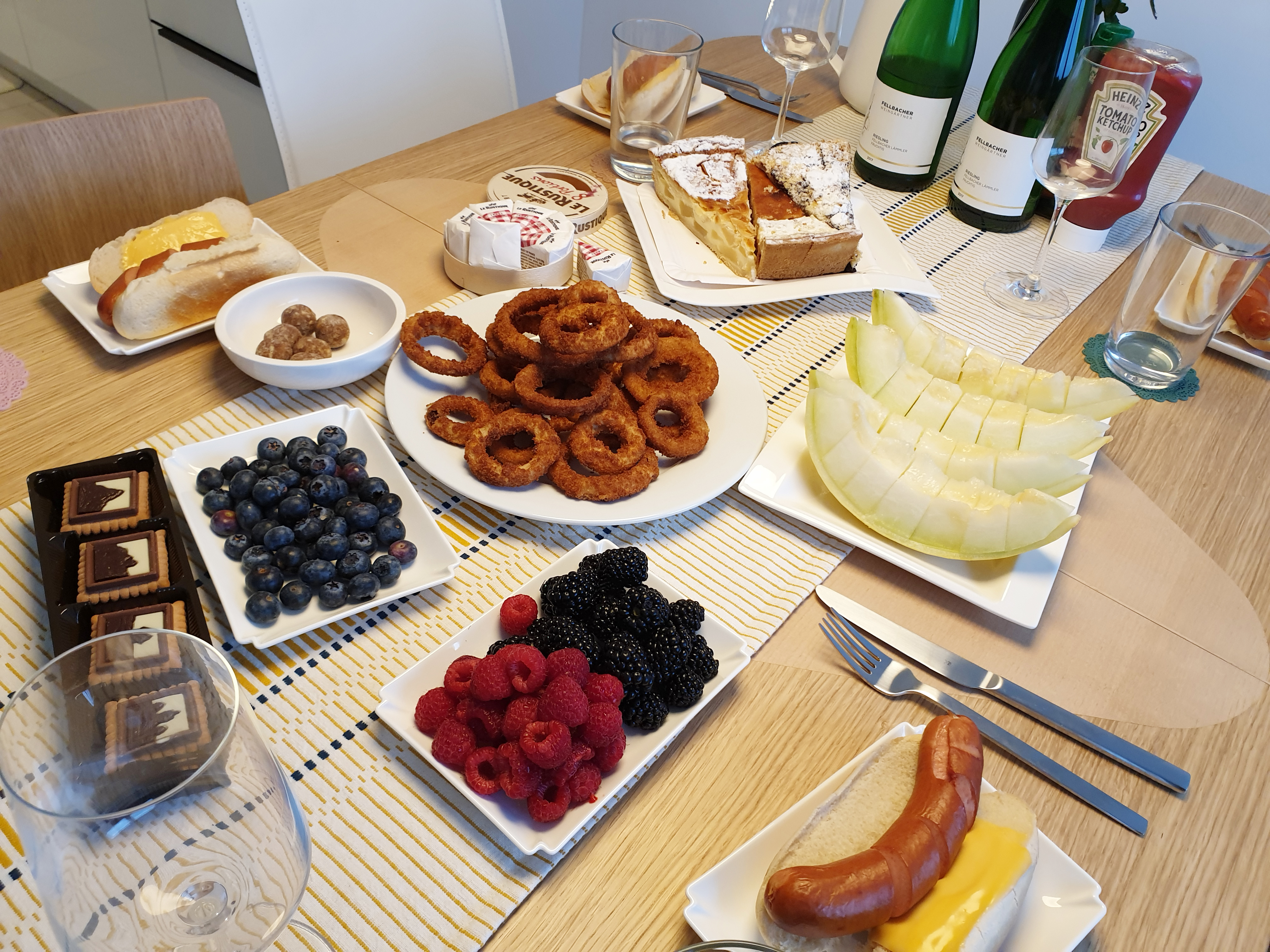 각자 가져온 핫도그, 과자, 과일, 치즈, 멜론, 조각 케이크, 베리류 등 다 차리고 보니 분위기 있고 먹스러운 상차림이 완성됐어요 ㅎㅎ 이때는 이른 시간에 만나서 아침 식사를 해결할 수 있는 음식들로 가져왔는데 여자 넷의 마음이 잘 맞았던 것 같아요 ㅎㅎ