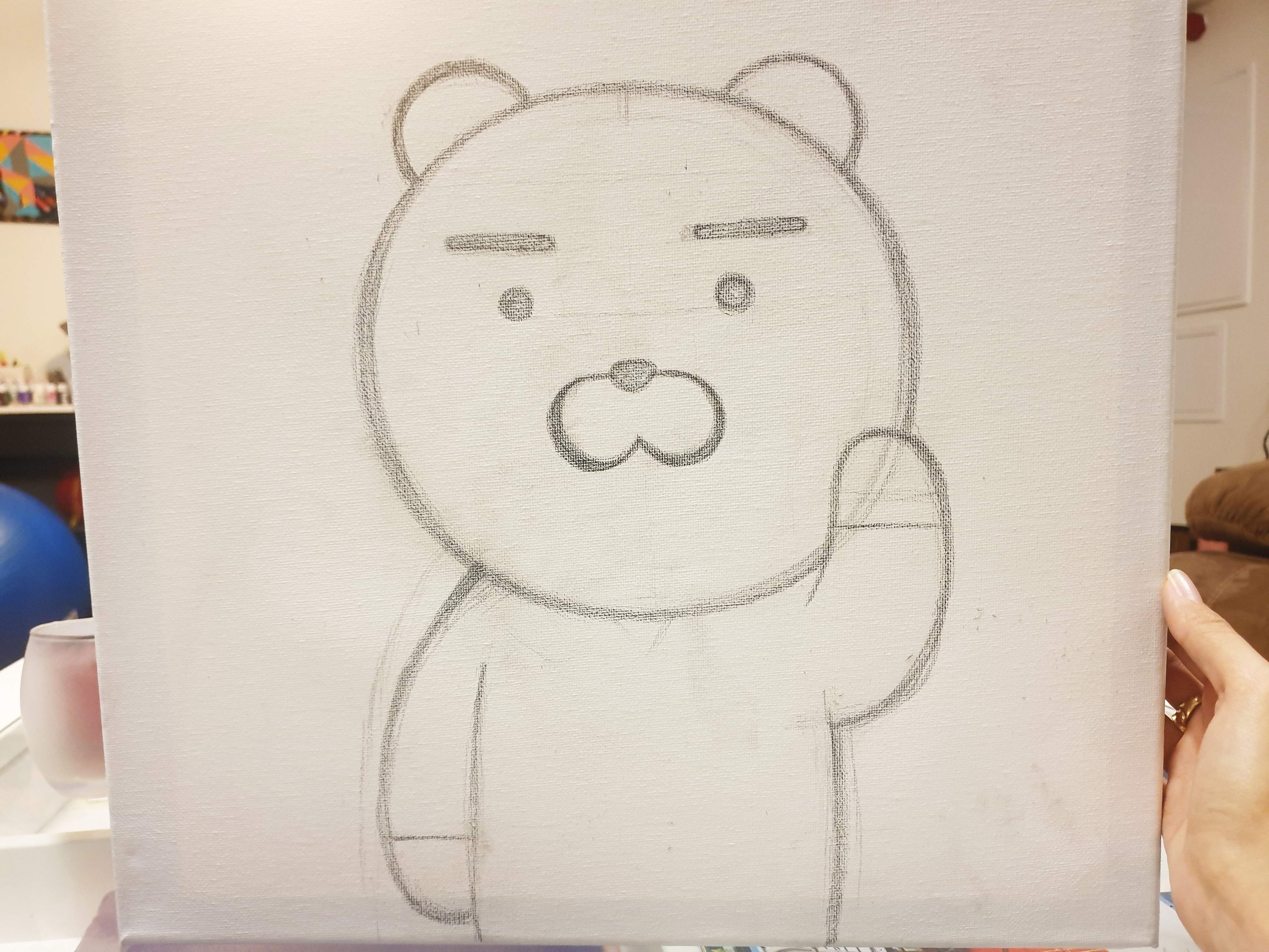 가로세로 30cm 정도 되는 캔버스에 카카오프렌즈 라이언 밑그림을 그렸어요~ 보기에는 쉬워 보였는데 생각보다 어렵더라고요~ 그래서 밑그림 그리는데 1시간 30분 정도 걸렸던 것 같아요~