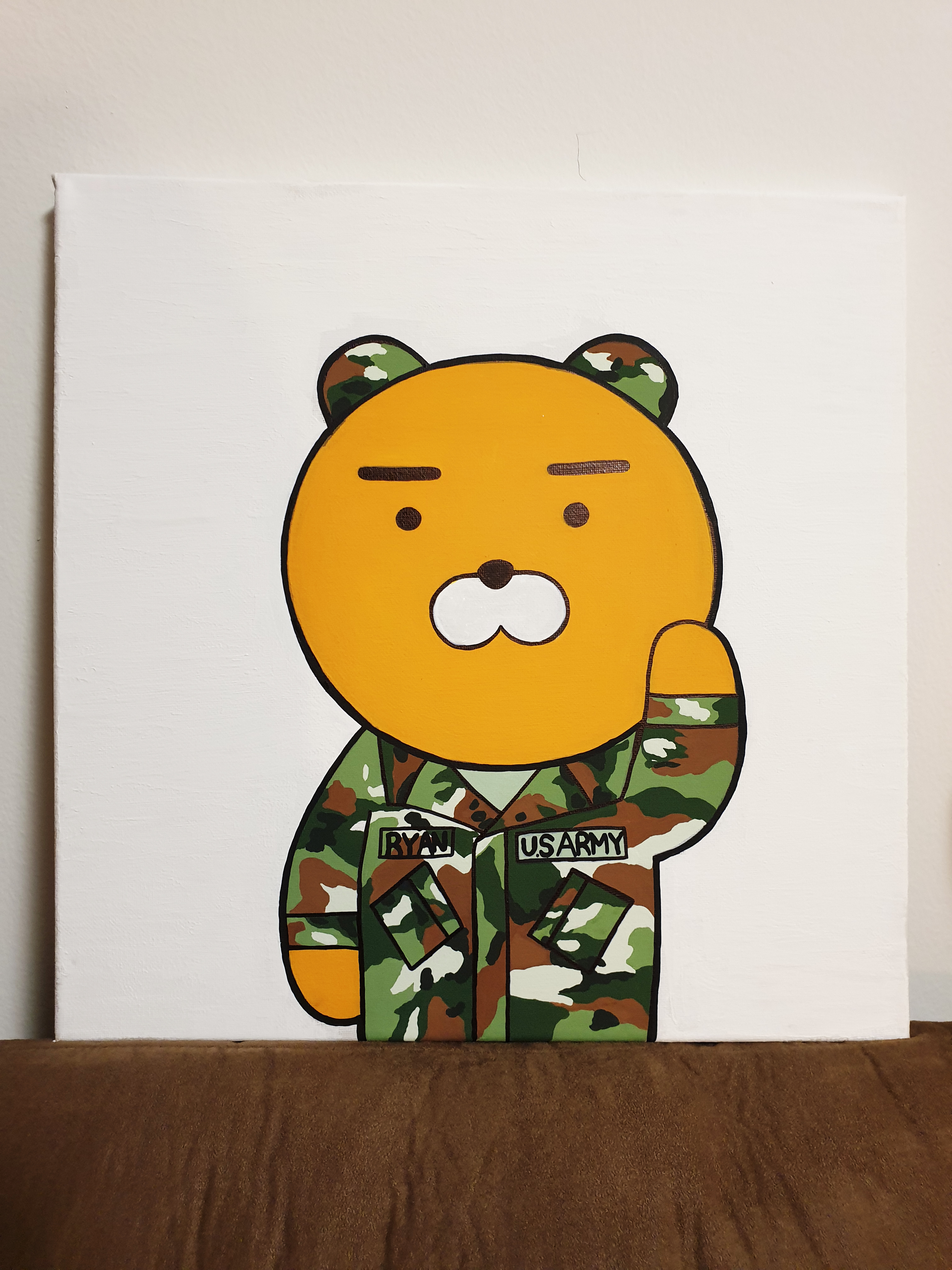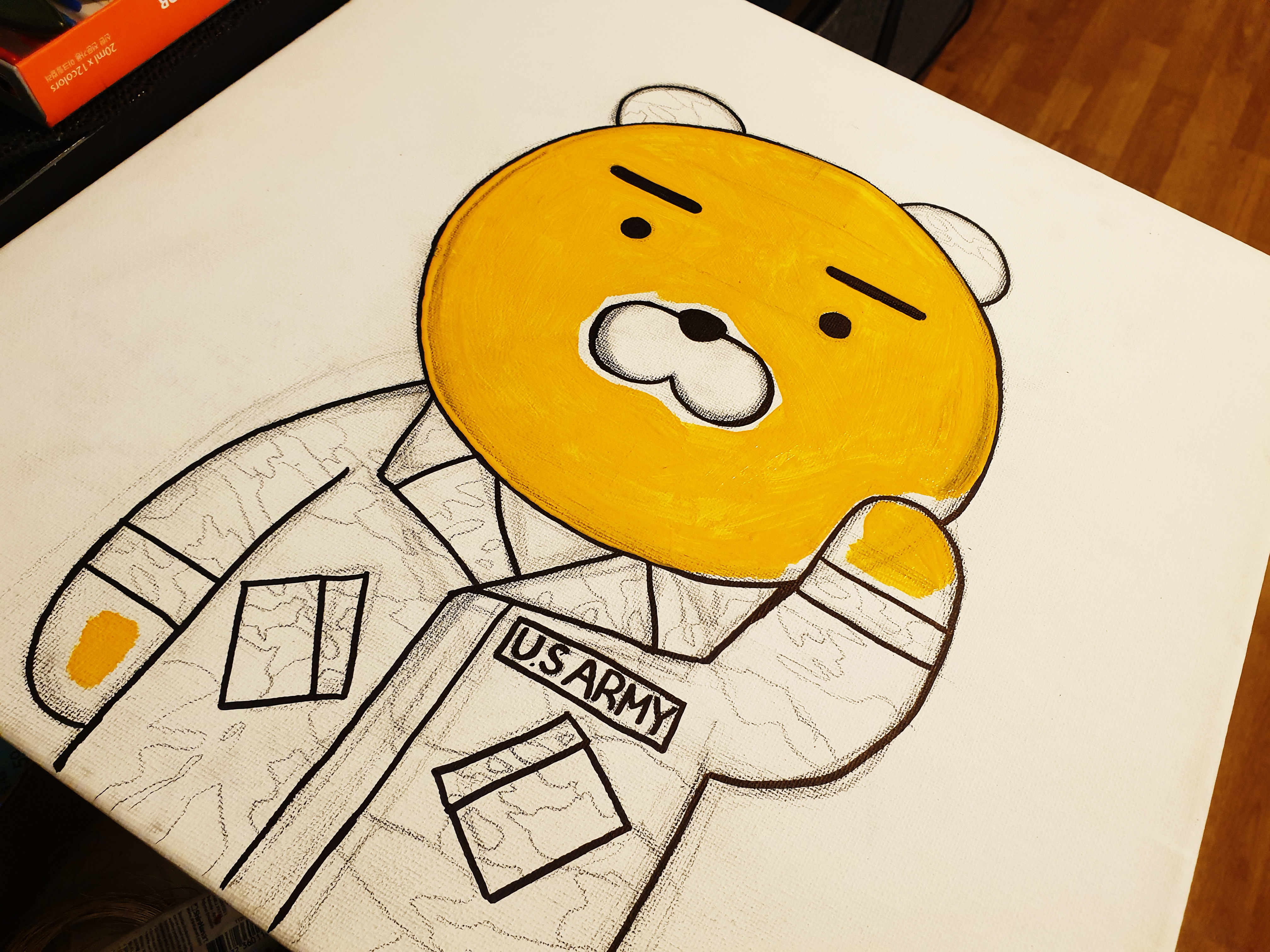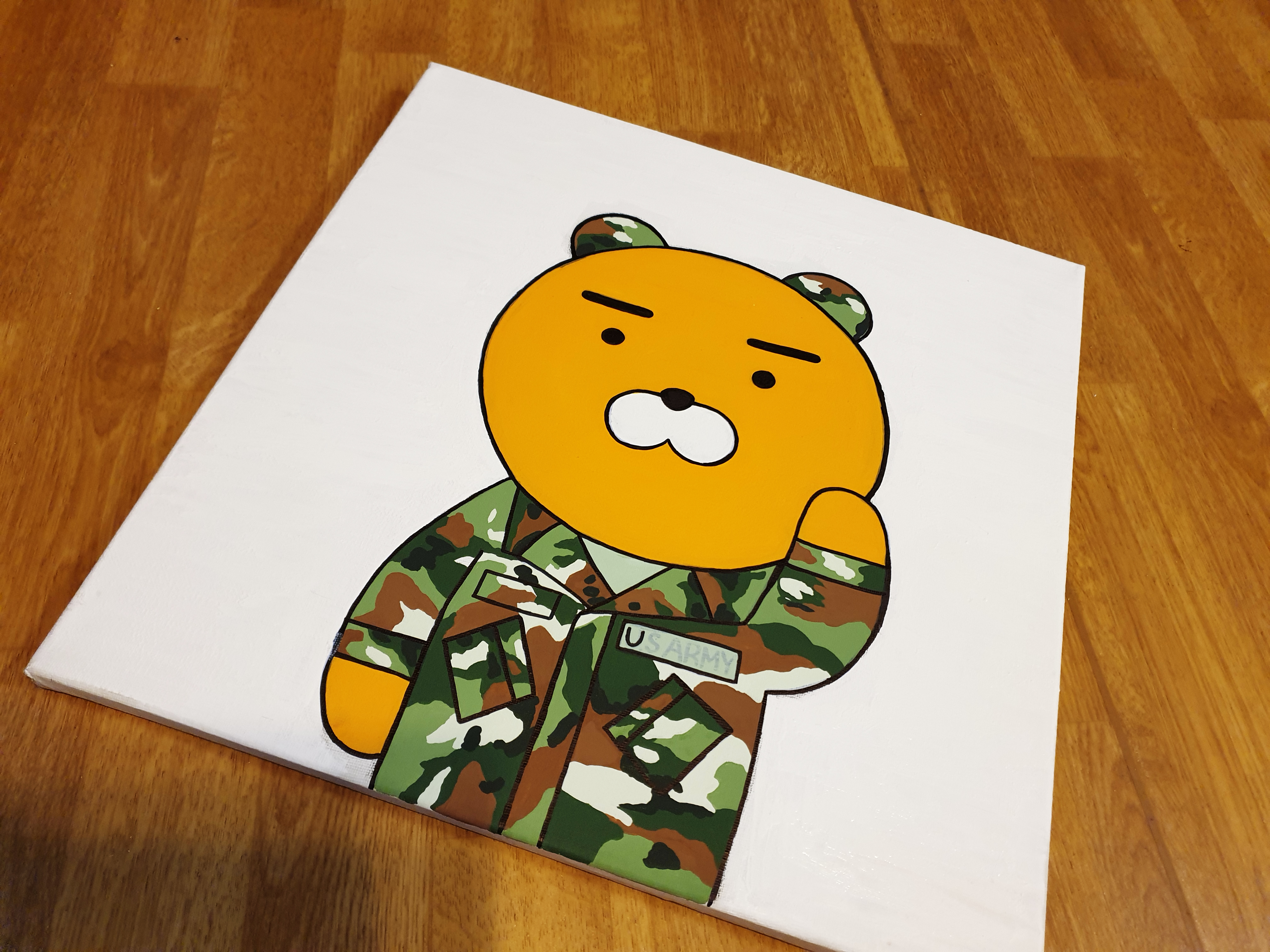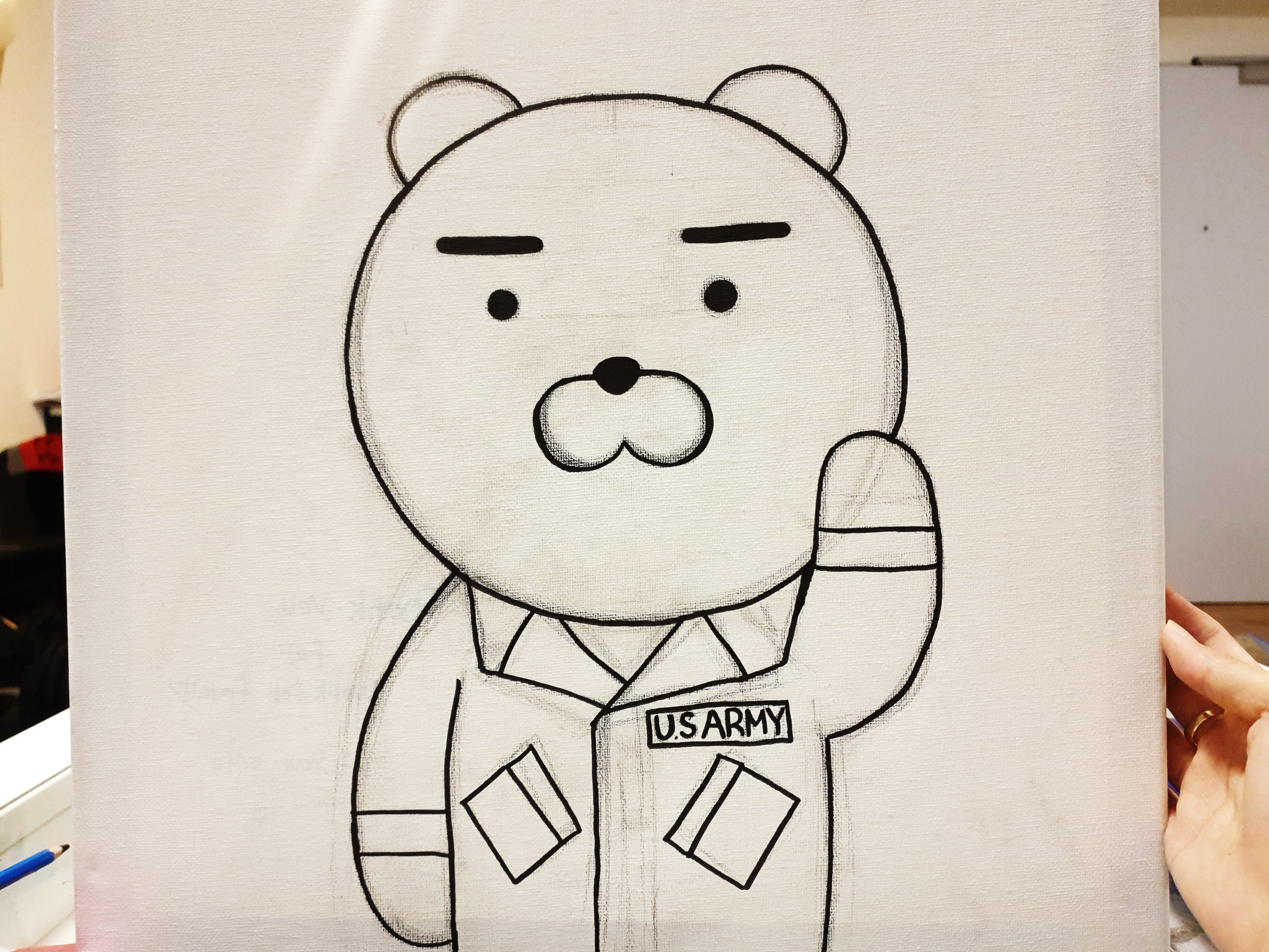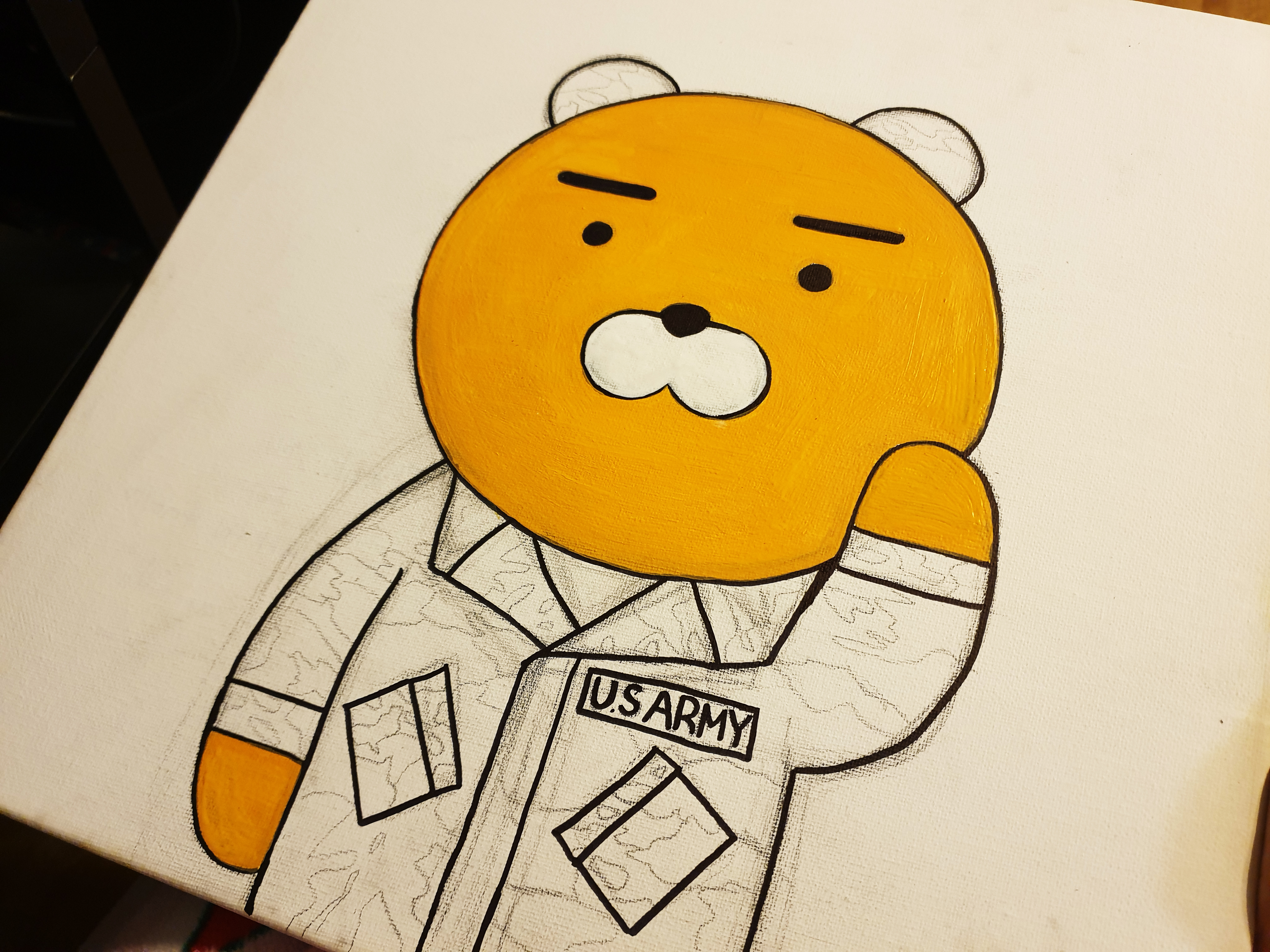 남편에게 줄 성의 있는 크리스마스 선물로 어떤 게 좋을까 고민하다가 남편이 좋아하는 카카오프렌즈 라이언 팝아트를 선물해주기로 결정했어요~ 남편과 이름이 같아서 카카오프렌즈를 사랑하더라고요~ㅎㅎ 남편 직업이 군인이라 군복을 입은 라이언 팝아트를 그렸습니다. 라이언 그리기 시작!