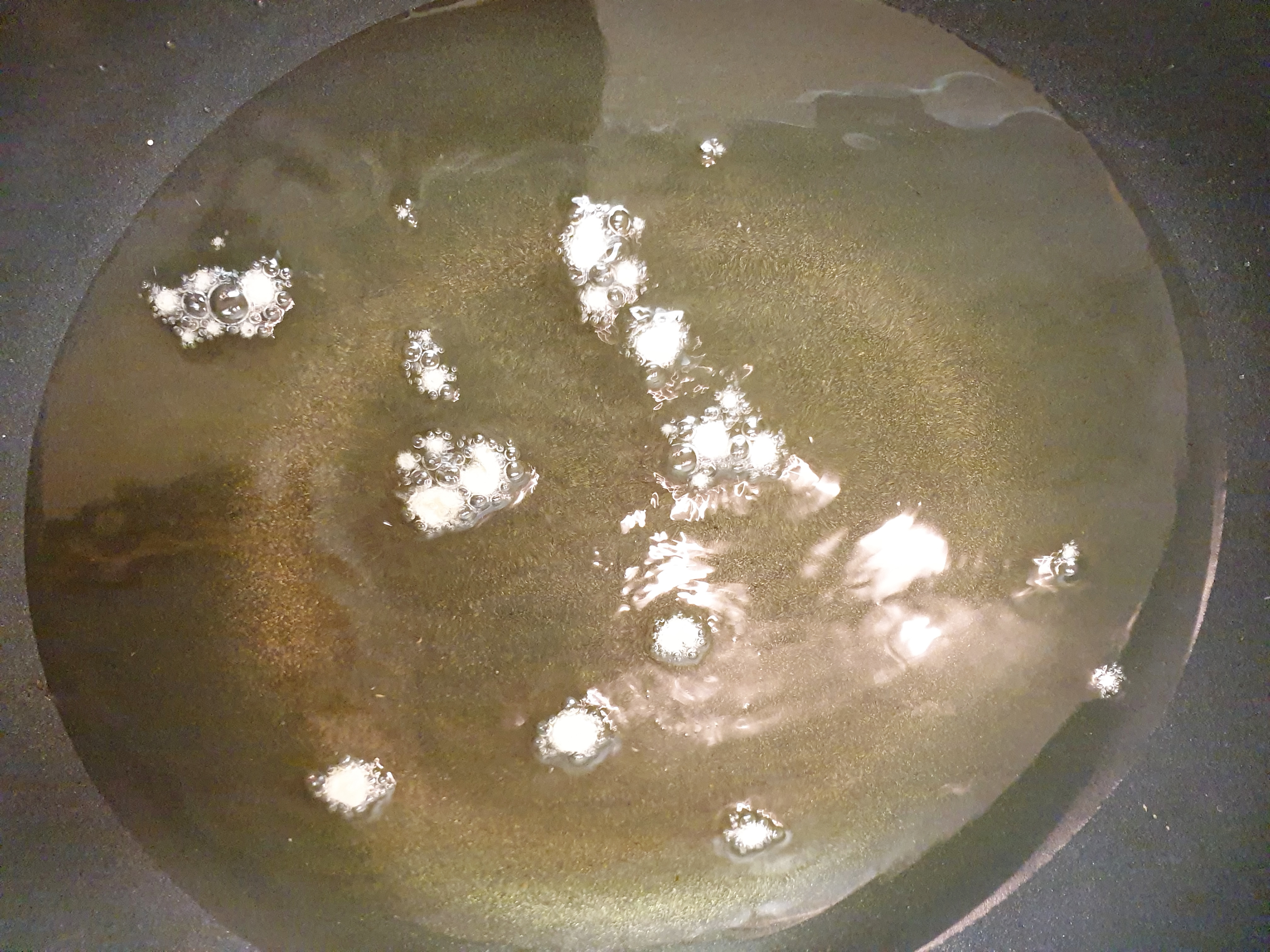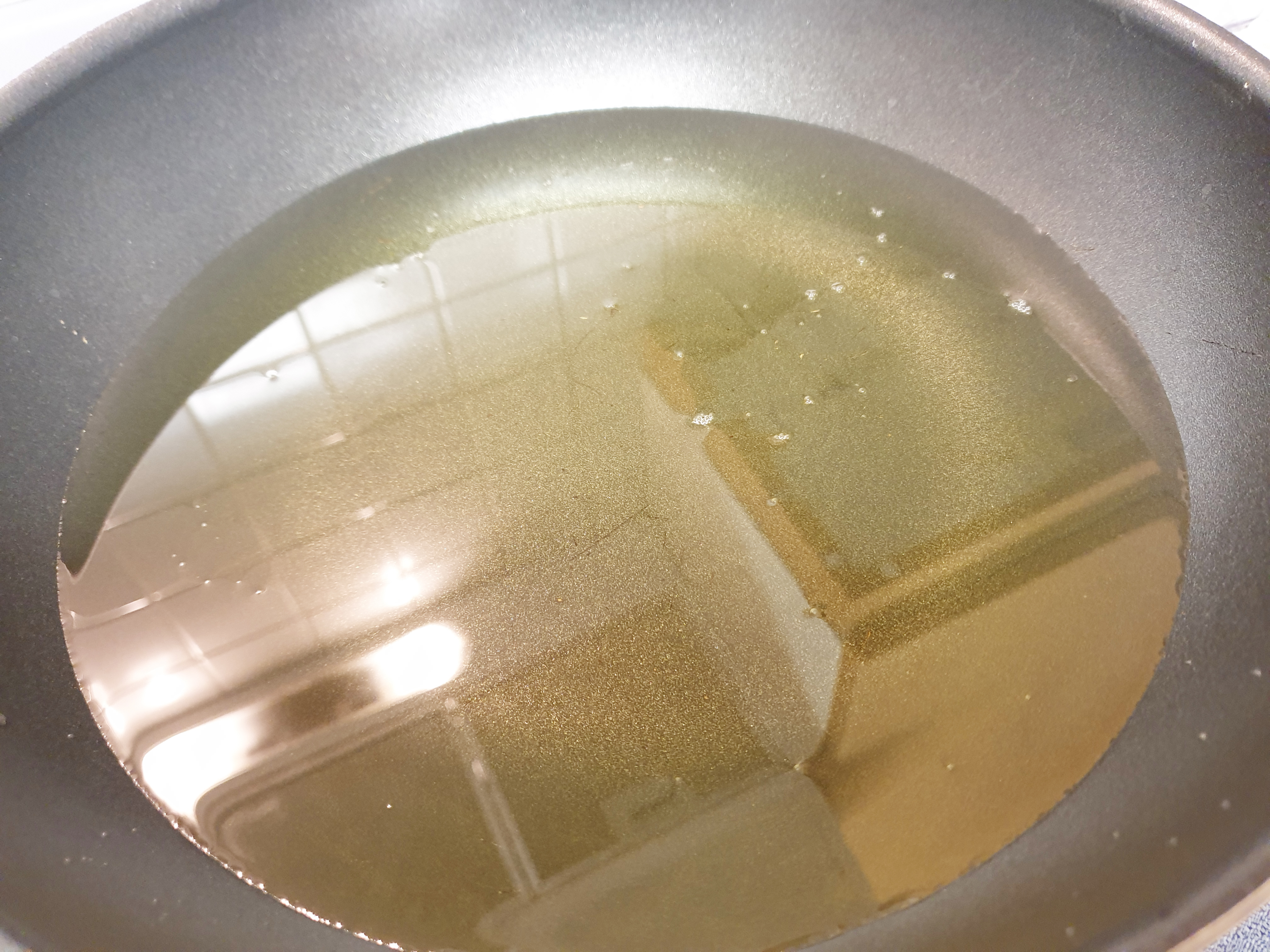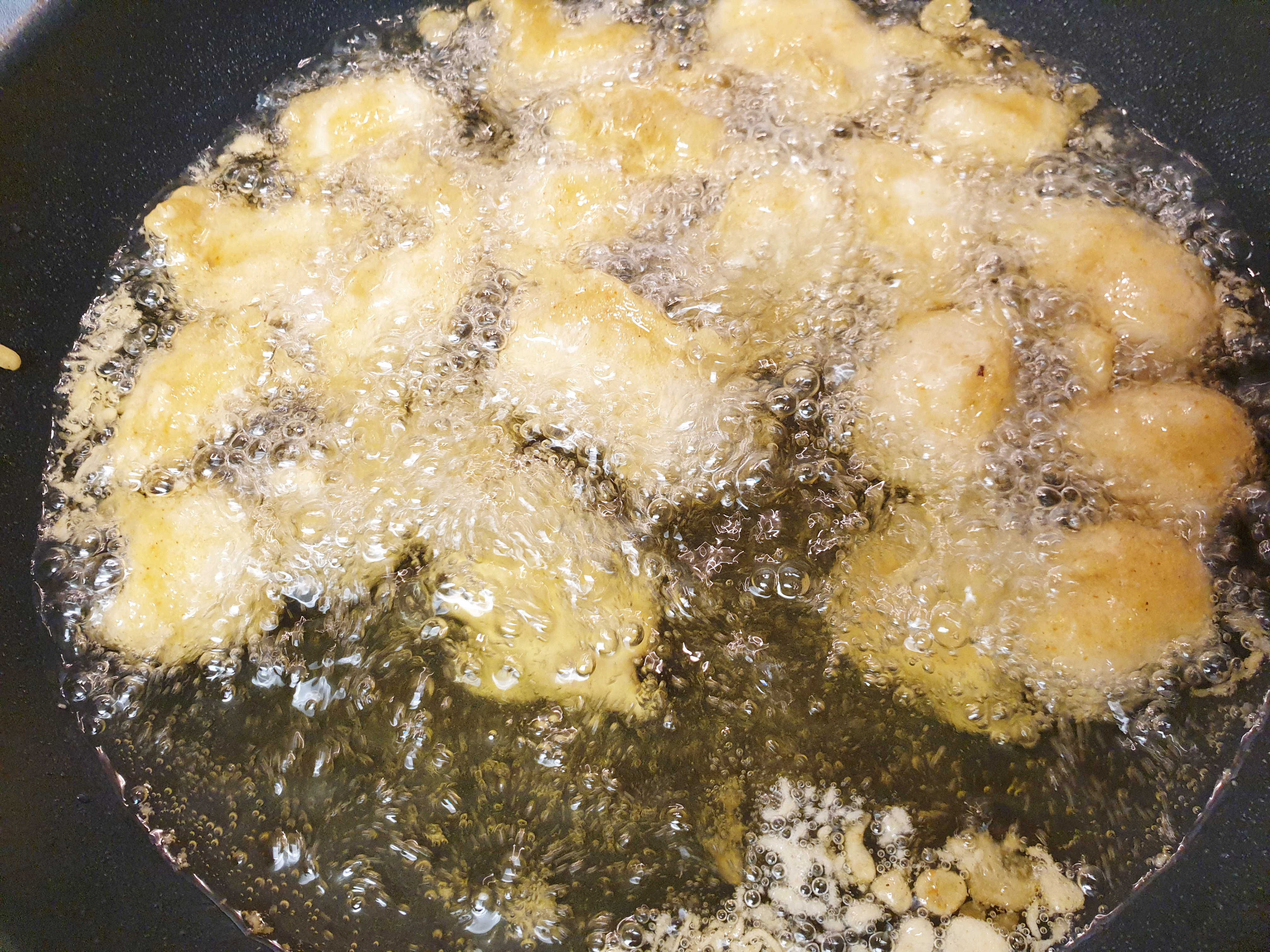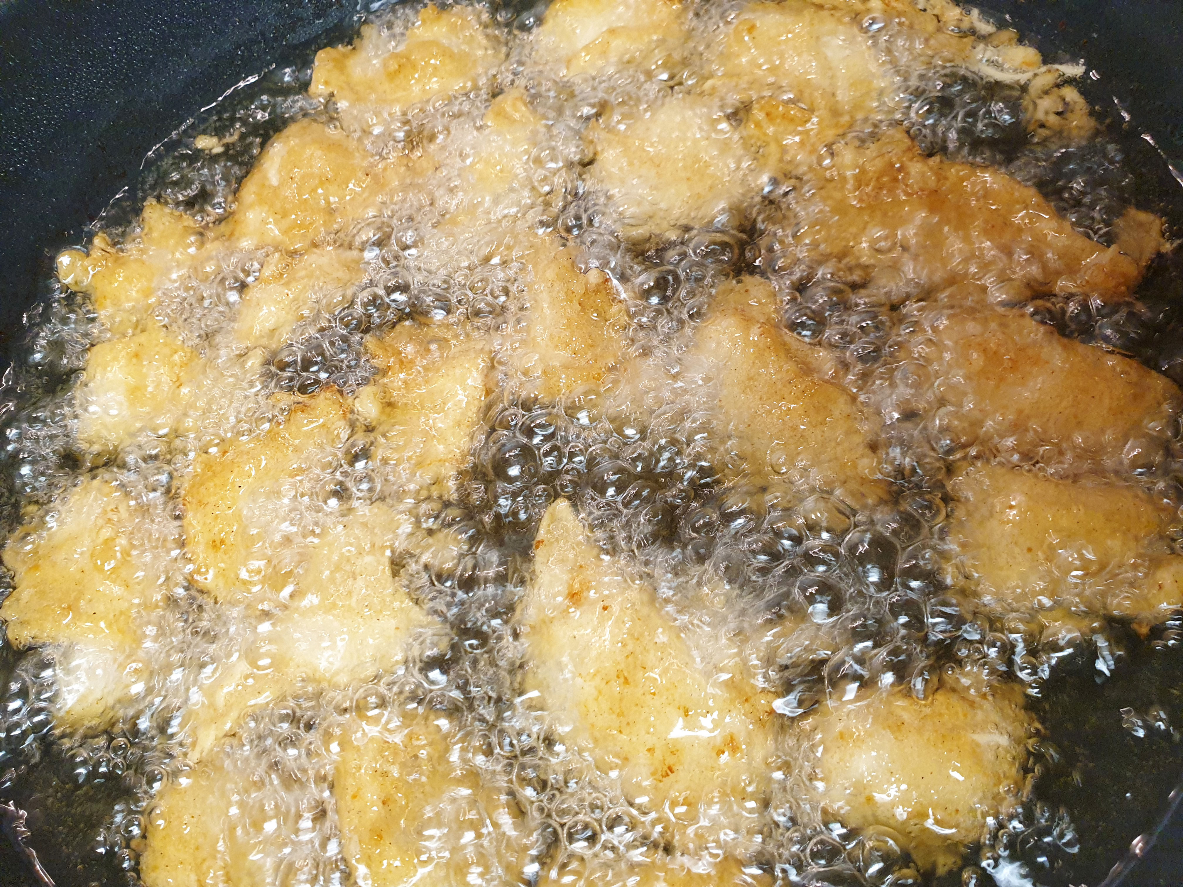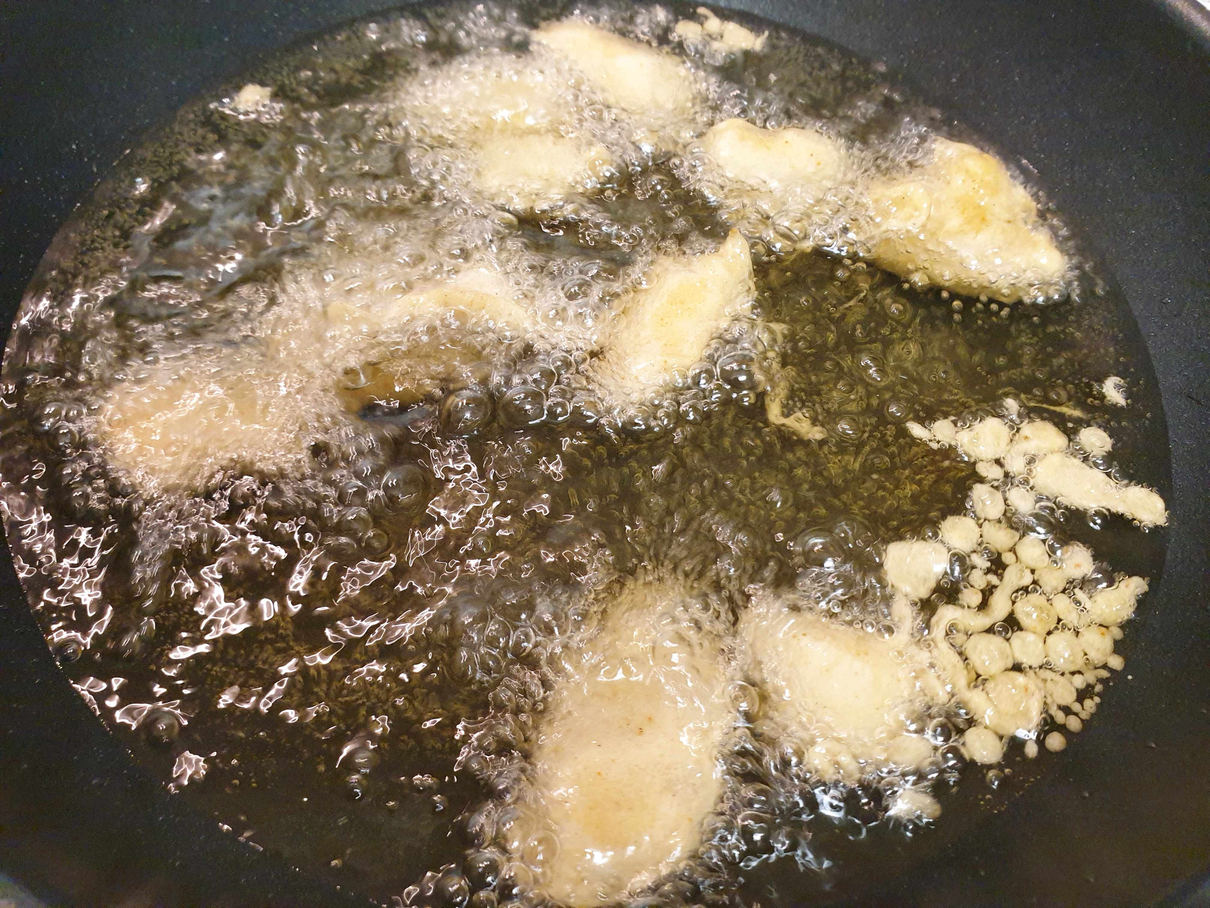 4. 식용유를 팬이나 냄비에 부어준 후 (닭이 충분히 잠길 정도로) 불은 중간 불과 샌불 사이에 둡니다. 식용유를 달궈 준 후 반죽을 조금 넣어서 기름이 충분히 달궈졌는지 확인해주세요!