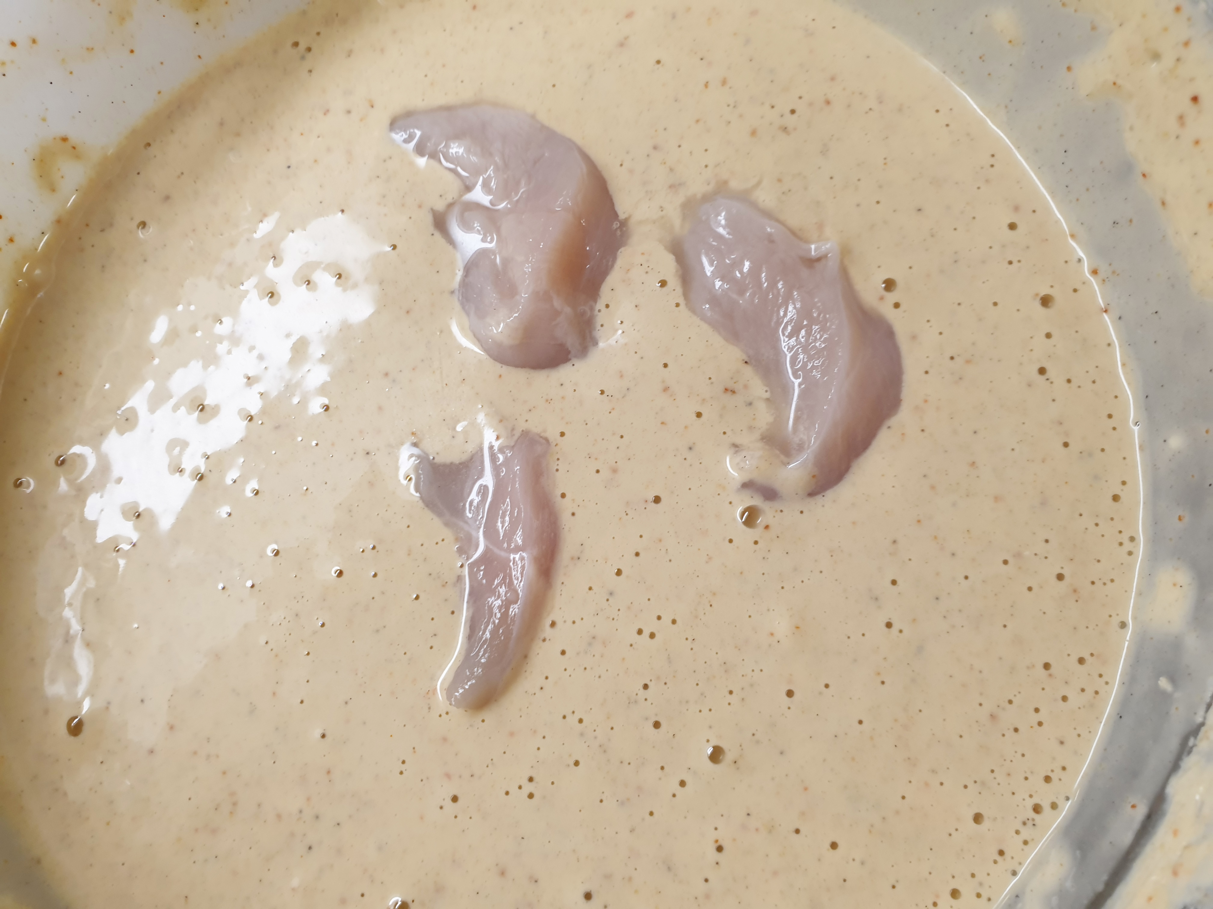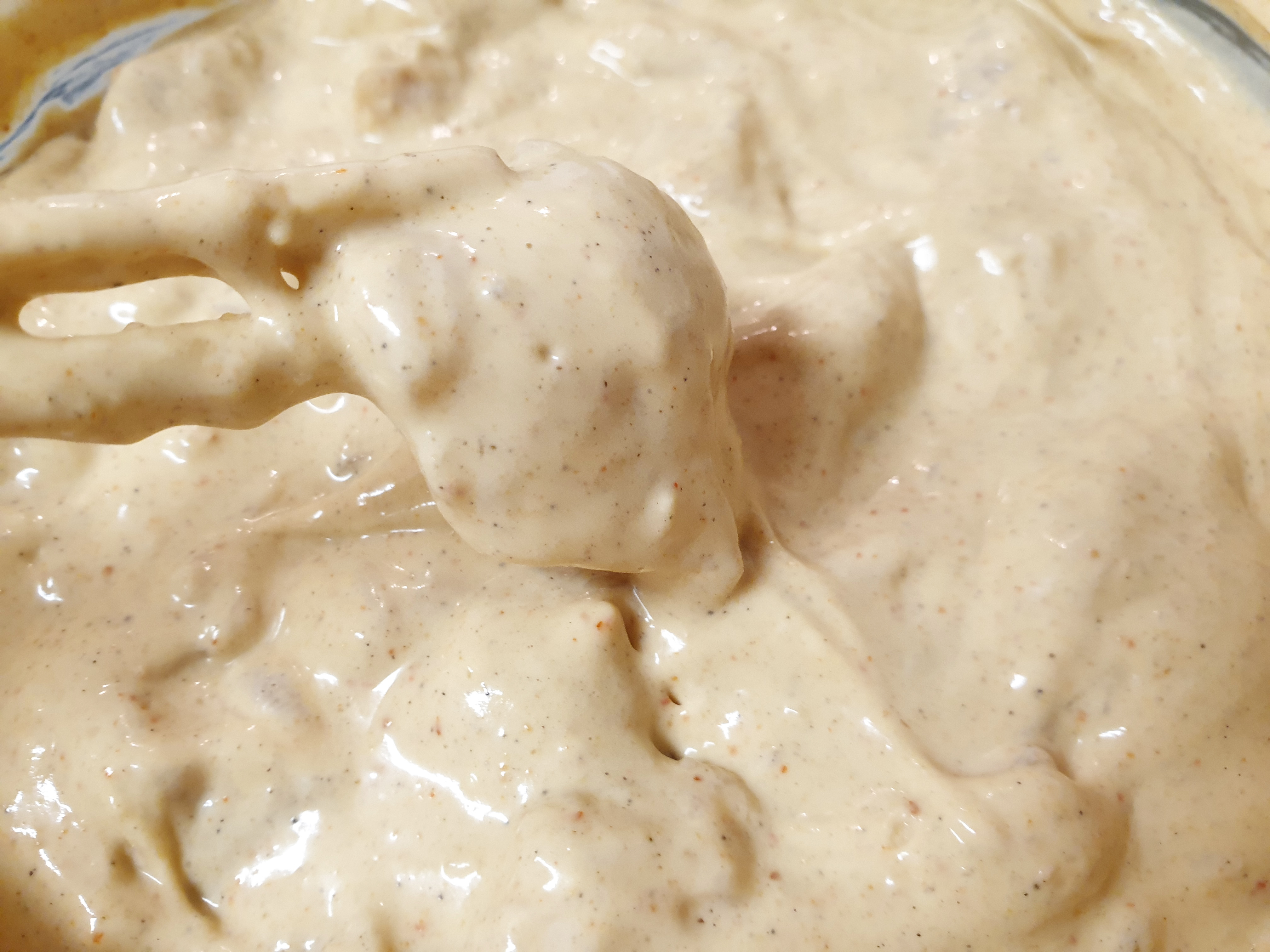 처음에는 물 한컵반+치킨튀김가루 2컵 반을 넣으니 속살이 보이고 간이 약간 싱거웠어요~ 튀김옷이 두꺼운 게 싫으신 분들에게는 좋은 비율 같아요~!