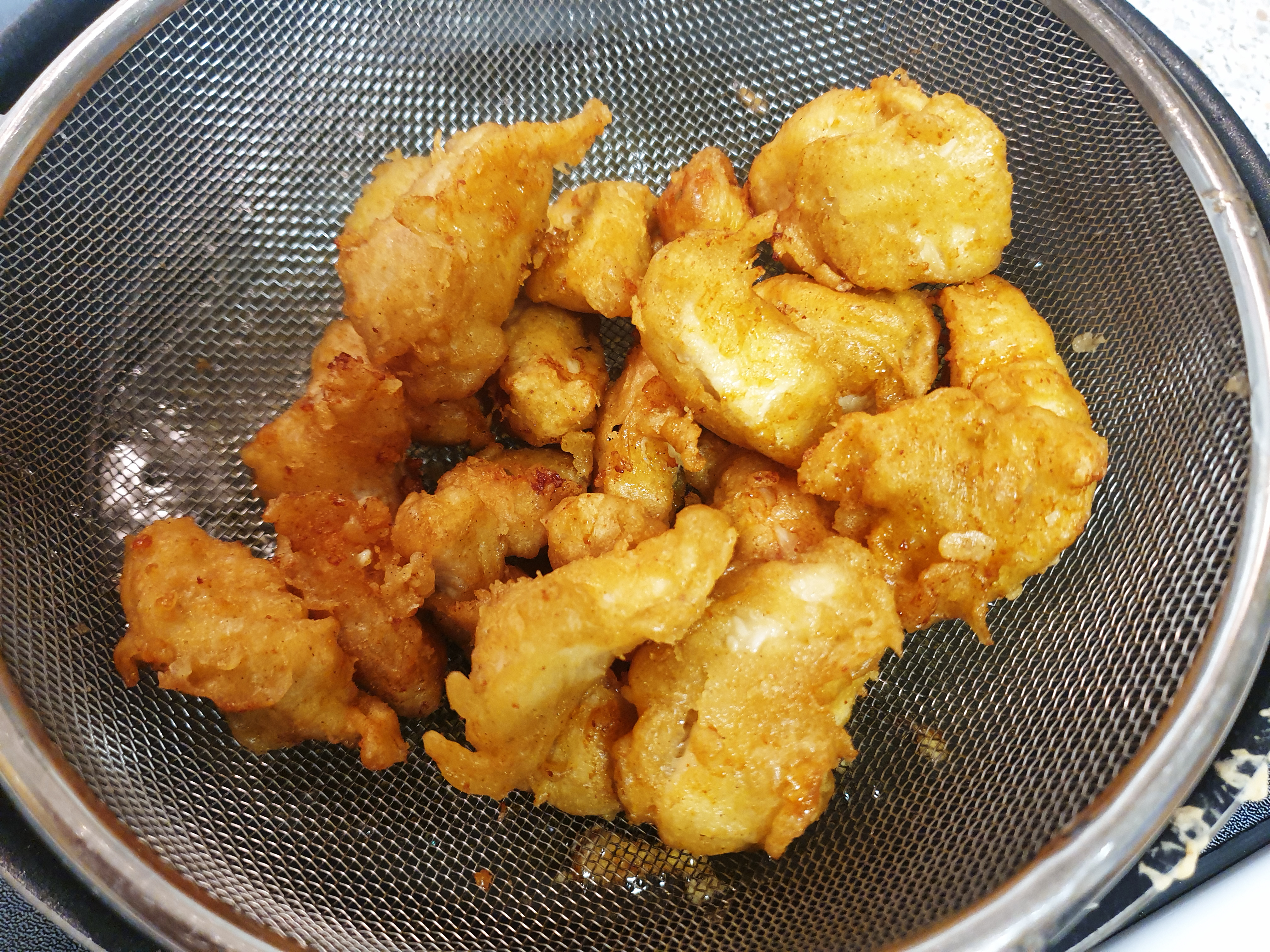 8. 잘 튀겨진 닭은 채망에 옮겨 기름기를 쫙 빼 줍니다.