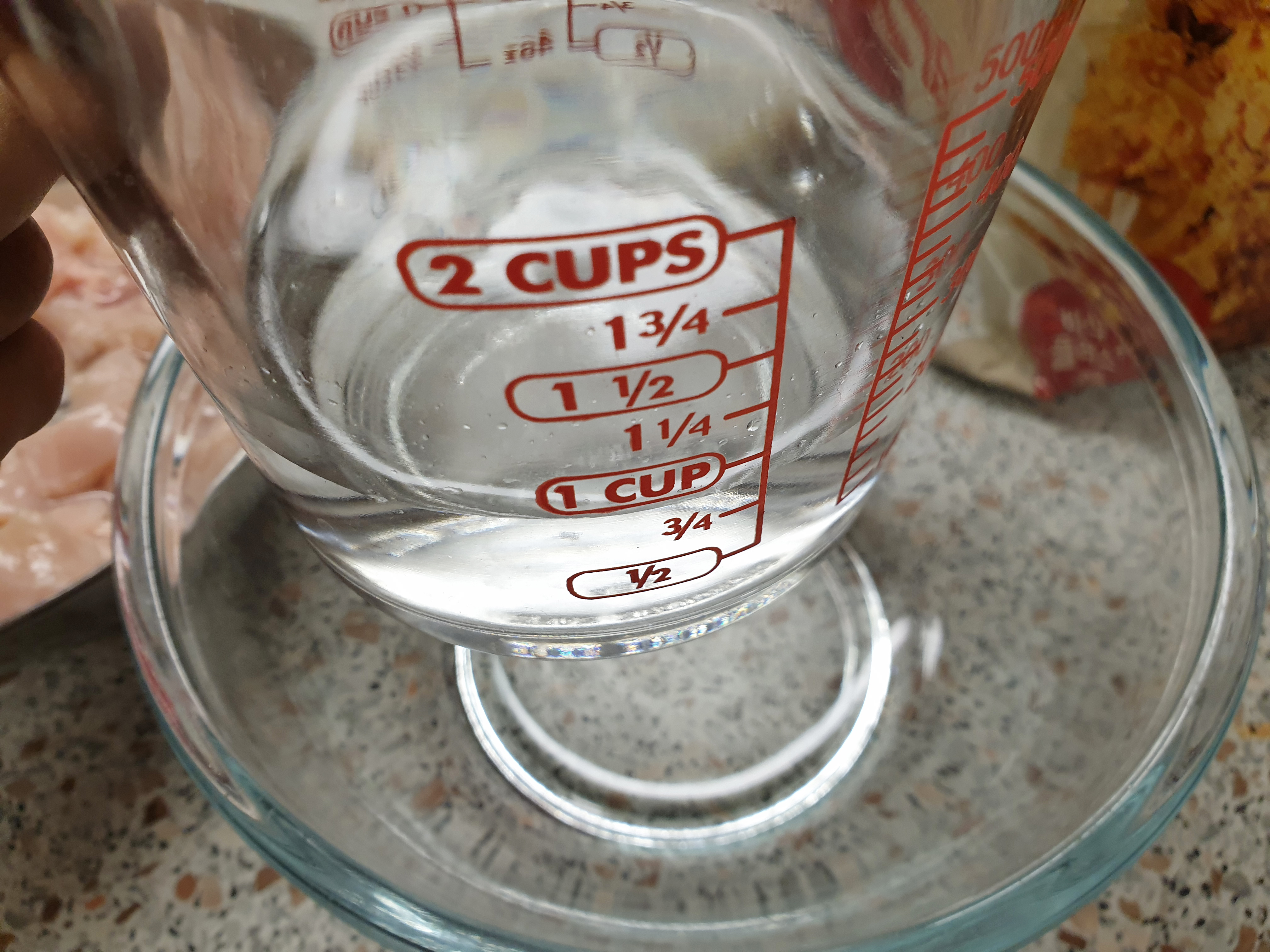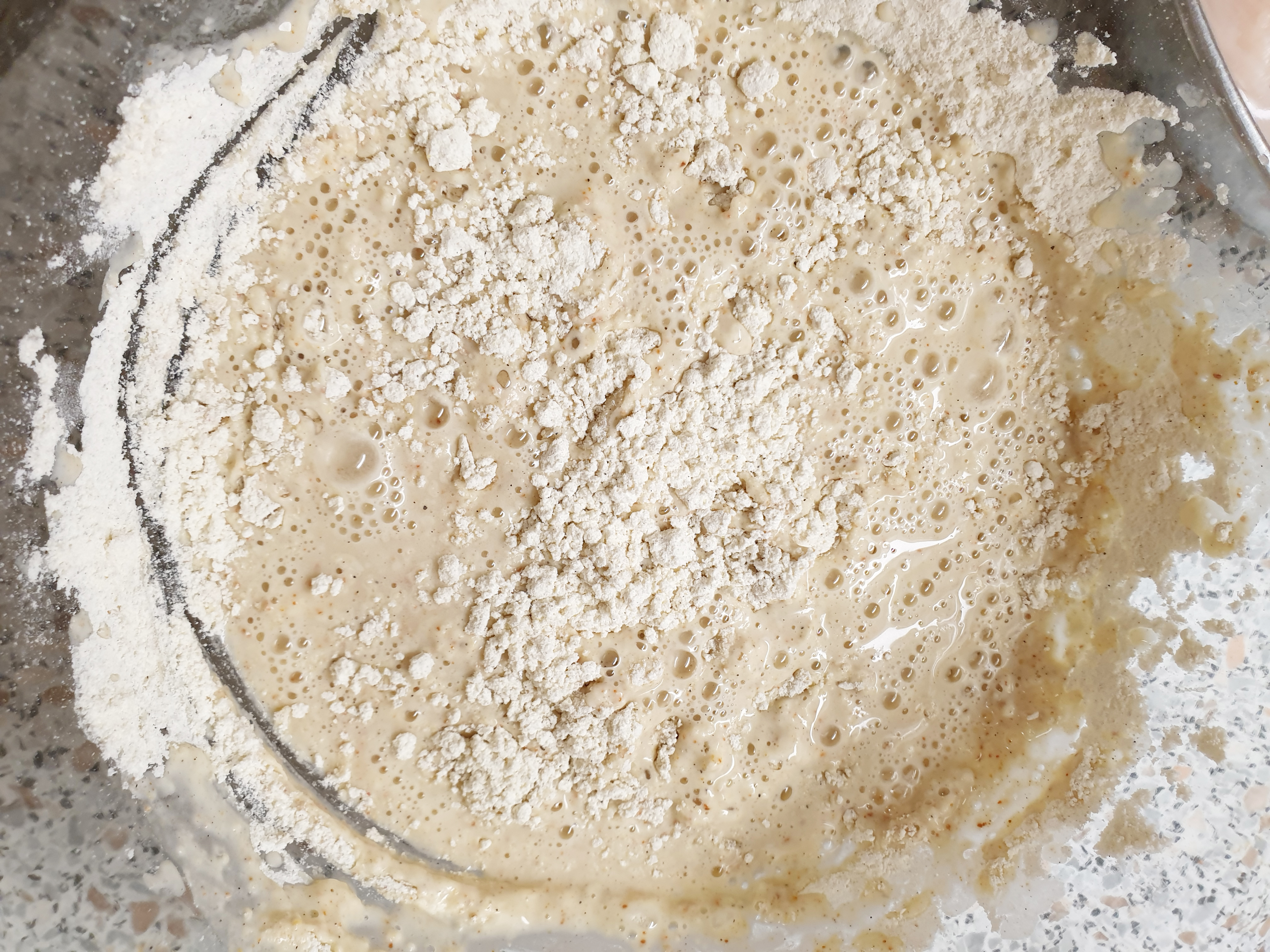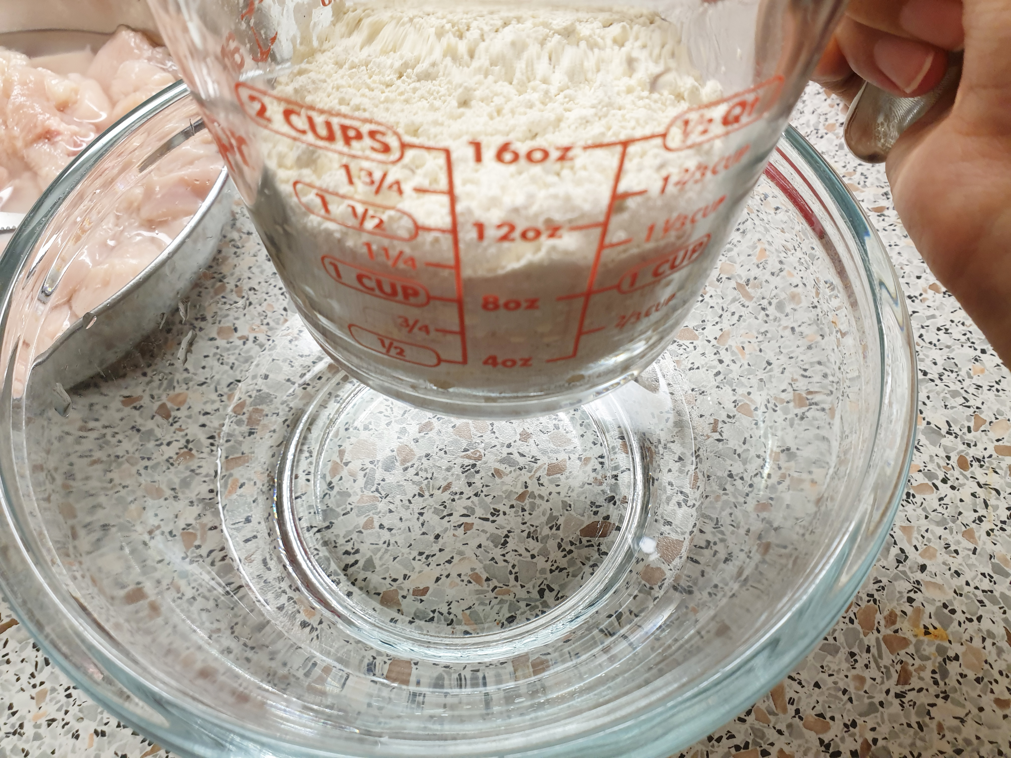 3. 닭 튀김용 반죽을 만들 차례! 한 컵 반 , 치킨 튀김가루 3컵을 넣고 덩어리가 지지 않도록 잘 섞어줍니다.