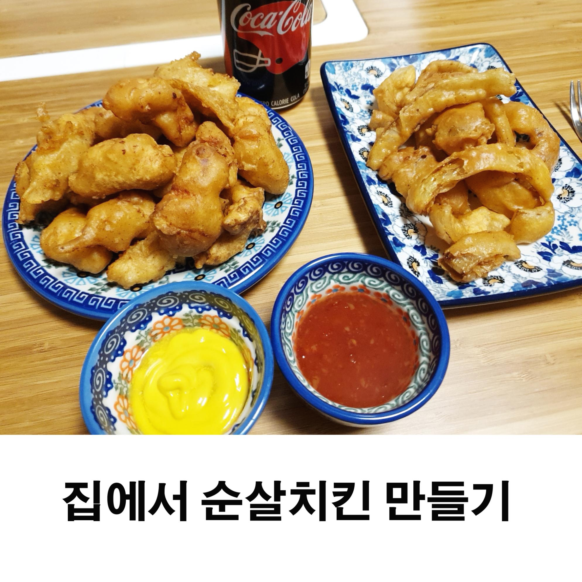 남편을 위해 집에서 순살치킨을 만들어 보았어요~ 전에 펜션에 놀러 가서 순살 치킨을 만들어 먹었었는데 너무 맛있고 의외로 간편해서 집에서 다시 한번 순살치킨을 만들었습니다. 그 맛은 최고~>< 뼈 있는 닭으로 만들었을 때는 잡내 제거 지방제거 털 제거하는데만 몇 시간을 잡아야 했는데 닭 순살로 만드니 이런 과정이 없어서 빠르게 만들어 먹을 수 있었습니다. 누구나 쉽게 집에서 순살치킨 만드는 법을 알려 드릴게요!