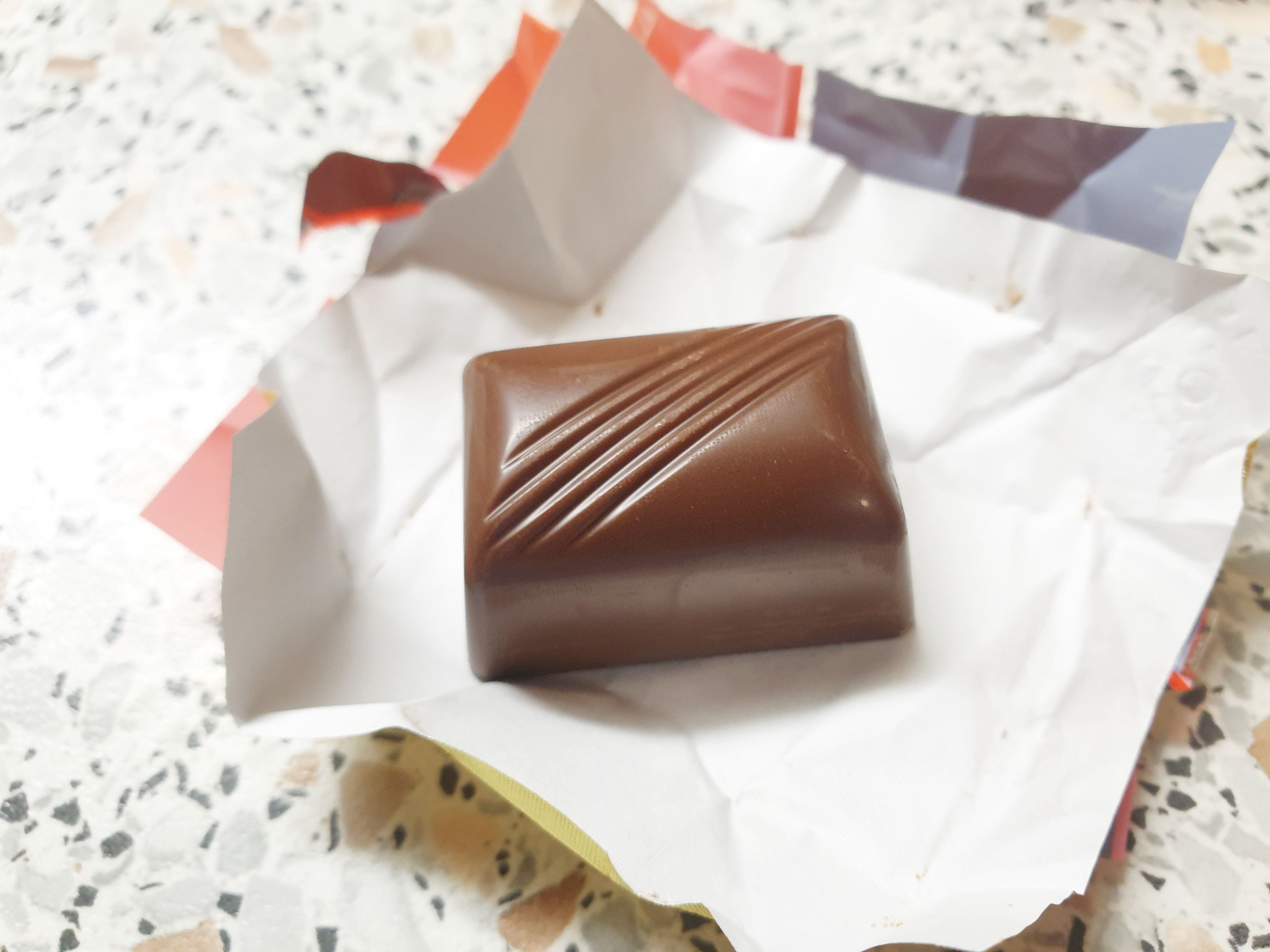 초콜릿은 직사각형의 모양이고 초콜릿을 반으로 짤라보니 안에 진한 에스프레소가 흘러나오네요~ 그리고 약간의 설탕이 초콜릿 가운데 있고 에스프레소 맛은 진한 더위사냥 맛? 인 것 같아요~ 많이 달지도 쓰지도 않았어요~