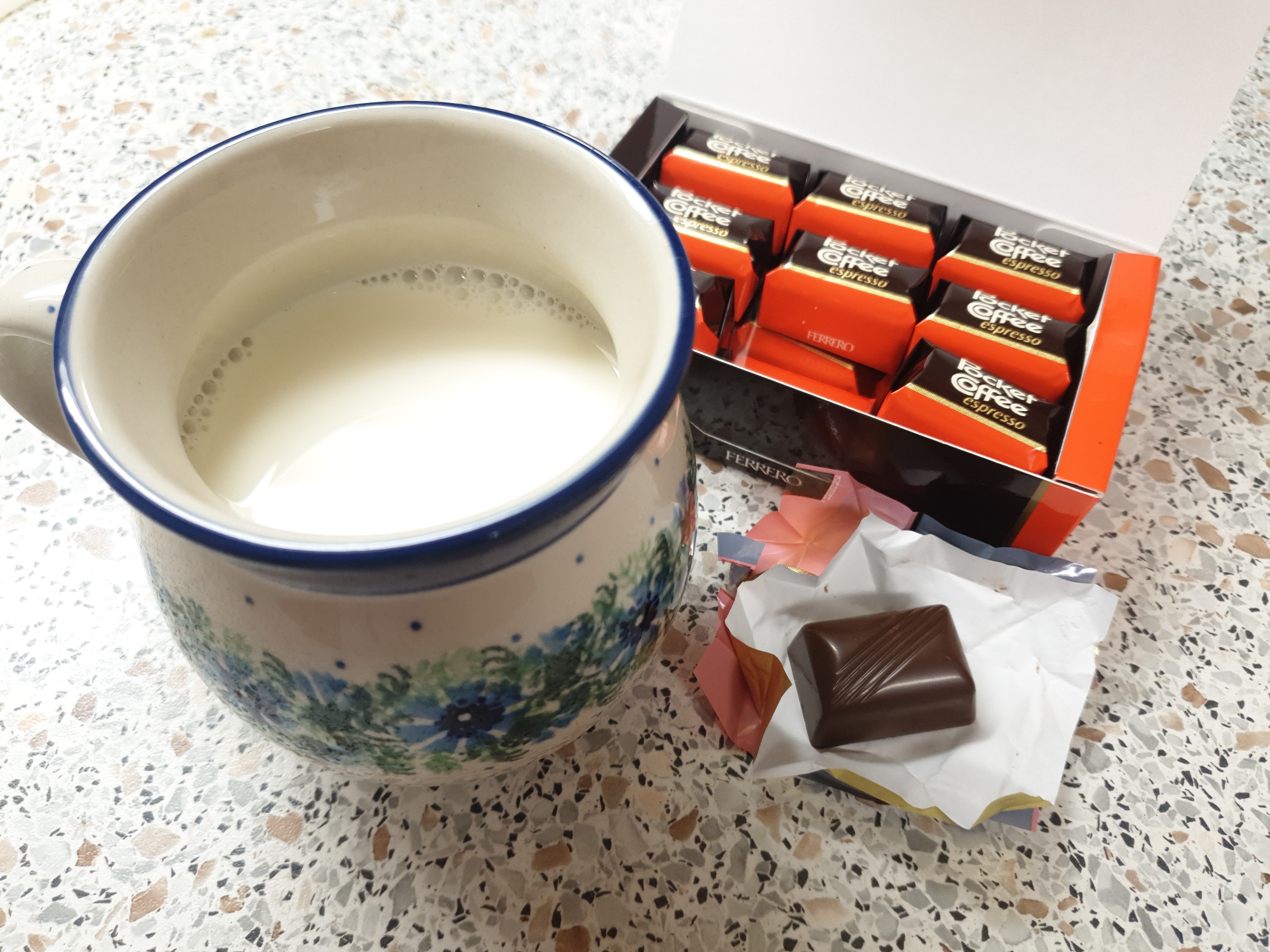 따뜻한 우유에 페레로 포켓커피 2개를 넣고 초콜릿이 완전히 녹을 수 있도록 잘 저어주면 끝!