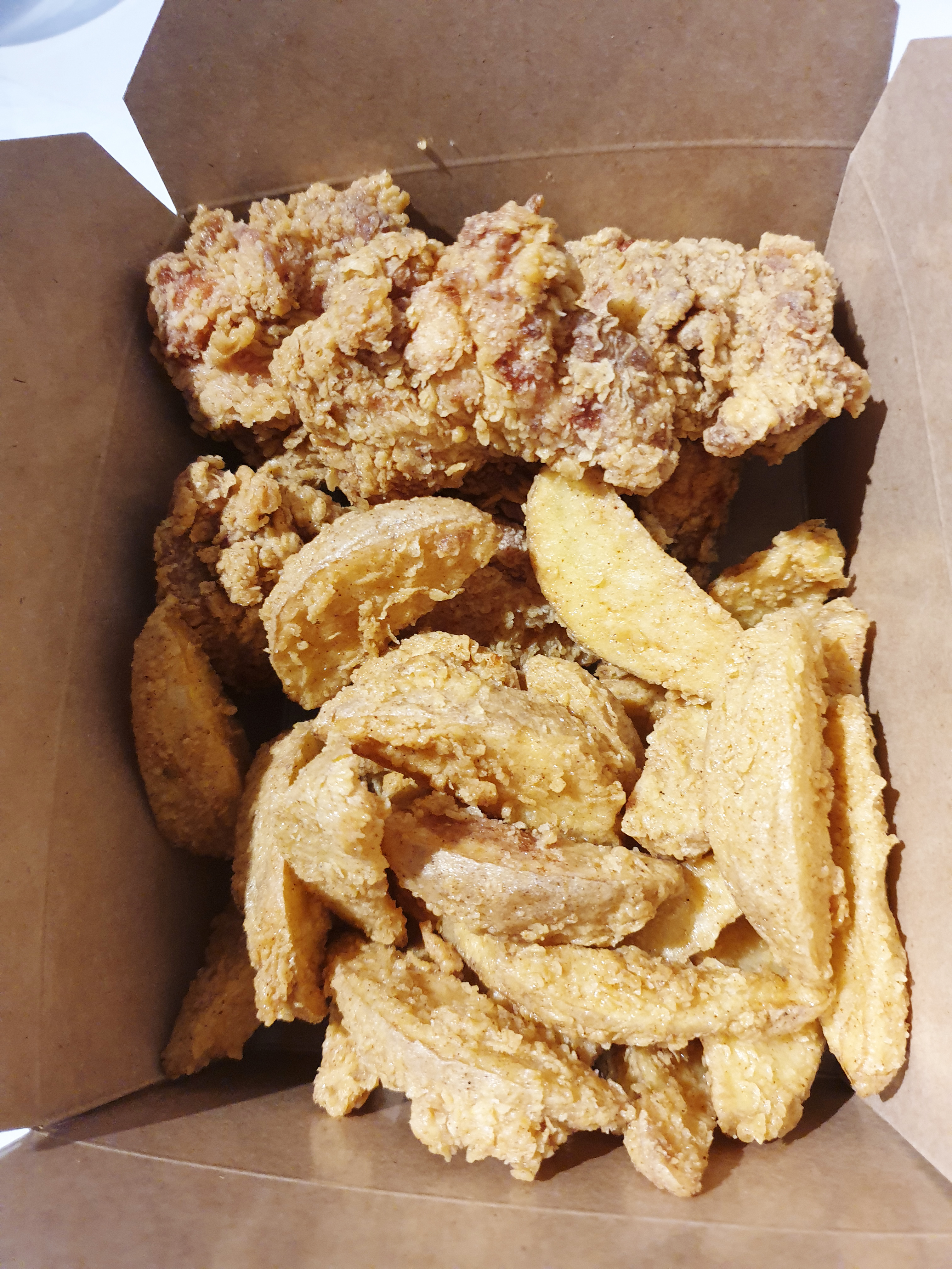 저희가 주문한 메뉴는 라지 사이즈로 양념반 치킨반과 웨지감자 & 후라이드치킨 세트를 주문했어요~ 어떤 치킨이 맛있는지 몰라서 3가지를 모두 주문했습니다. ㅎㅎ 10~15분정도 기다렸더니 주문했던 치킨이 나왔어요 ㅋㅋ 매장안에서 먹어도 종이상자에 담아주더라고요~