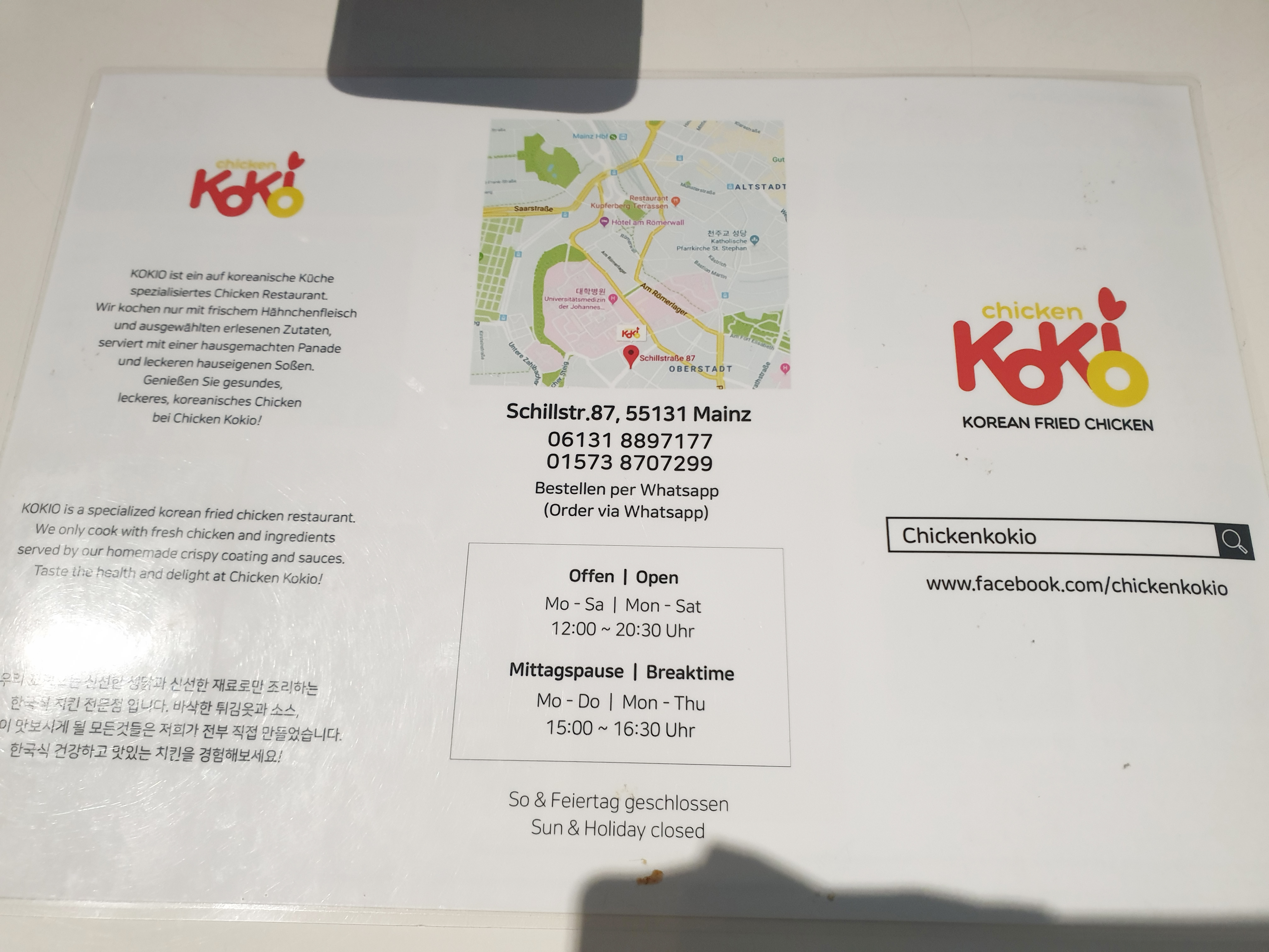 남편 출장을 따라왔는데 출장 온 곳에 아는 분이 있어서 한국식당 가볼 만한 곳 추천 좀 해달라 했더니 독일 마인츠에 가면 꼬끼오(KOKIO)라는 한국 치킨집이 있는데 정말 맛있다고 해서 금요일에 차로 30분 정도 달려 독일 마인츠 꼬끼오로 향했어요~