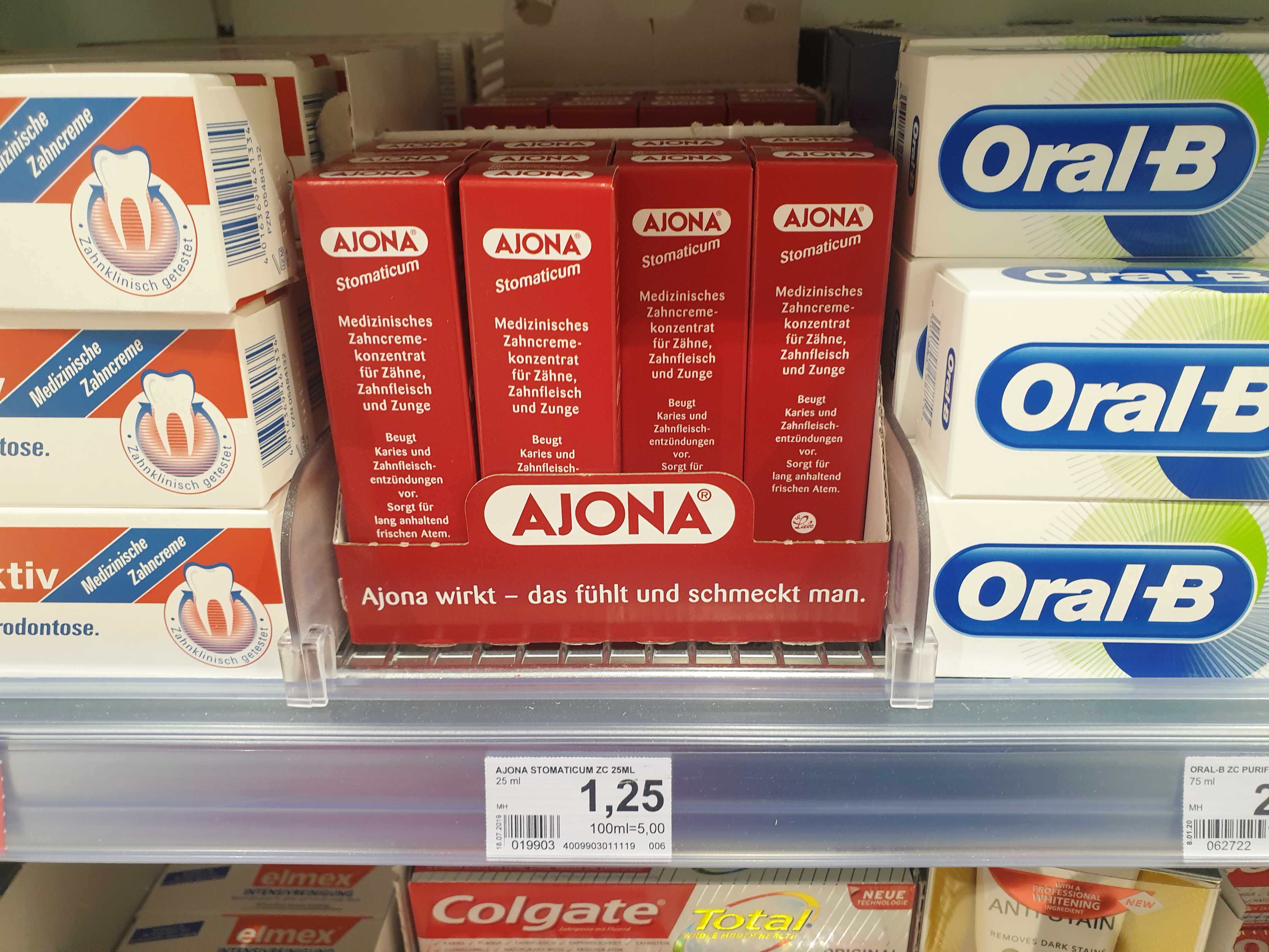 잇몸치약으로 유명한 아조나 치약! 독일 쇼핑리스트에서 필수라 할 수 있죠~! 가격은 1,25유로 한화 약 1630원