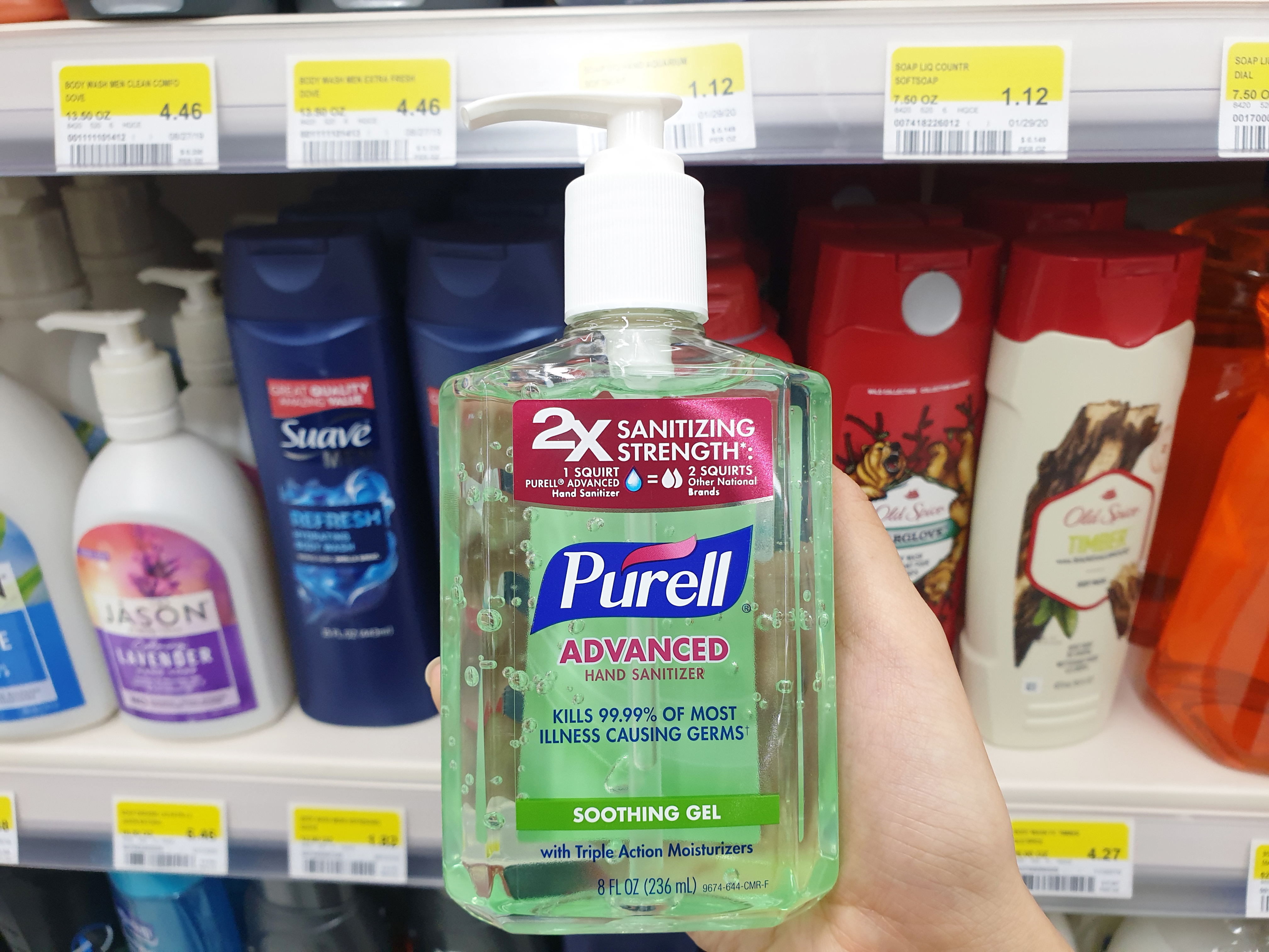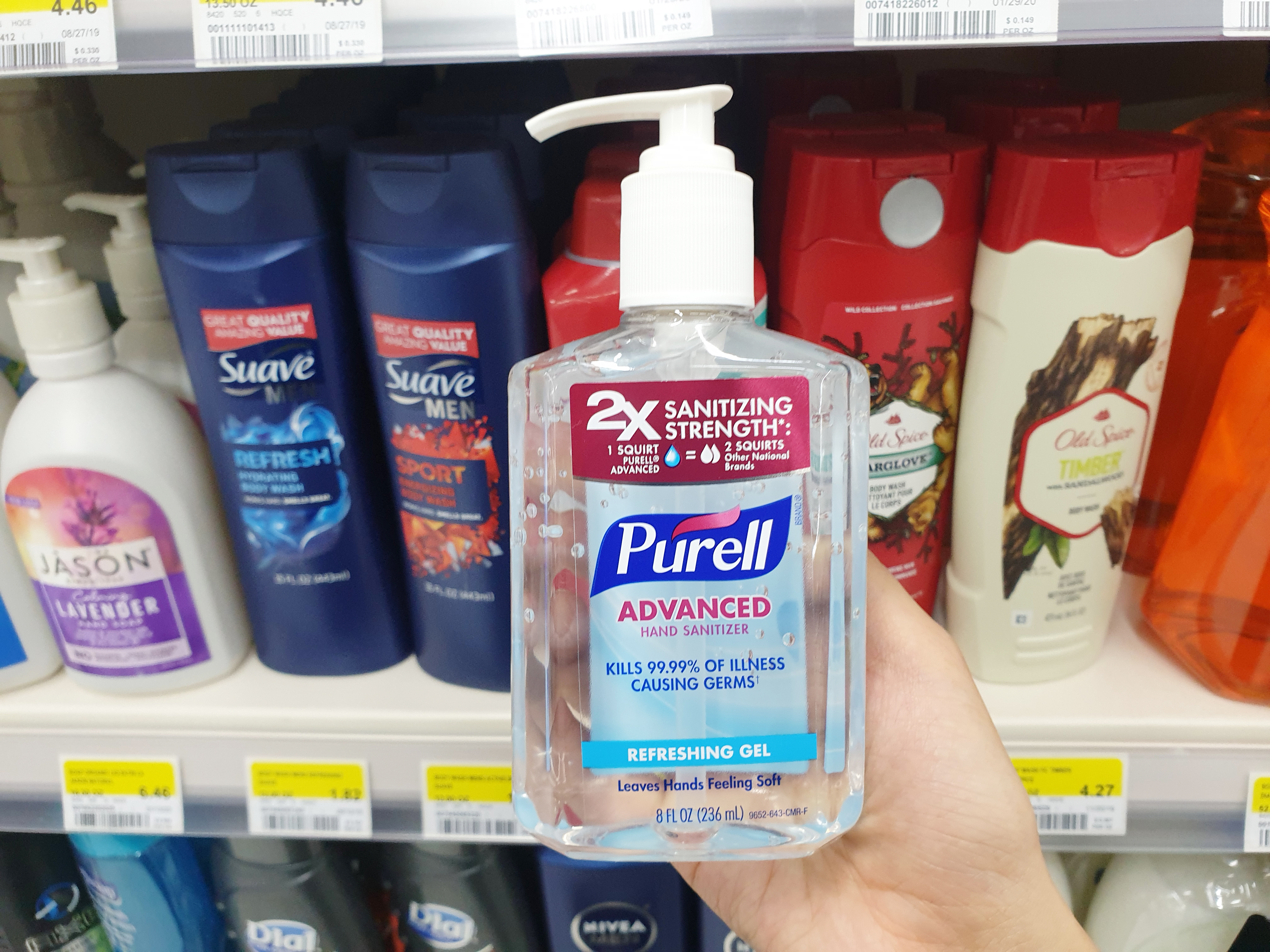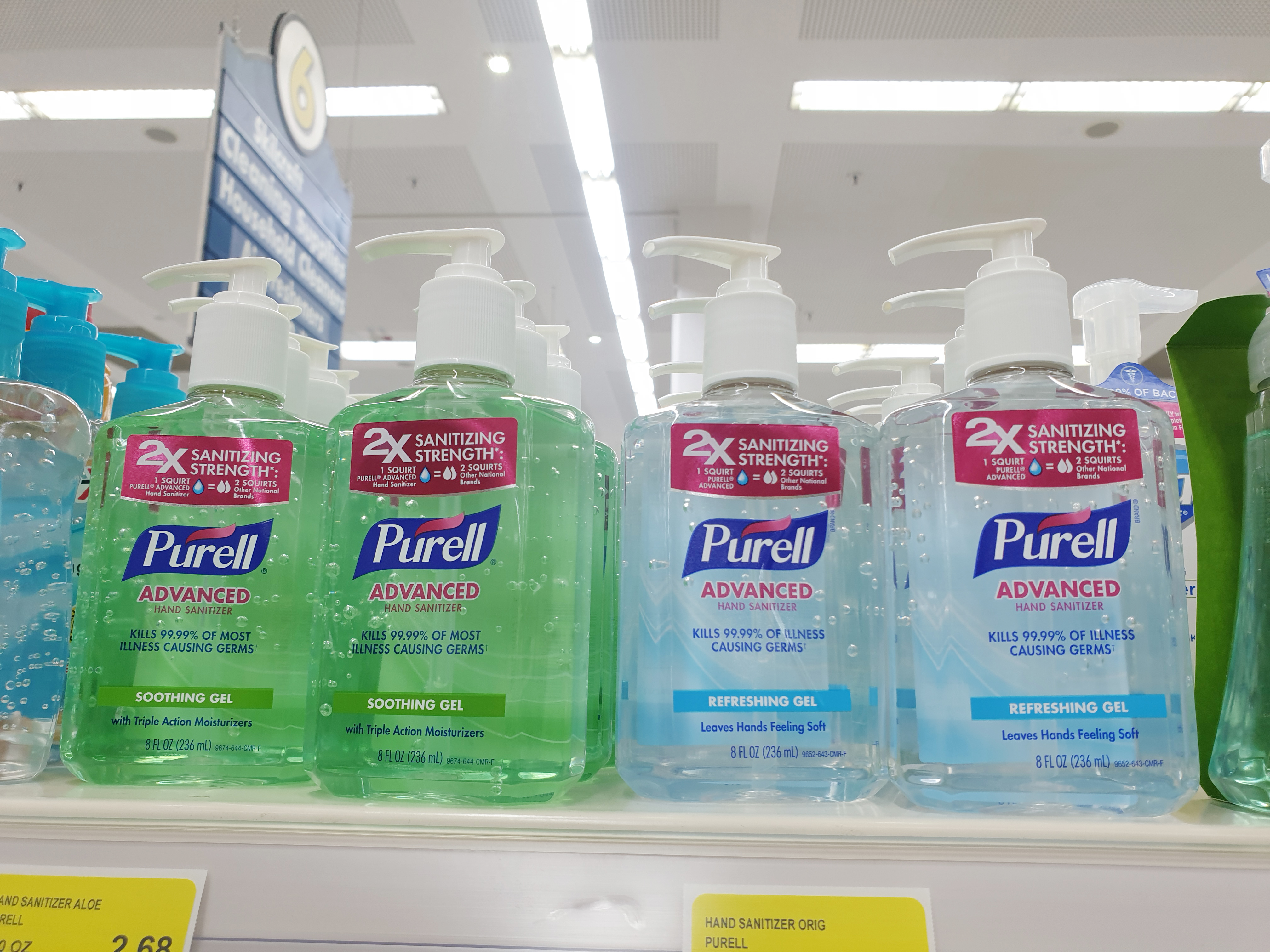 손소독제가 없으면 어쩌나 걱정을 했는데 다행히 재고가 충분하더라고요~ 아무도 마스크를 쓰고 다니지도 않고.. 나만 오버하는 느낌이었지만 그래도 제가 찾는 손 소독제가 있어서 안심했습니다. 퓨렐 손 소독제는 수딩 젤과 리프레싱 젤 두 가지 타입이 있었는데 전 산뜻한 것을 선호하는 편이라 퓨렐 손소독제 리프레싱 타입으로 구매를 했습니다. 가격은 각 2.68달러