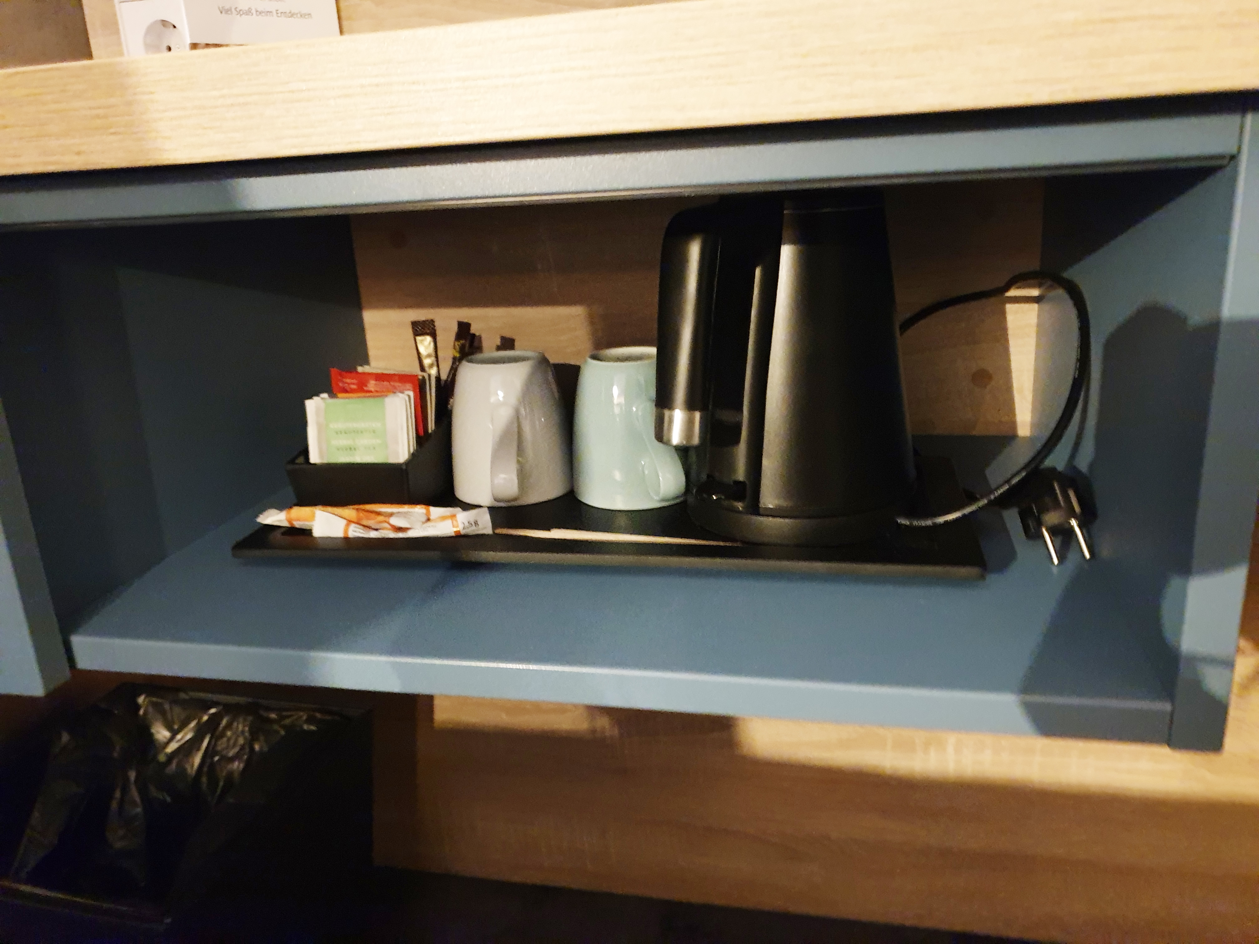 옷장은 따로 없고 옷걸이가 있고 TV, 커피포트, 차 종류 가 있었습니다. 2 동안 있어야 하는데 아쉽게도 냉장고는 없었어요 ㅠㅠ 직원분에게 물어보니 이 호텔에는 어느 방에도 냉장고가 없다고 했어요..