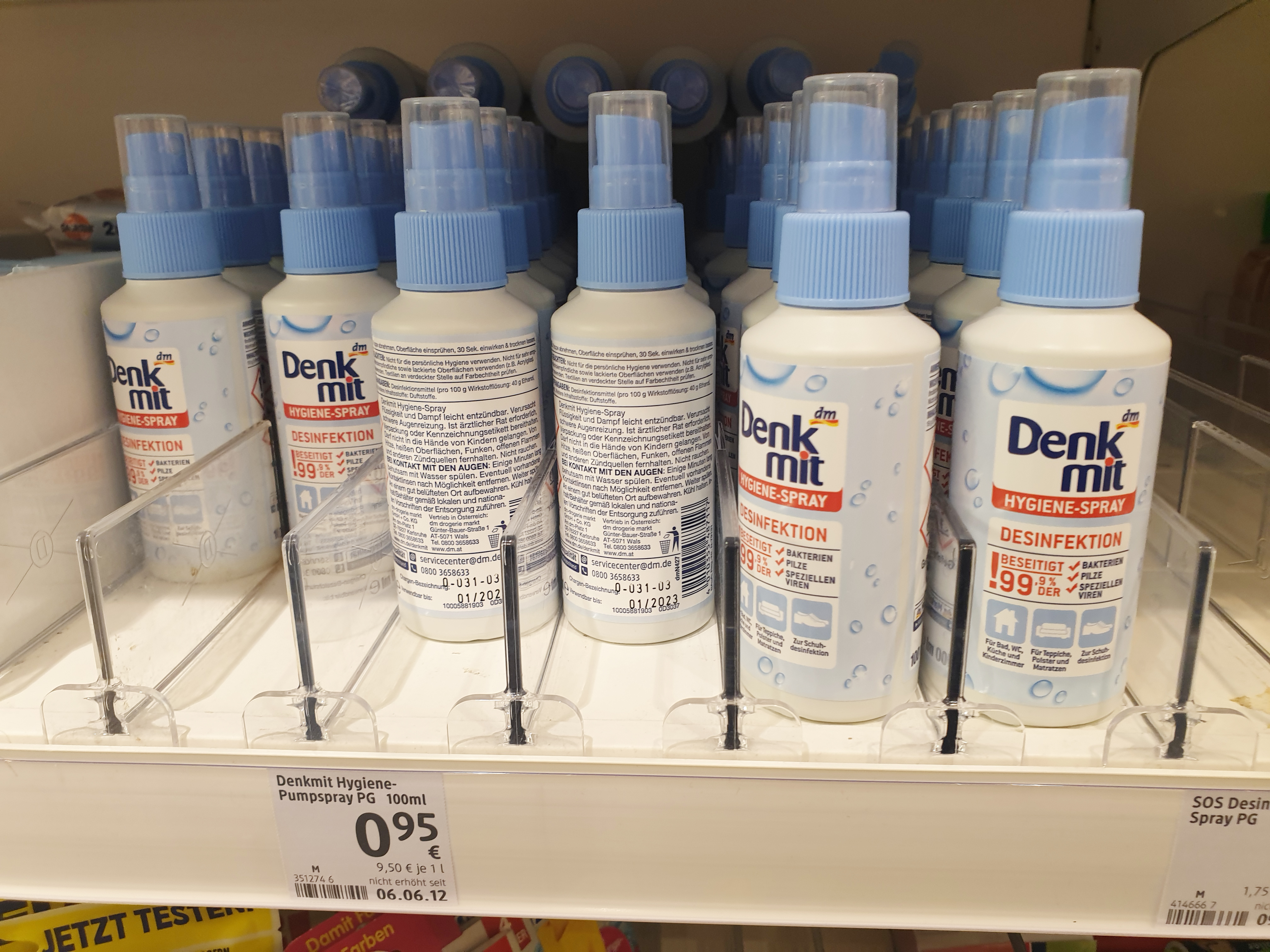 이건 댄크미트 위생 소독 스프레이인데 박테리아나 곰팡이 특수 바이러스를 99.9 % 제거해준다고 해요~ 소파, 카펫, 옷, 신발, 매트리스 등 사용이 가능하다고 합니다. 색이 변질될 수 있으니 사용 전엔 꼭 테스트 필수! 가격은 용량에 따라 0.95유로~2.95유로 까지