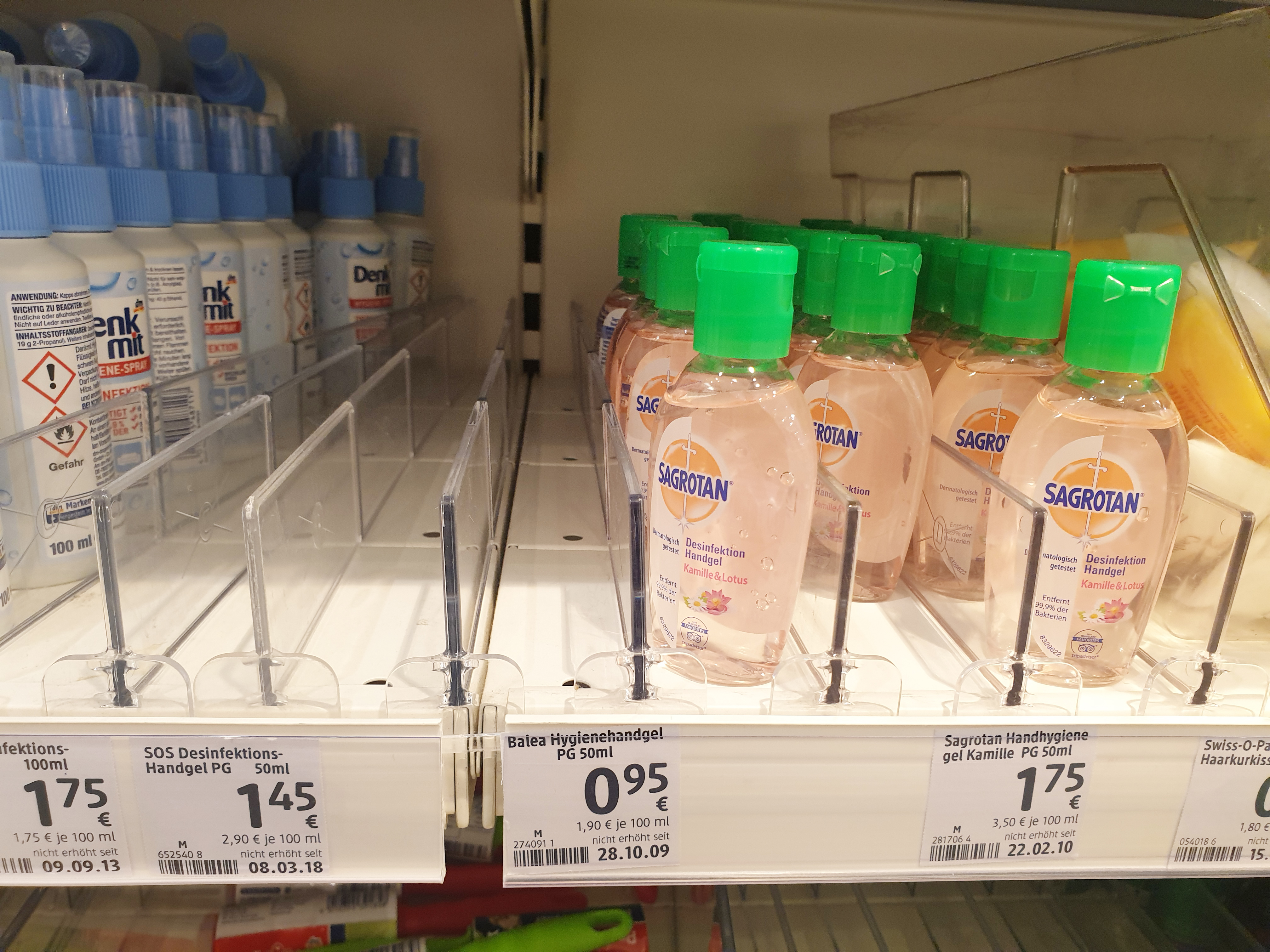 독일 DM에는 생필품으로 거의 없는 게 없어서 손 소독제도 이곳에 있을 것 같아 DM으로 달려갔어요~ 생각했던 건 많은 종류의 손 소독제가 있을 것 같았는데 의외로 별로 없더라고요~ 그리고 이미 손 소독제는 품절된 게 많더라고요.. 그래서 몇 가지 사진으로 담고 주변 검색을 해 다른 위치에 있는 DM으로 이동했어요~!