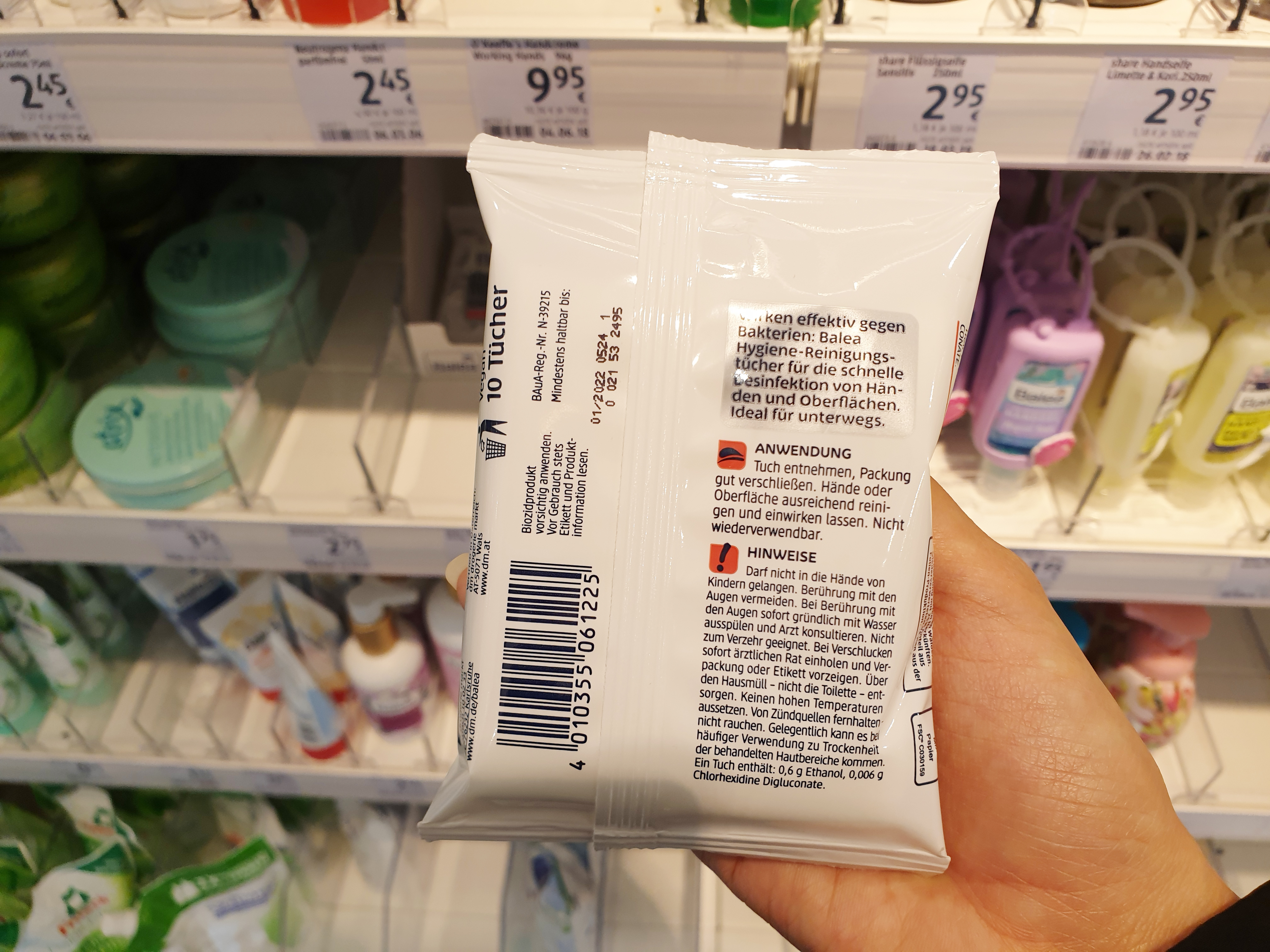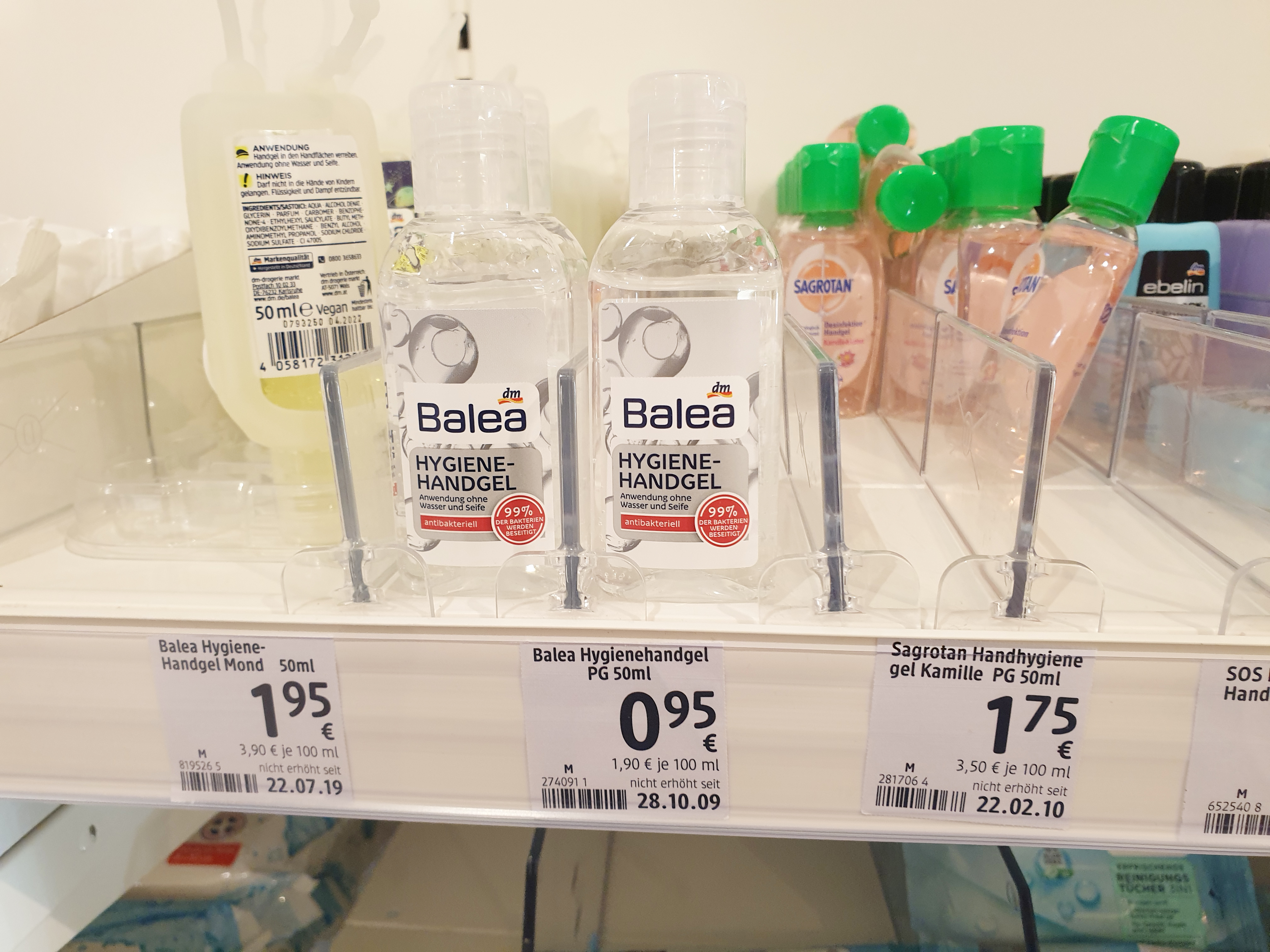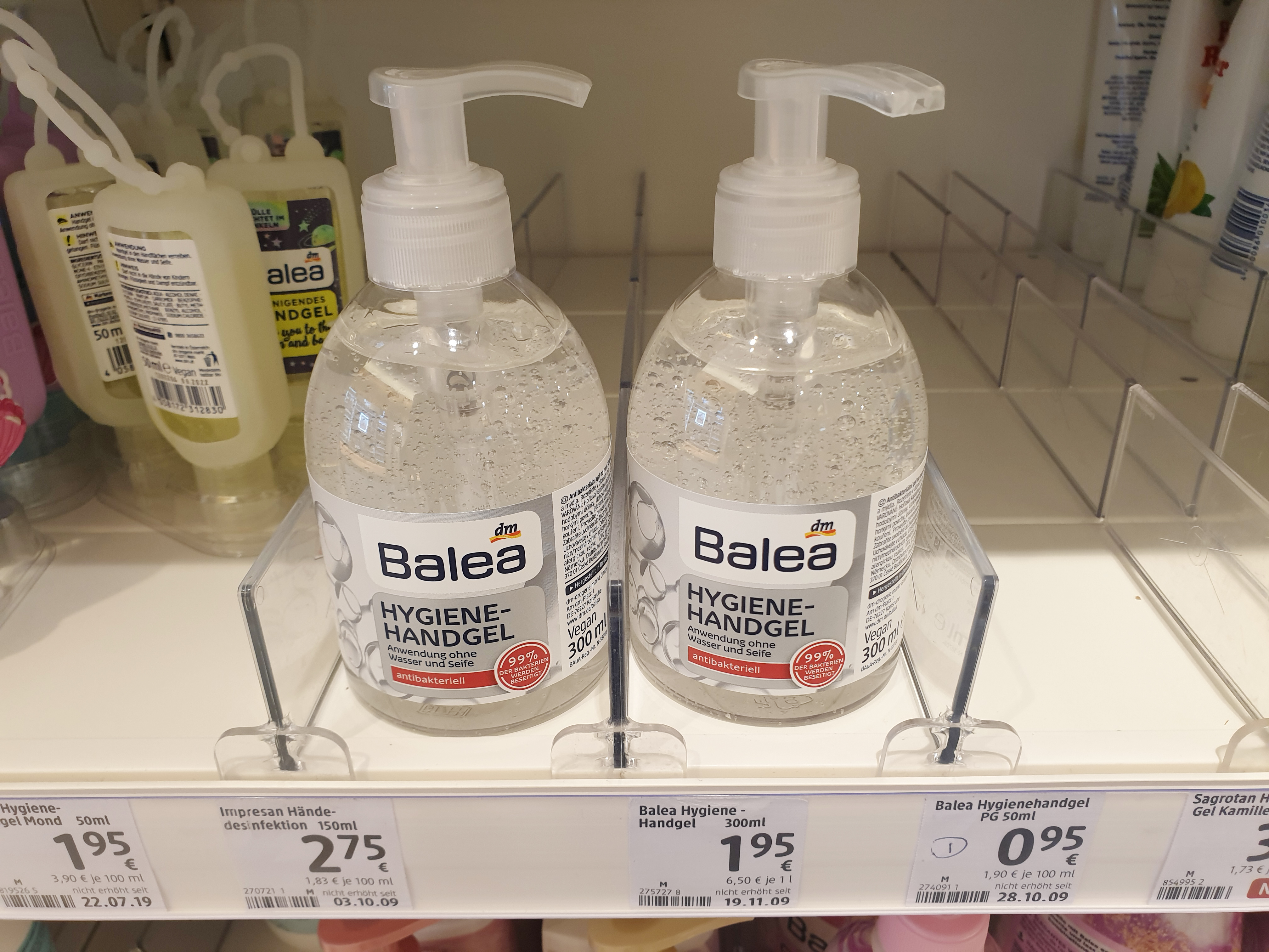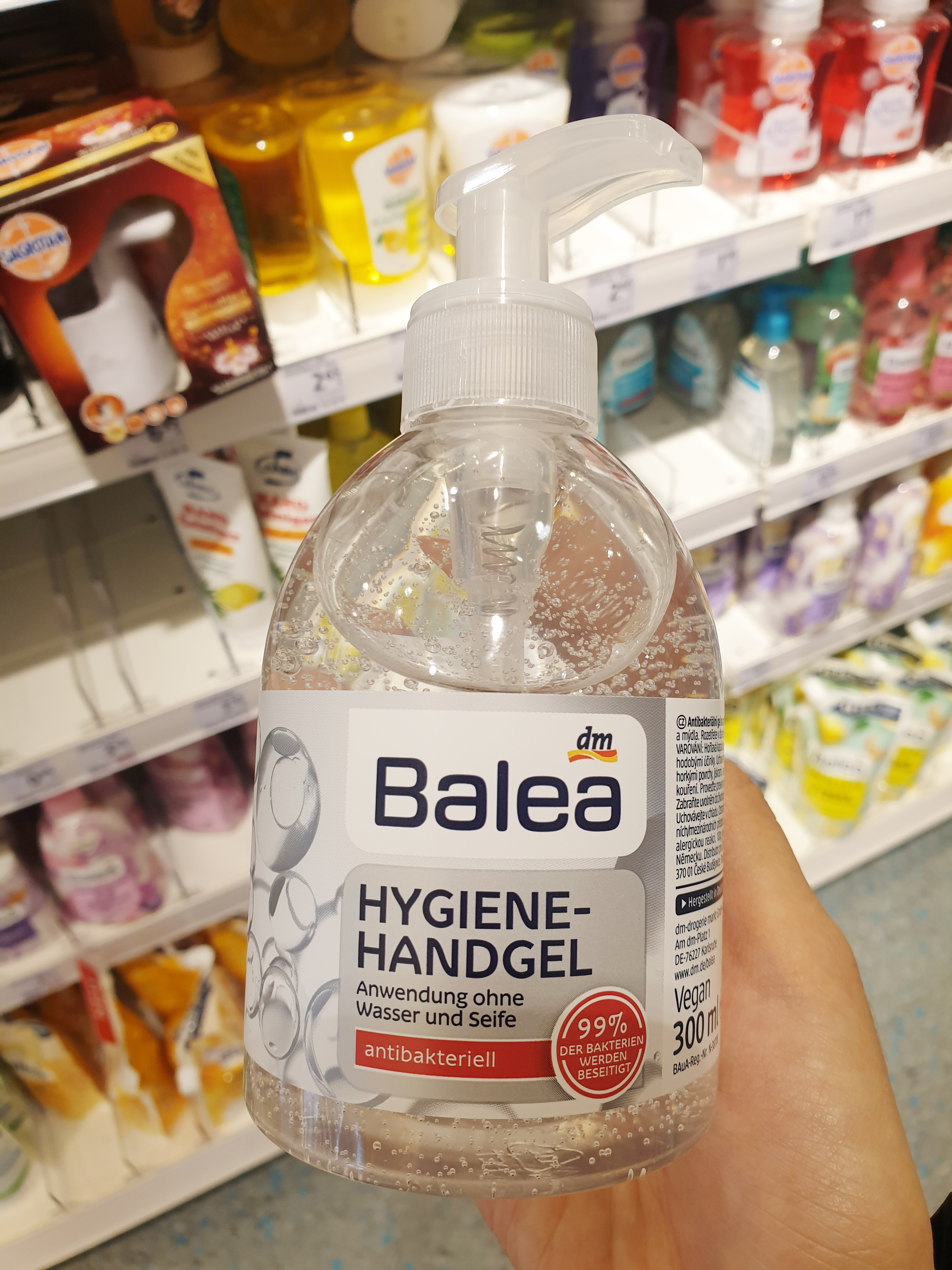 가장 먼저 발견한건 발레아 손소독제 젤 타입이었습니다. 발레아(balea) 손소독제는 물과 비누 없이 사용 가능하며 박테리아 99%를 제거해주고 동물성 성분이 없는 Vegan 제품이라 합니다. 300ml 용량의 가격은 1.95유로고 휴대용은 0.95유로
