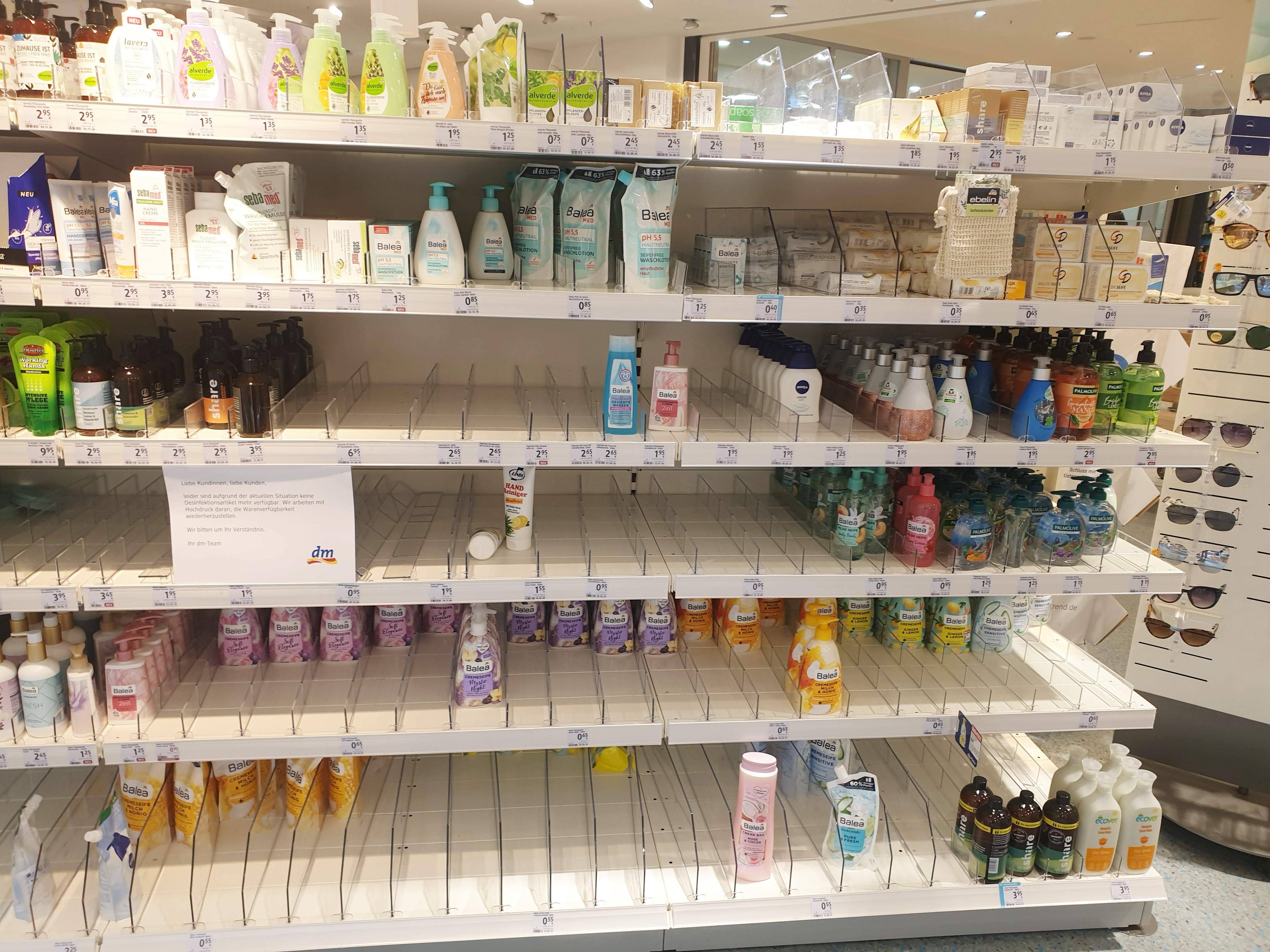 독일은 어딜 가나 상황은 똑같은 거 같아요~ 텅텅 비어 있습니다. 이런 상황에서 손소독제를 2개나 구했다니.. 엄청난 행운인듯해요!