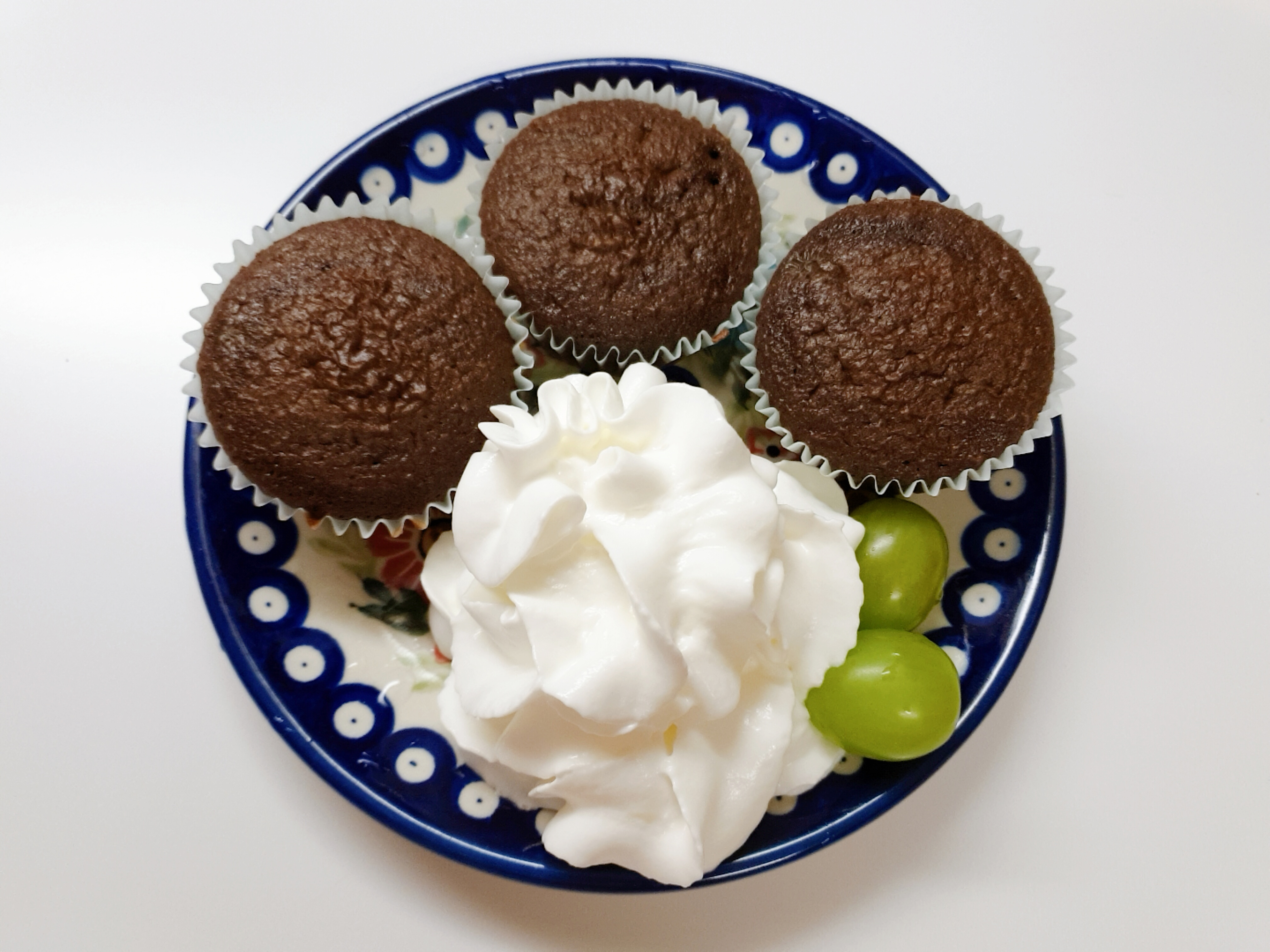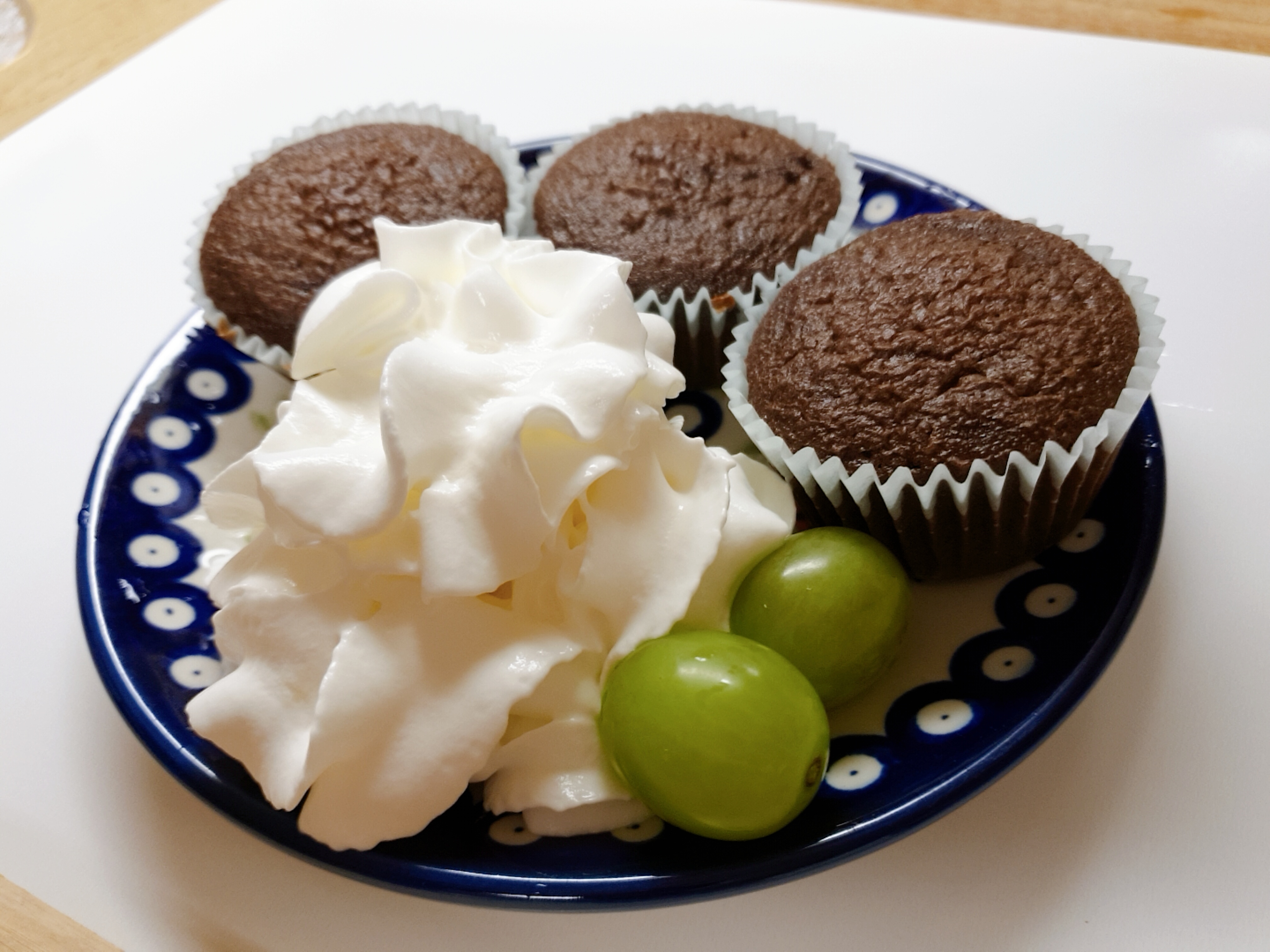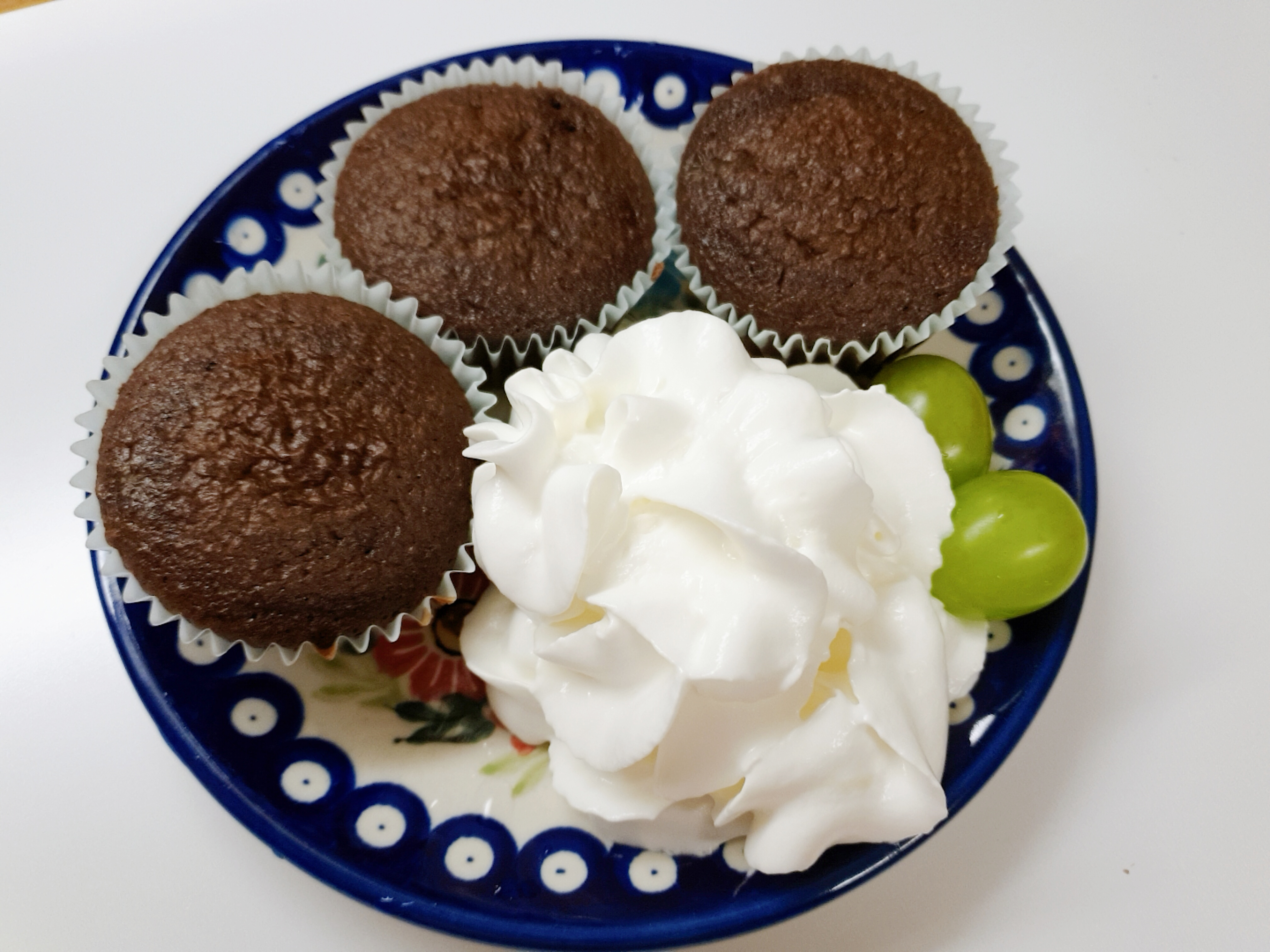 이렇게 초코머핀이 완성됐어요~ 휘핑크림과 같이 먹으면 정말 꿀맛입니다. 오랜만에 만들어 먹었는데 맛에 감동했네요~ ㅋㅋ 한 상자에 머핀 22개 정도 만들 수 있어서 한번 만들어 두면 3~4일 정도 먹을 수 있어서 좋네요~