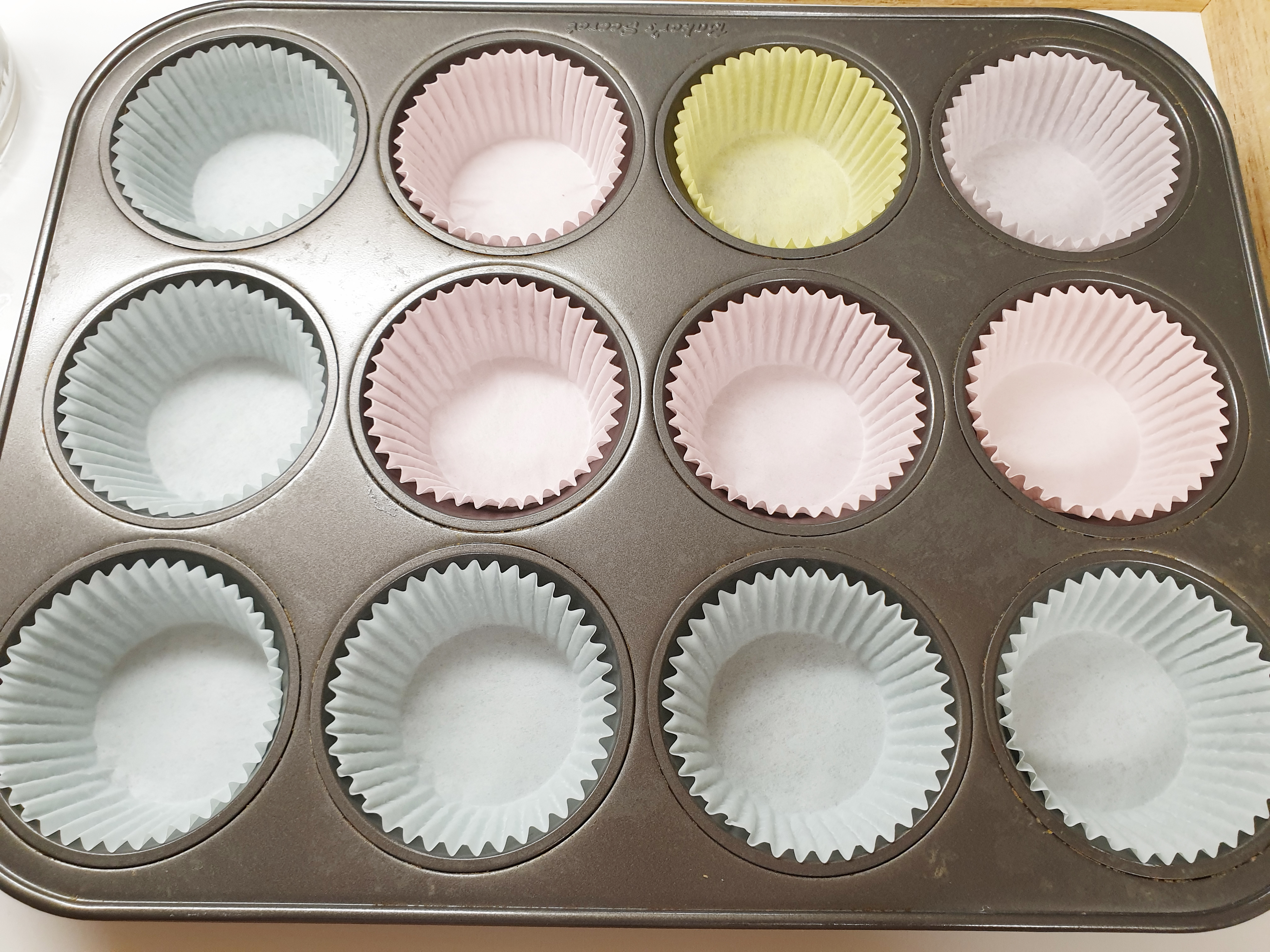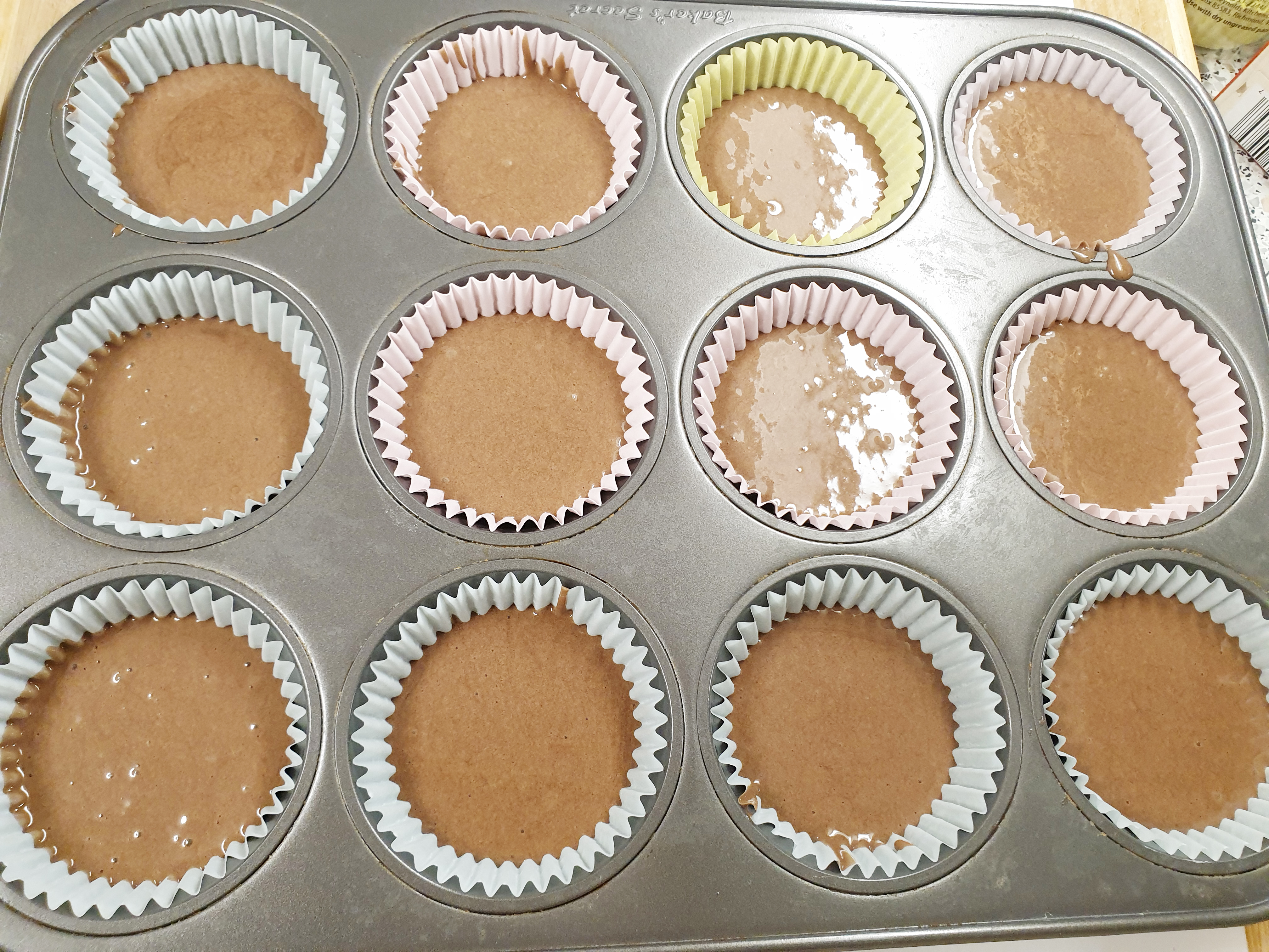 머핀 팬에 머핀 컵을 끼워주고 반죽을 담아 줍니다. 반죽은 머핀 컵에 꽉 차지 않게 담아주세요! (머핀 컵을 사용하는 이유는 머핀팬에 오일을발라 반죽을 담아도 되지만 오일이 덜 발라지거나하면 머핀이 팬에 들러붙어서 쉽게 분리하기 위해 머핀컵을 사용합니다.)