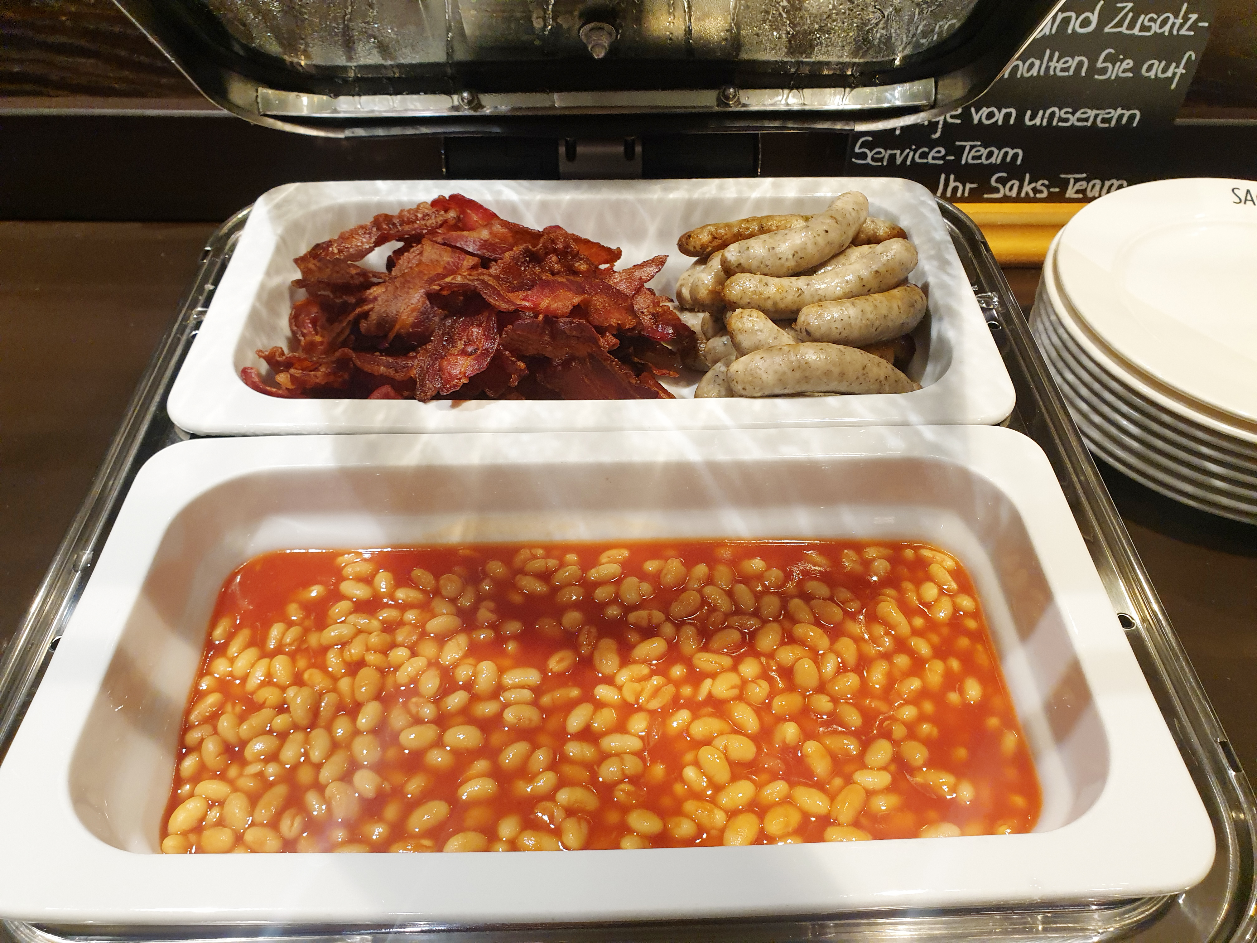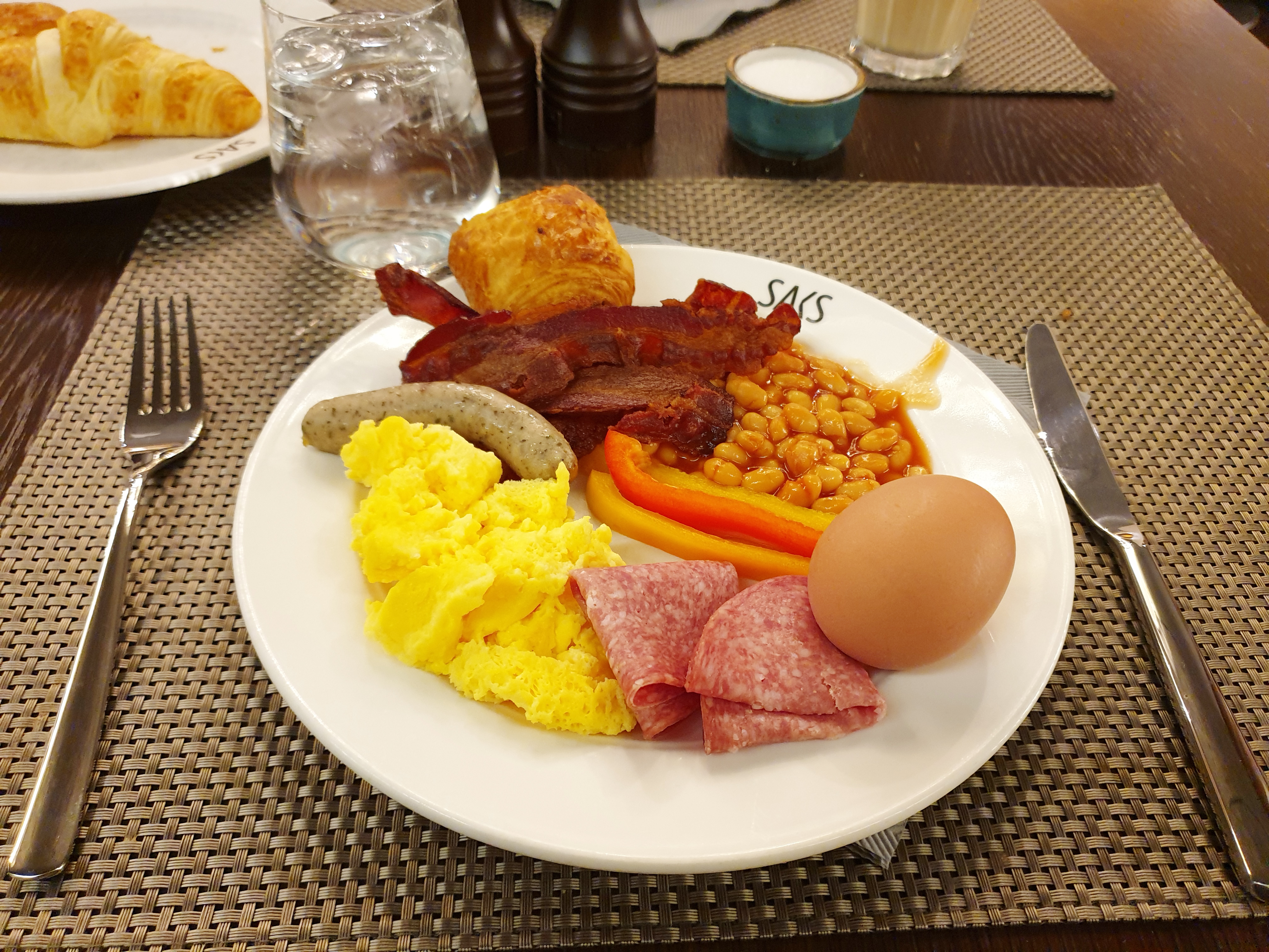 조식 메인 메뉴라 할 수 있는 스크램블 에그, 소시지, 계란, 베이컨, 빈