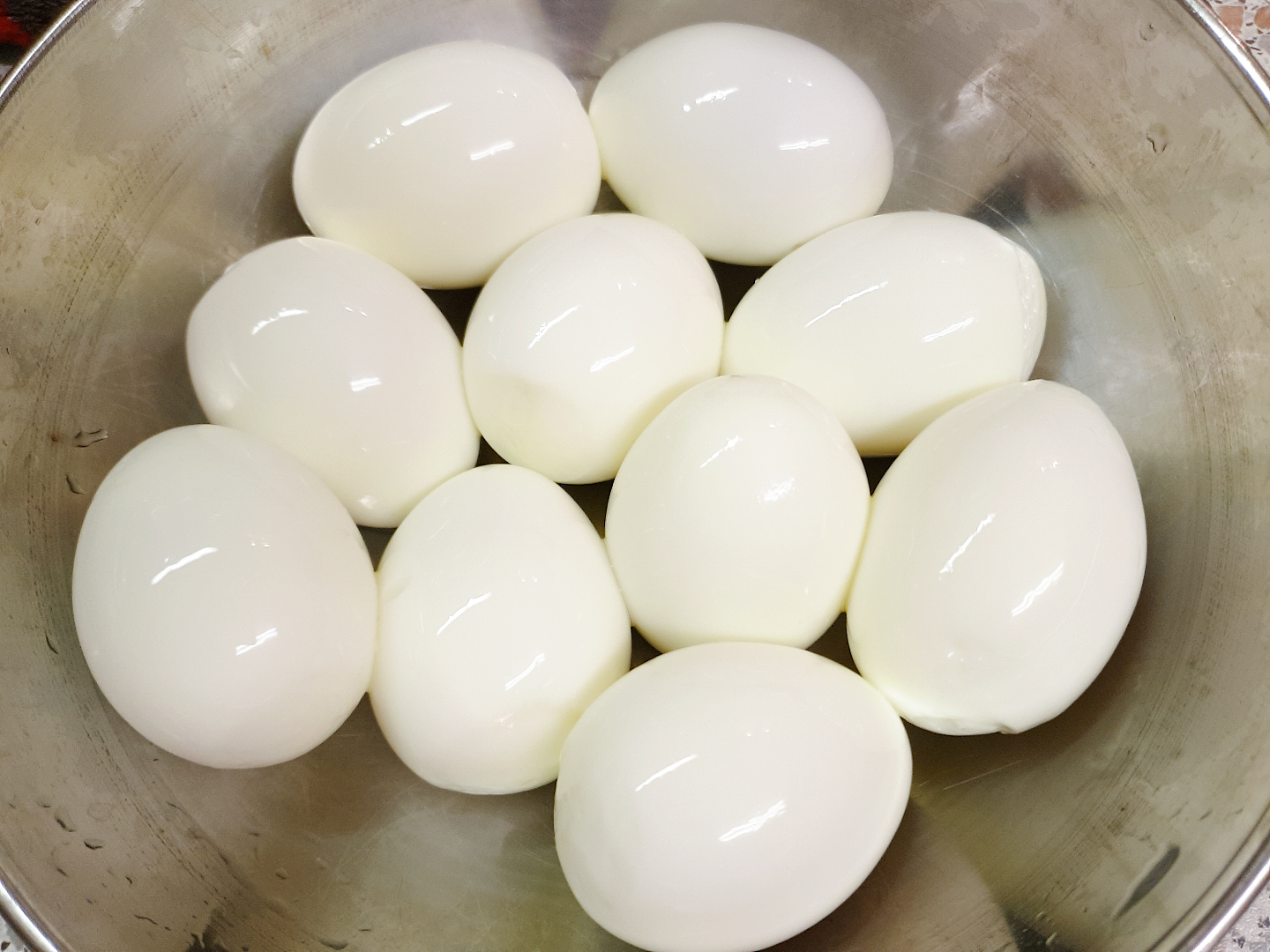 15분 뒤 뜨거운 물은 따라버리고 삶아진 계란을 바로 찬물에 담가 완전히 식혀주세요~! (바로 찬물에 담가 줘야 상처 없이 쉽게 껍질을 깔 수 있습니다.) 계란 껍질을 까서 준비해 줍니다.