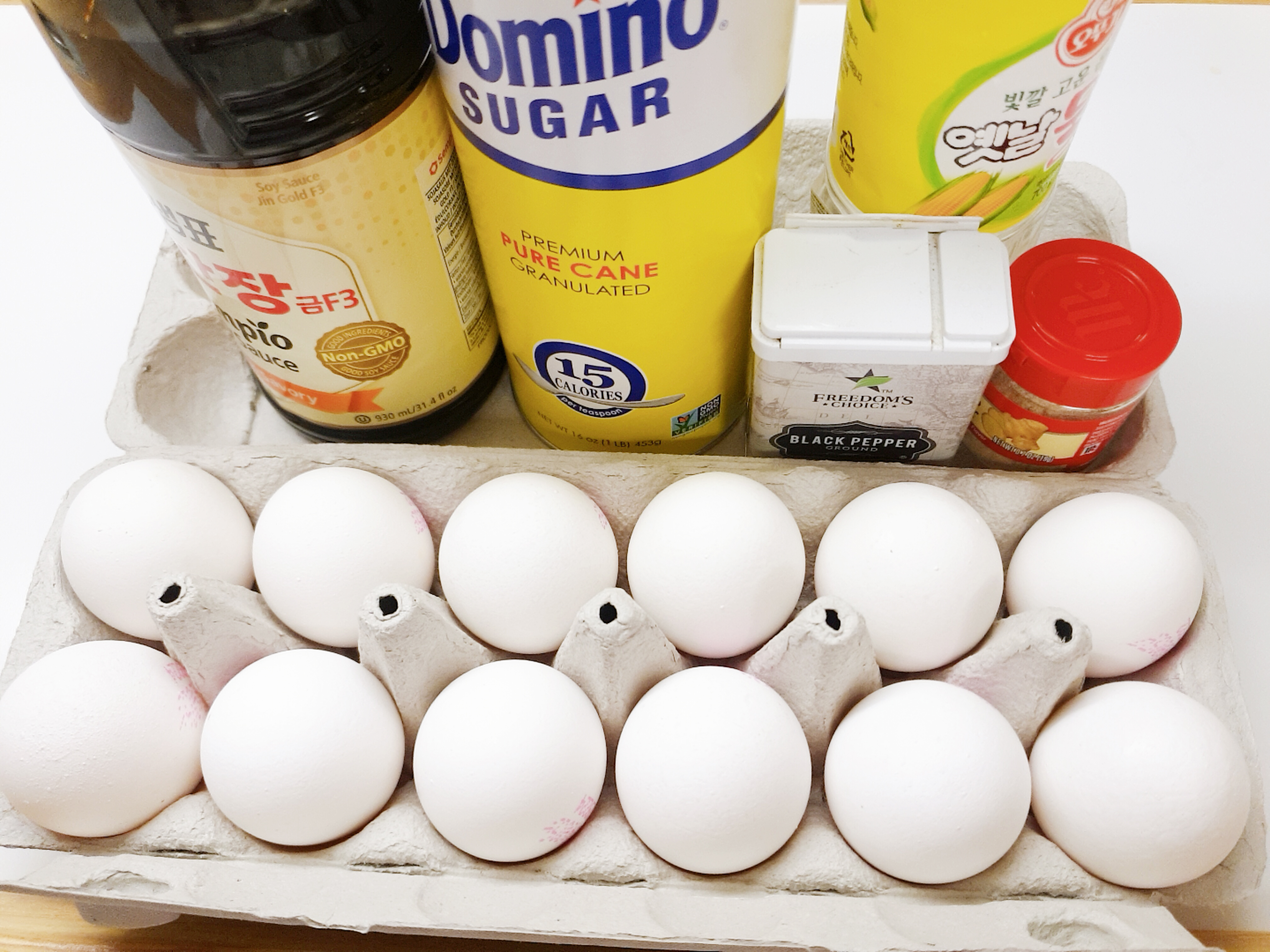 필요한 재료: 계란 10개, 양파 1개, 간장, 설탕, 후추, 올리고당 또는 물엿, 생강 또는 생강가루, 식초 , 물 , 소금, 참기름